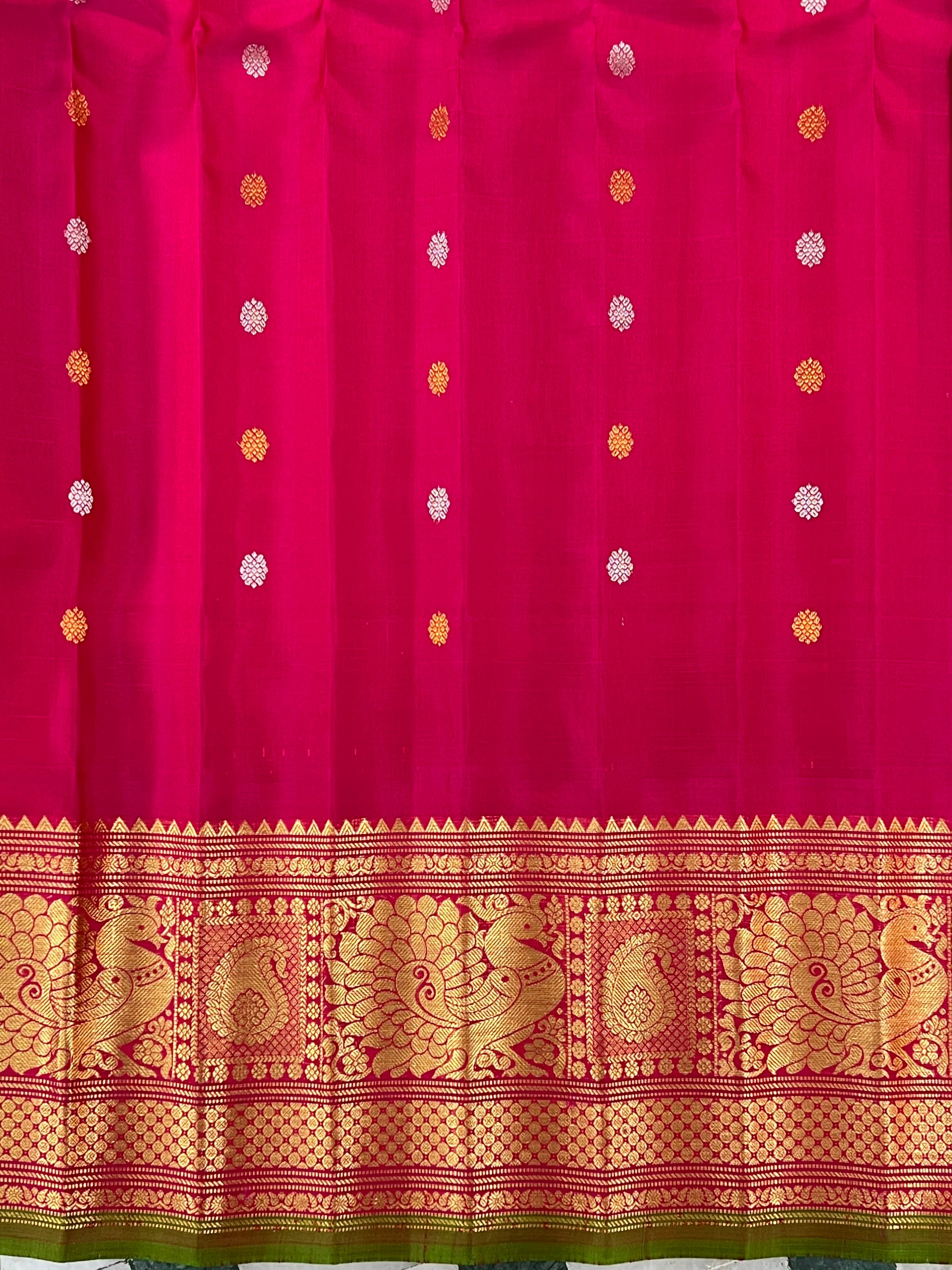 This gorgeous Gadwal Pure Silk Handloom Saree is a perfect blend of tradition and elegance, featuring a Pistachio green body with Thread checks. Delicate floral Gold and Silver zari motifs, adding a touch of grace to the overall look. The lower part of the saree is adorned with a Pink border and Gold zari detailing with green Selvedge, featuring intricate floral and geometric patterns that enhance the luxurious feel, elevating the saree’s appeal. This saree comes with a contrast blouse and it is Silk Mark certified