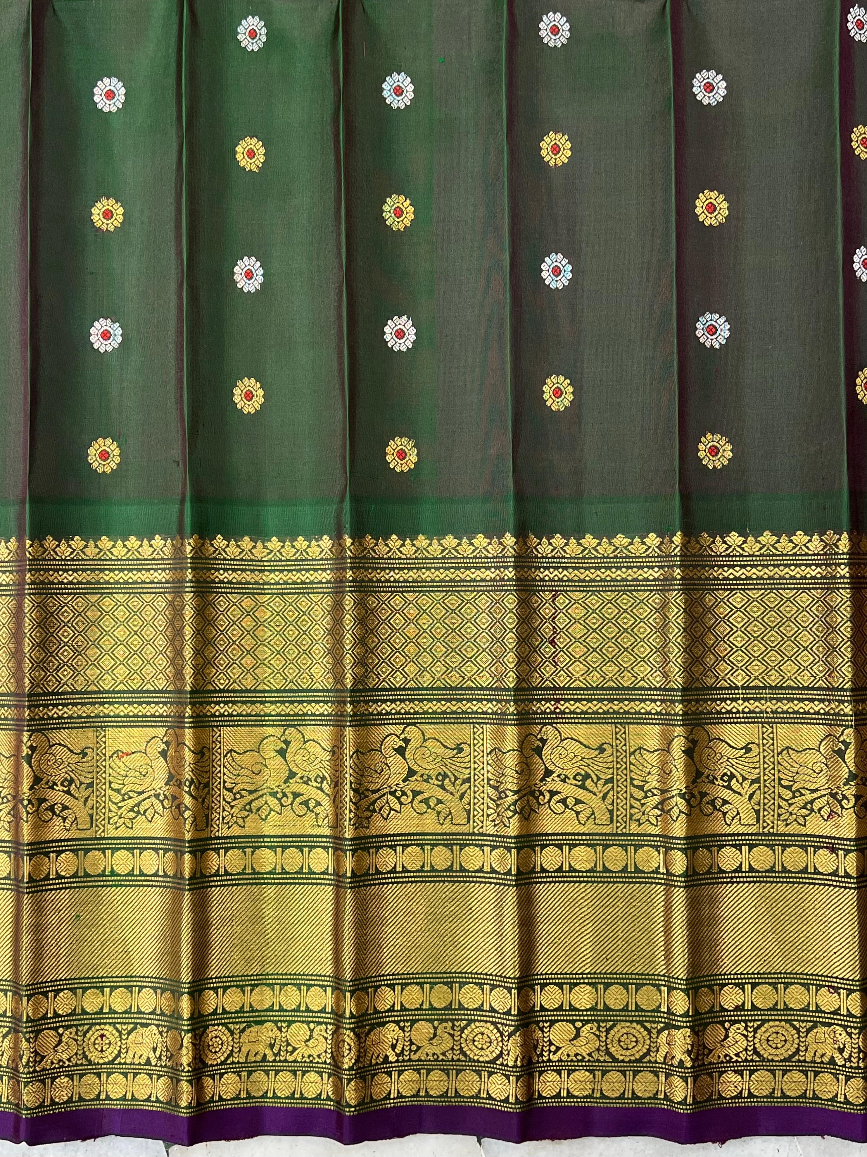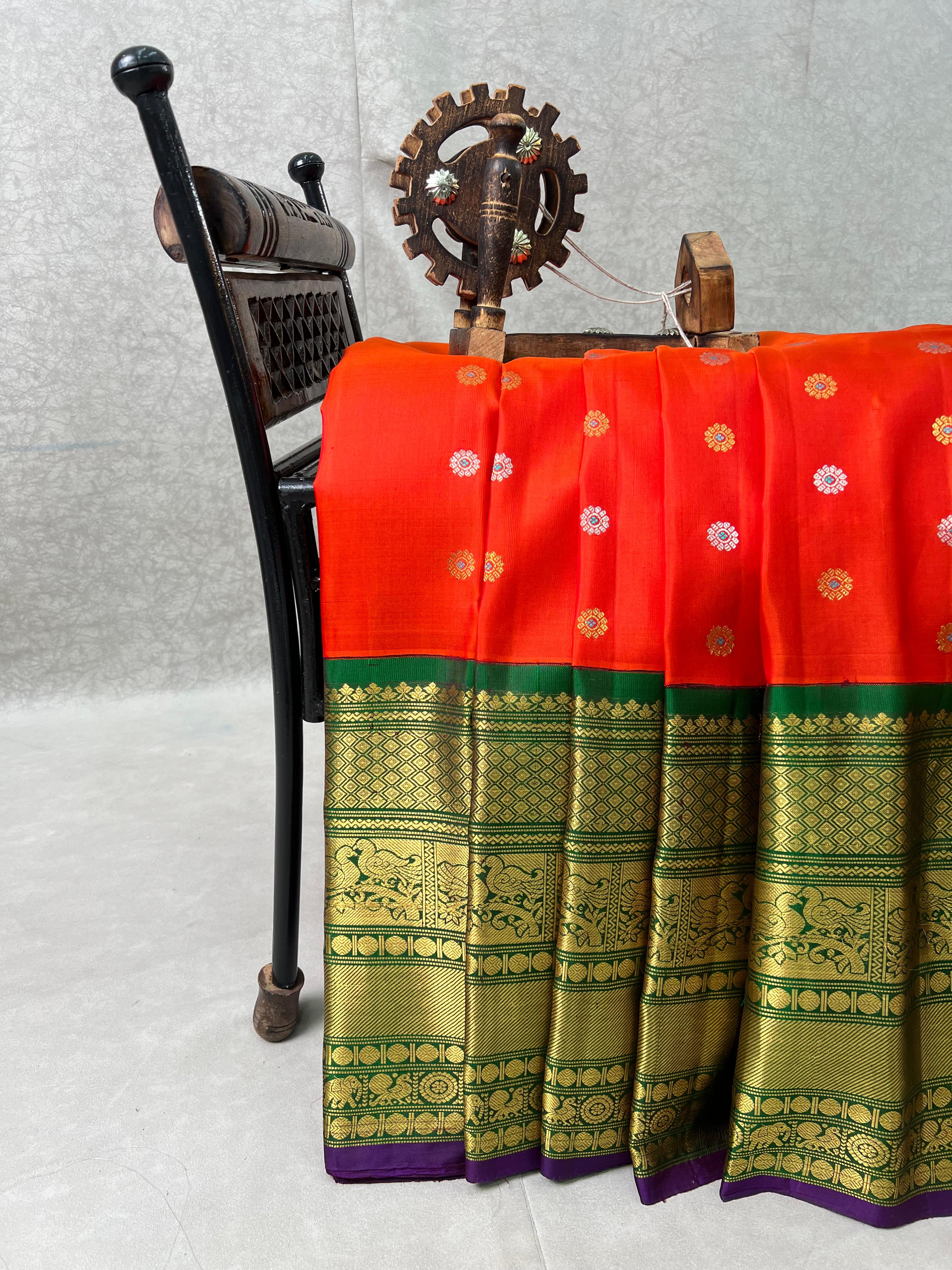 Gadwal Pure Silk Handloom Butta Saree – A regal rich red body adorned with delicate gold & silver meena buttas, complemented by a rich green pallu and border woven with intricate gold zari detailing. The striking purple selvedge adds a bold touch of contrast. Paired with a contrast blouse and certified by Silk Mark, this saree is a true blend of tradition and elegance.