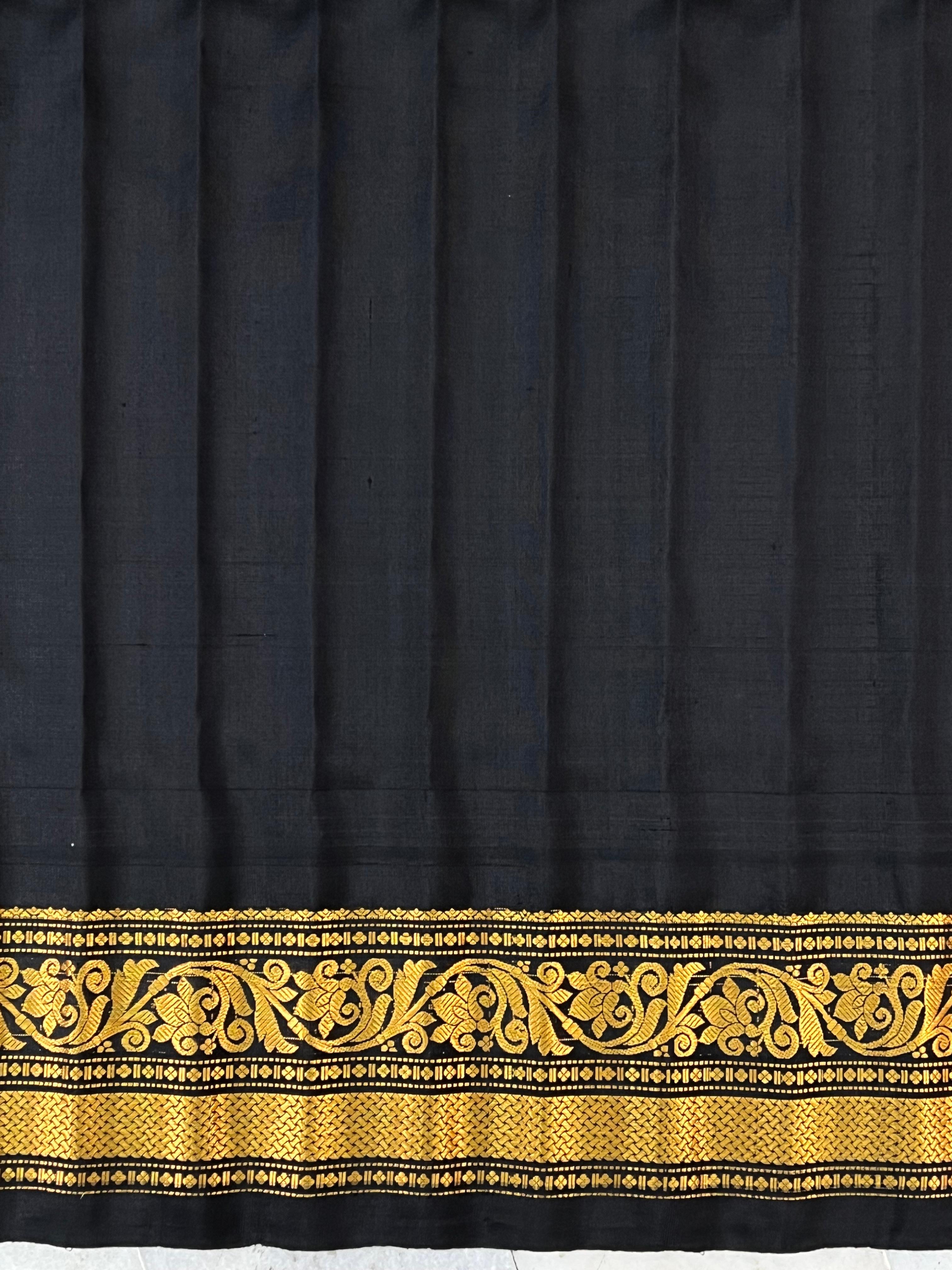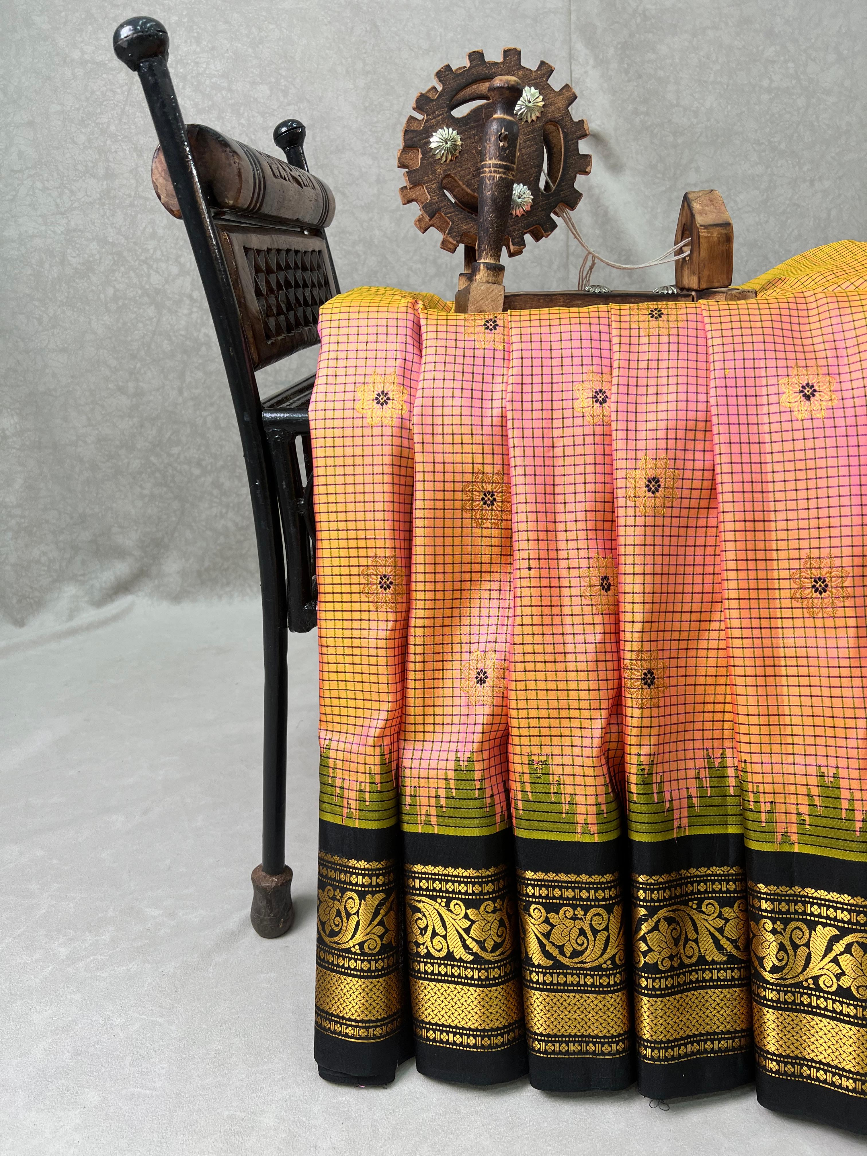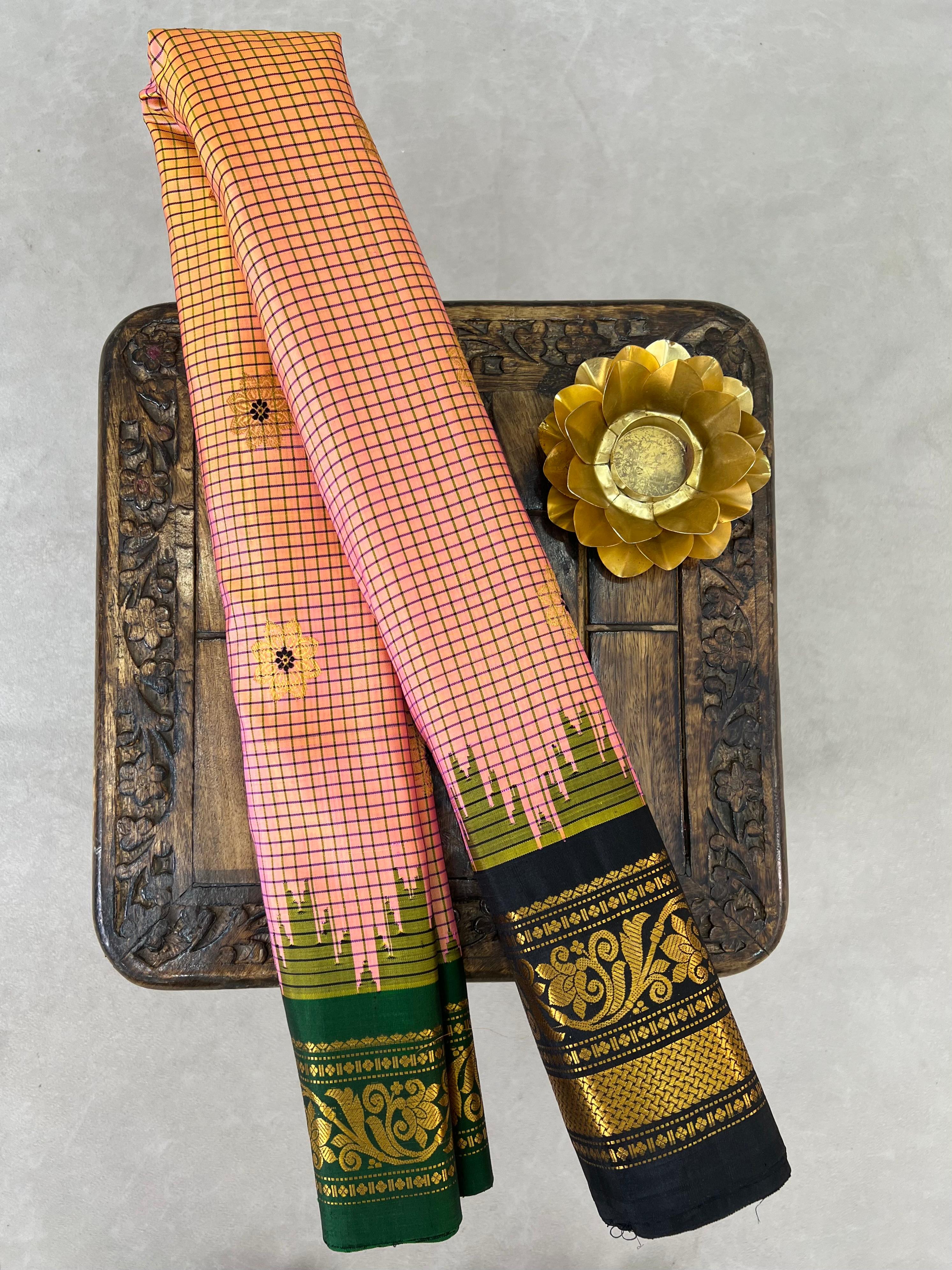 This exquisite Gadwal Pure Silk Handloom Saree showcases timeless elegance with a rich peach body, adorned with delicate checks and gold zari meena buttas spread evenly across the fabric. The highlight of this masterpiece is its stunning Ganga Jamuna border, featuring contrasting green and black borders—each embellished with intricate  temple motifs and gold zari floral patterns. Woven by skilled artisans, this saree embodies the grace of traditional handloom weaving, perfect for weddings, festivals, and grand occasions. Comes with a contrast blouse, and is Silk Mark certified for authenticity.
