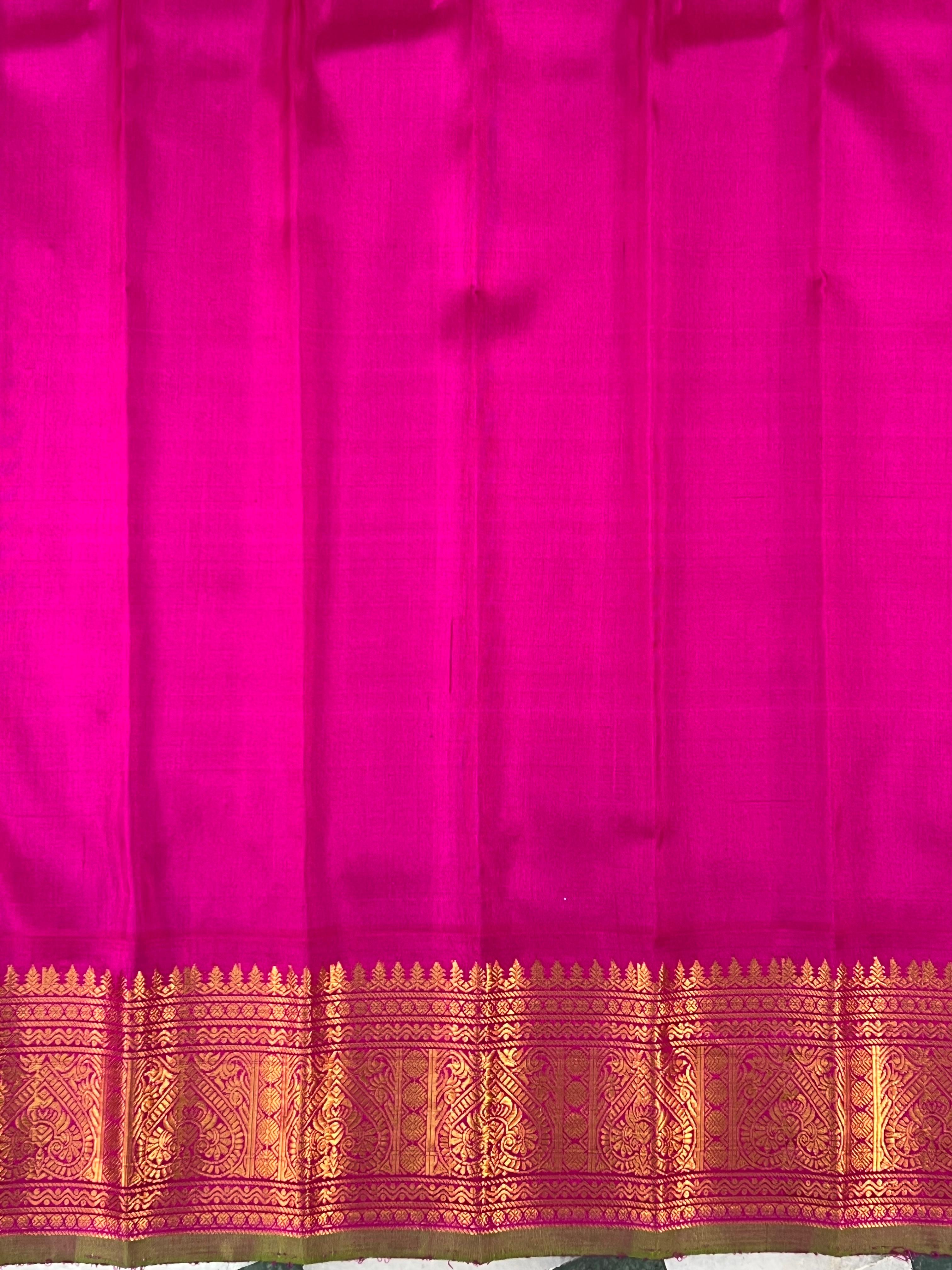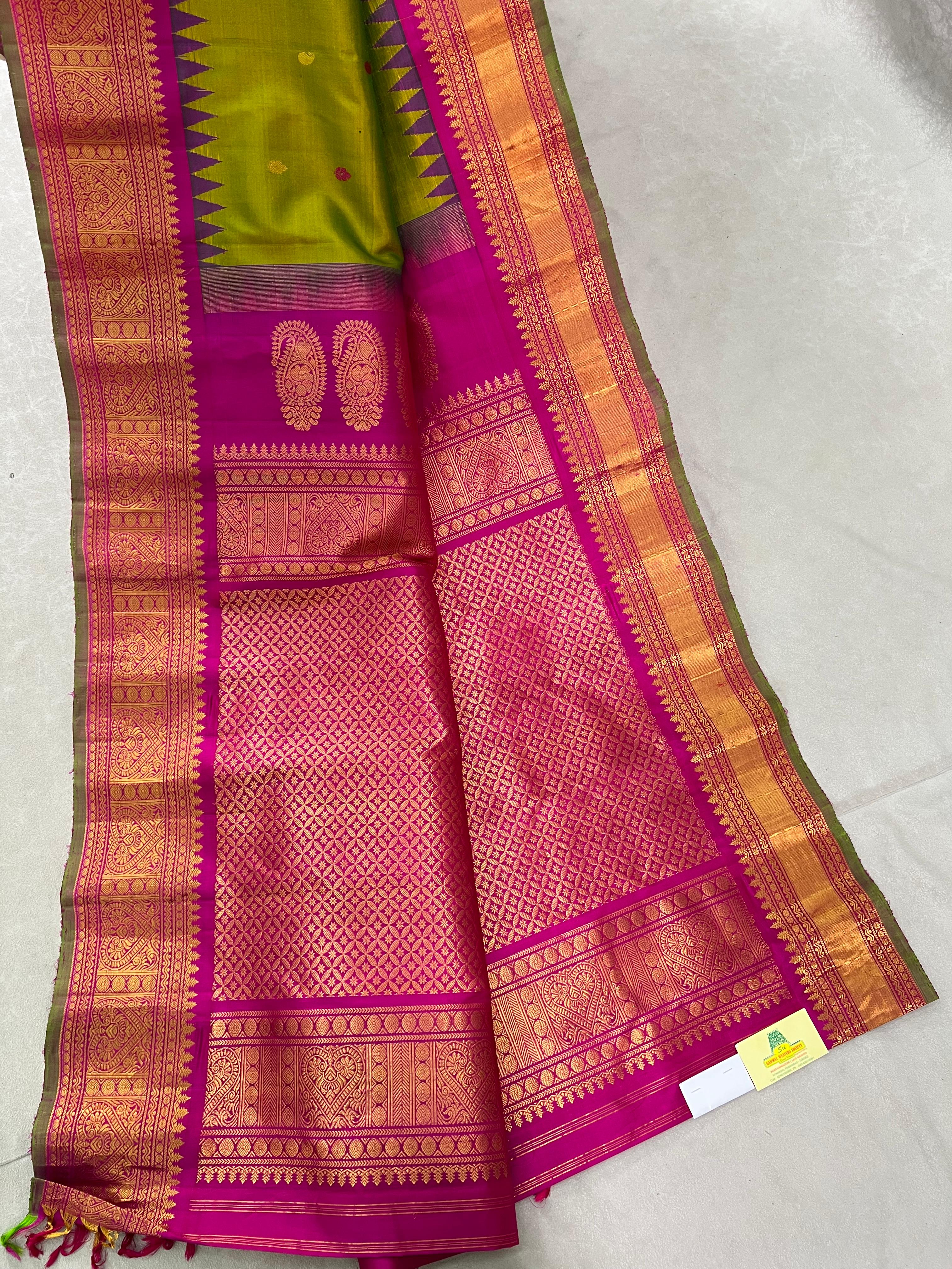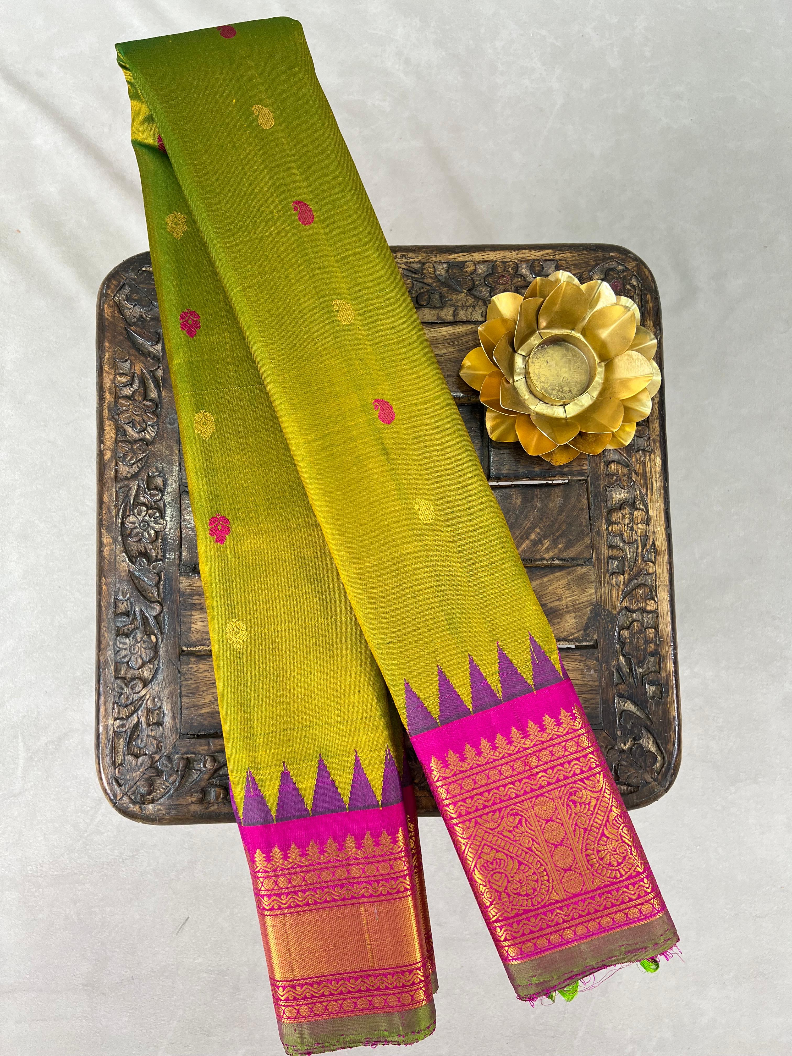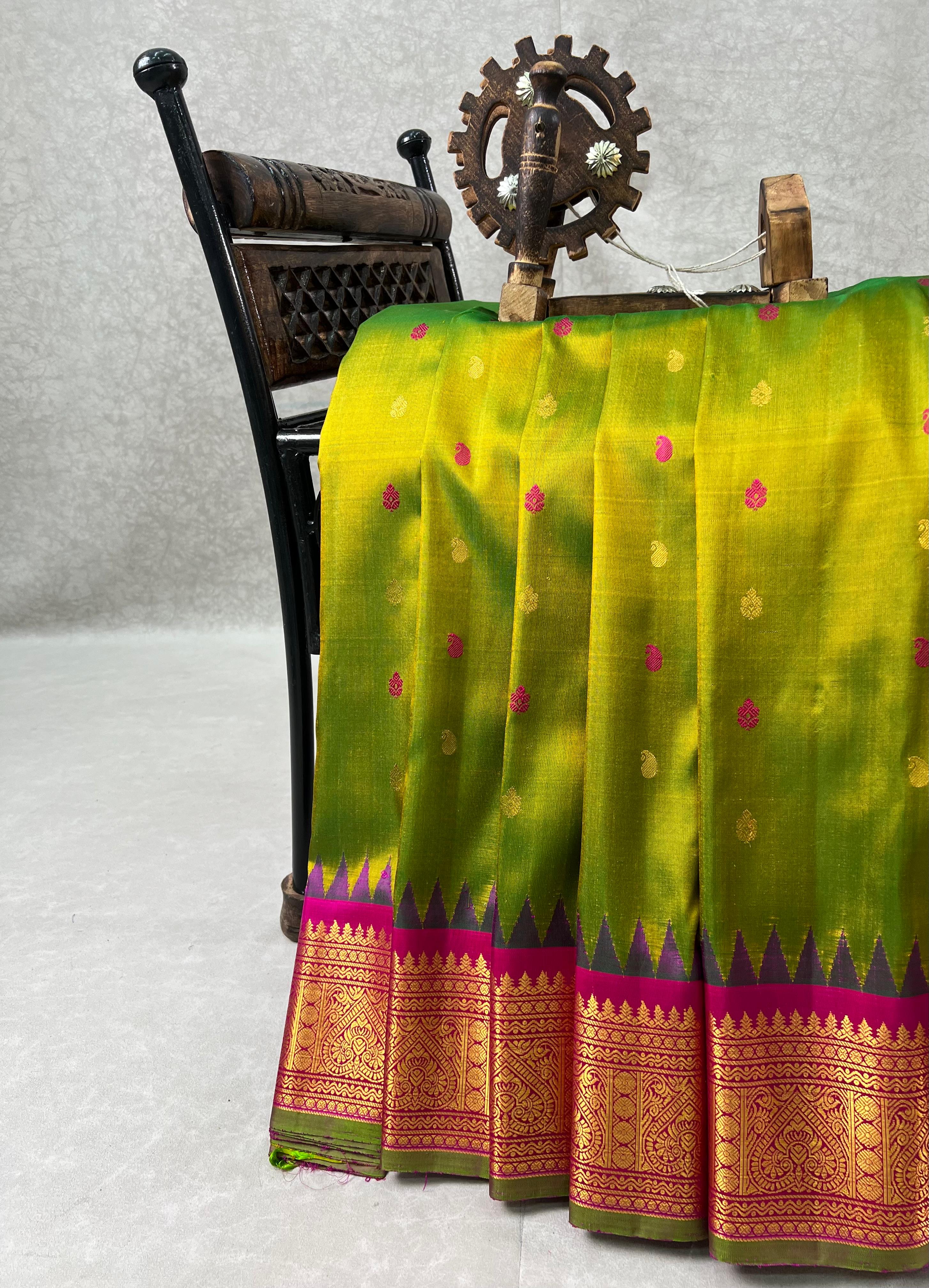 This elegant Gadwal Pure Silk Handloom Saree exudes vintage charm with its timeless dualshade green body adorned with subtle gold and pink buttas. The striking pink temple border with rich golden zari detailing with green edge adds a touch of royal grandeur. Perfect for festive and traditional occasions, this saree beautifully blends heritage craftsmanship with understated sophistication. Pair with contrast blouse, and is Silk Mark certified for authenticity.