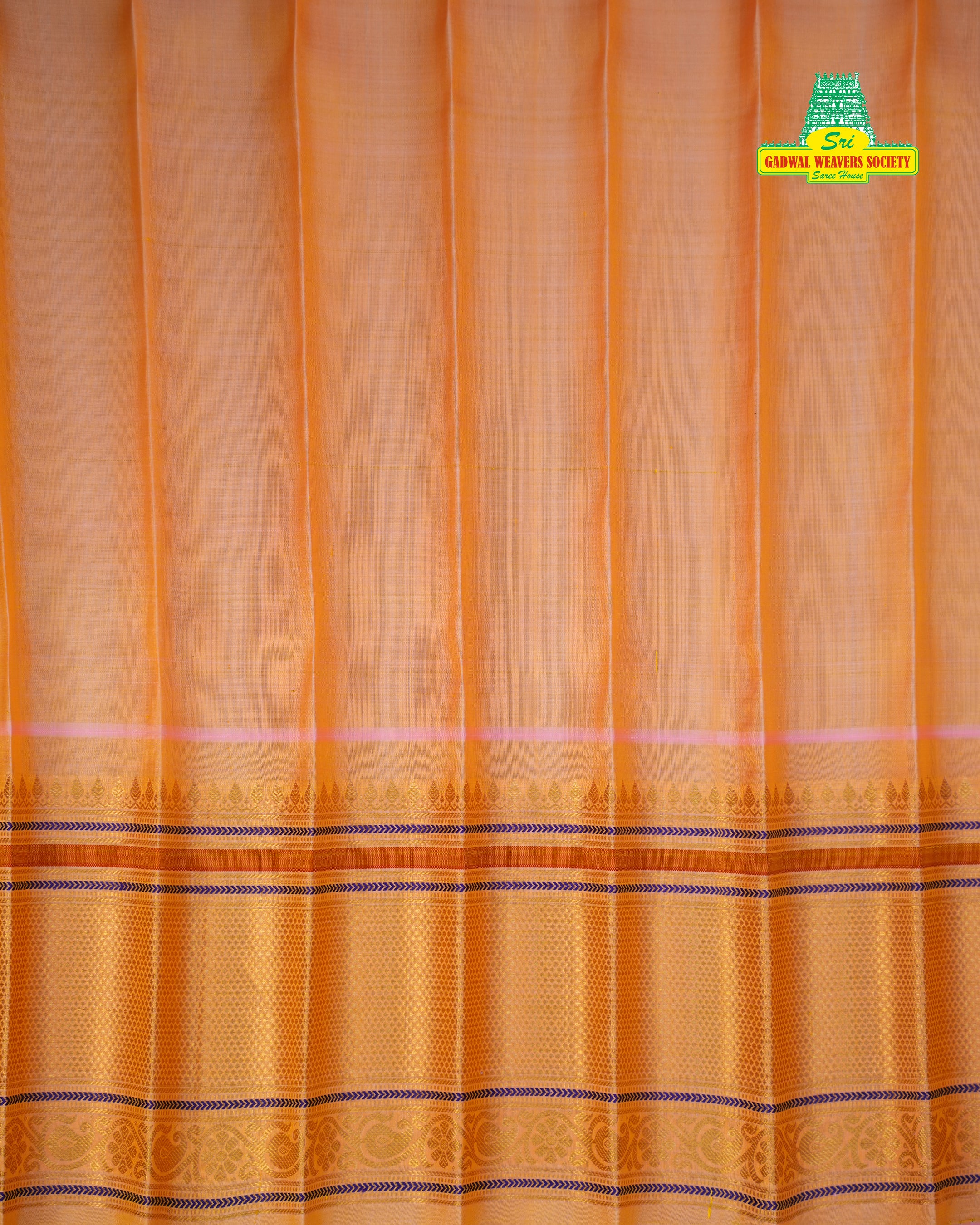 This elegant Gadwal Handloom Silk Saree features a serene lavender body adorned with large intricate zari buttas, adding a royal touch to its subtle charm. The rich golden-orange zari border and pallu highlight the traditional craftsmanship of Gadwal weaving. Perfect for festive occasions and celebrations, this saree beautifully blends grace and grandeur in every drape. Pair with contrast blouse, and is Silk Mark certified for authenticity.