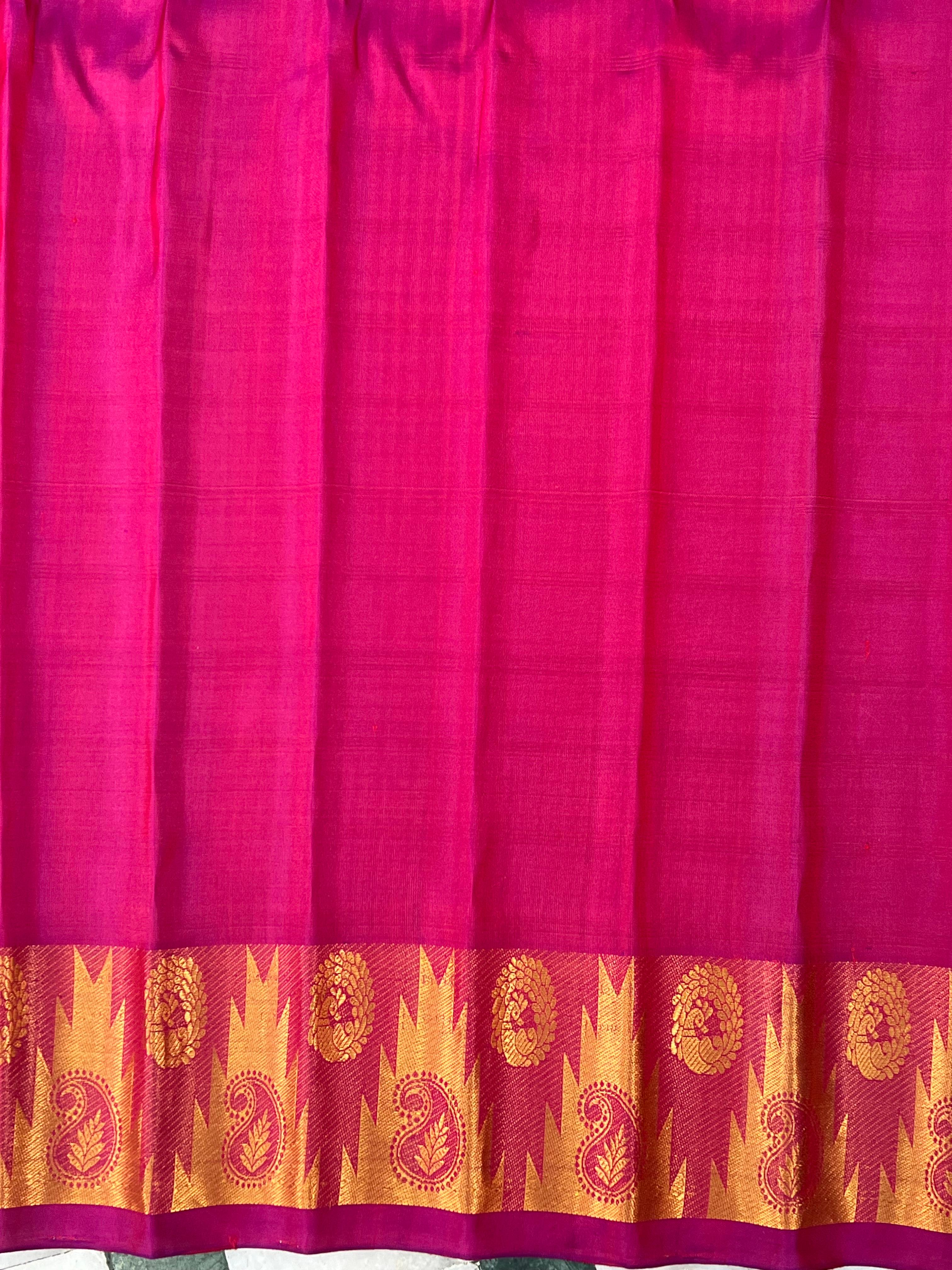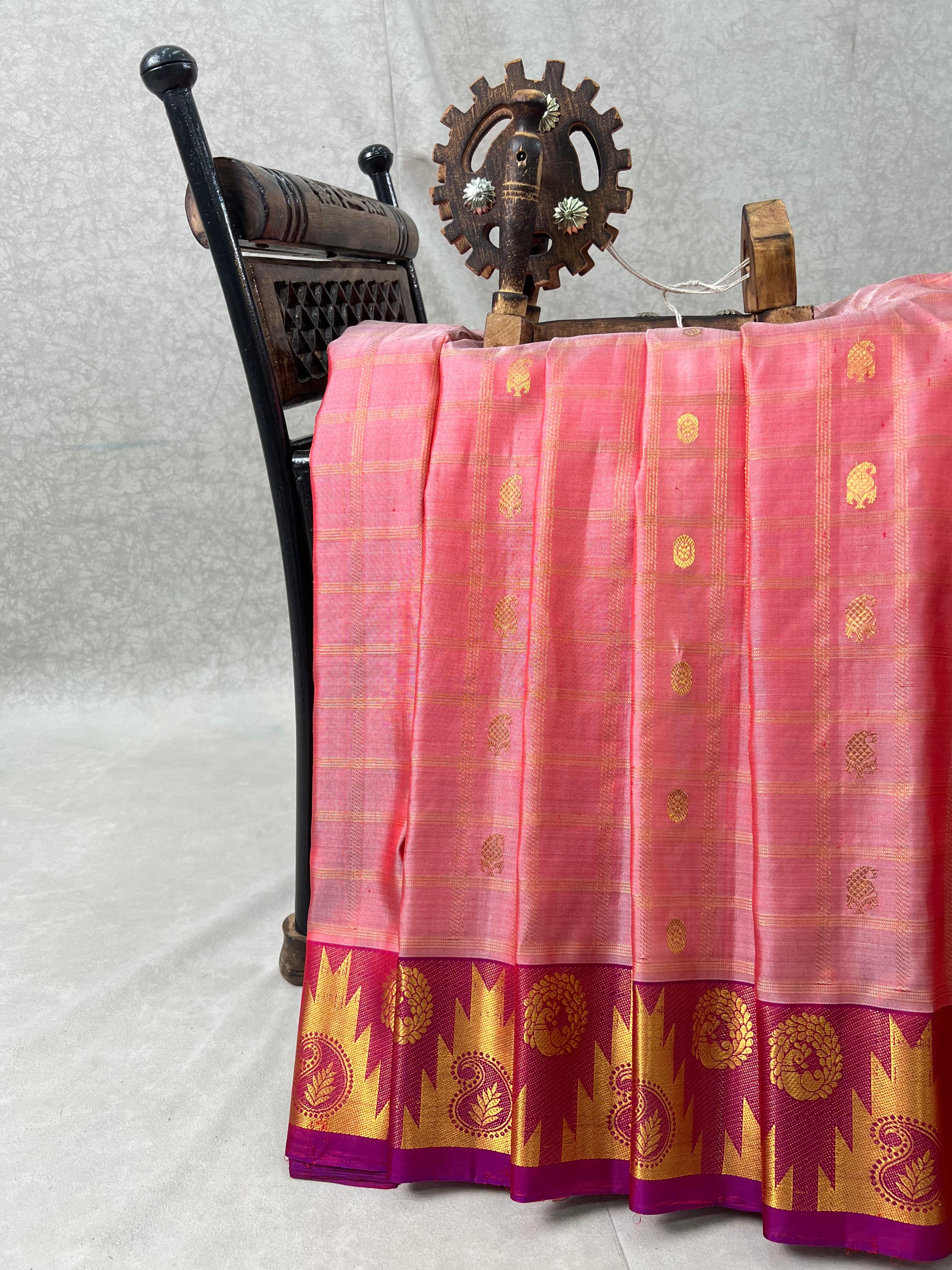 This exquisite Gadwal Pure Silk Saree features a rich onion pink colour body adorned with delicate checks and small zari buttas, exuding timeless elegance. The highlight of the saree is its magenta golden temple zari border. Perfect for festive and traditional occasions, this saree reflects the classic craftsmanship and royal charm of Gadwal handlooms. Pair with contrast blouse, and is Silk Mark certified for authenticity.