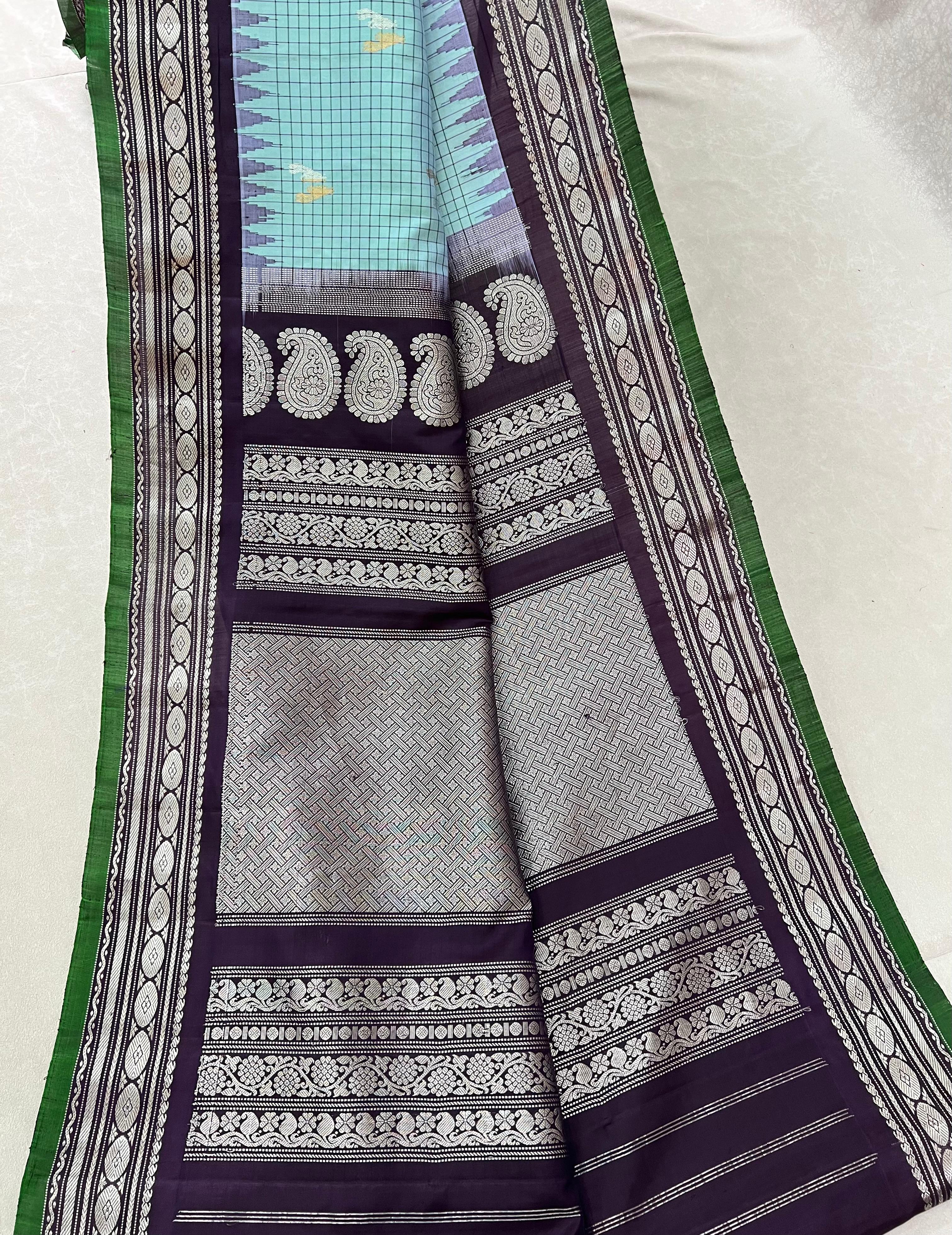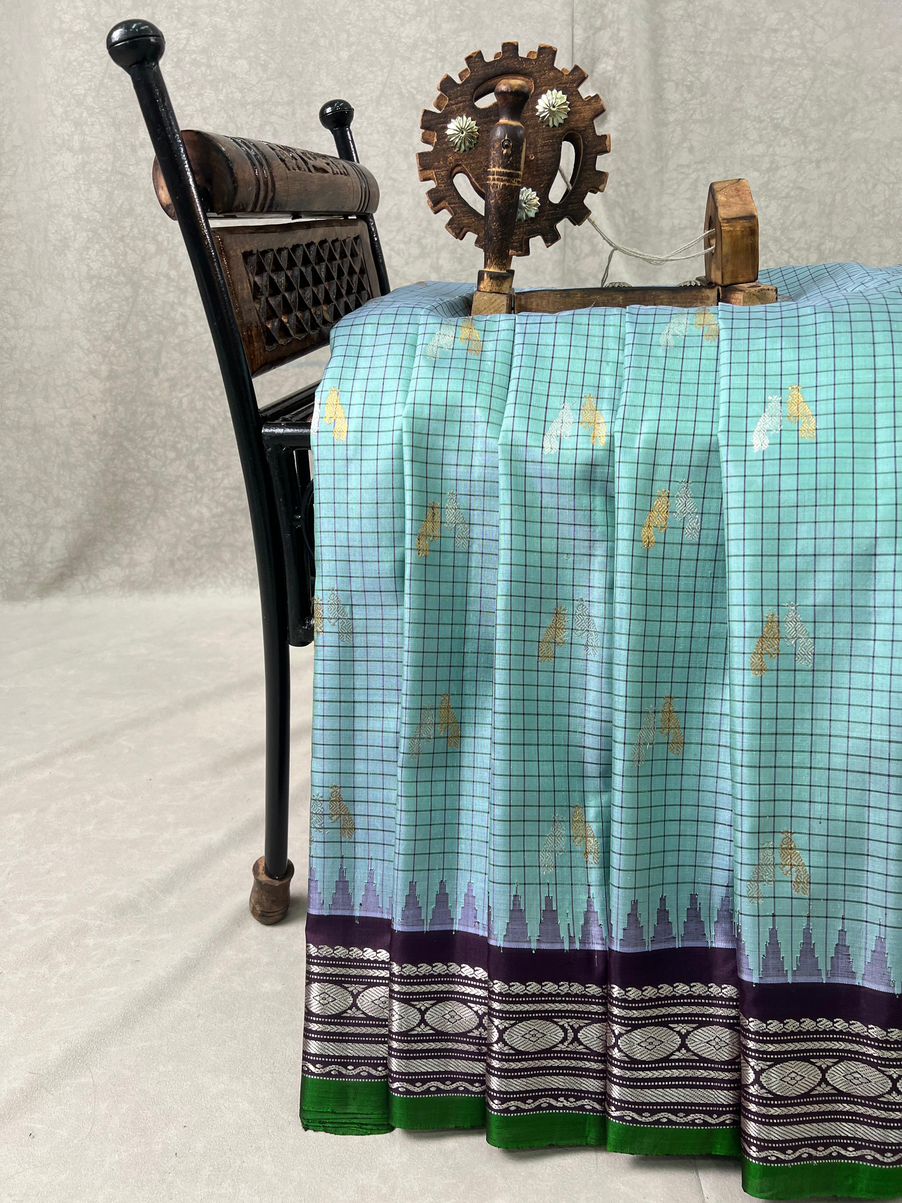 This Gadwal Pure Silk Handloom Saree comes in a soft light blue body adorned with elegant checks, exuding subtle sophistication. The saree is beautifully contrasted with a brown zari border featuring intricate temple motifs and a touch of green edging, adding a vibrant yet classy finish. A perfect blend of tradition and modern charm, this saree is a stunning example of Gadwal craftsmanship and timeless elegance. Pair with contrast blouse, and is Silk Mark certified for authenticity.