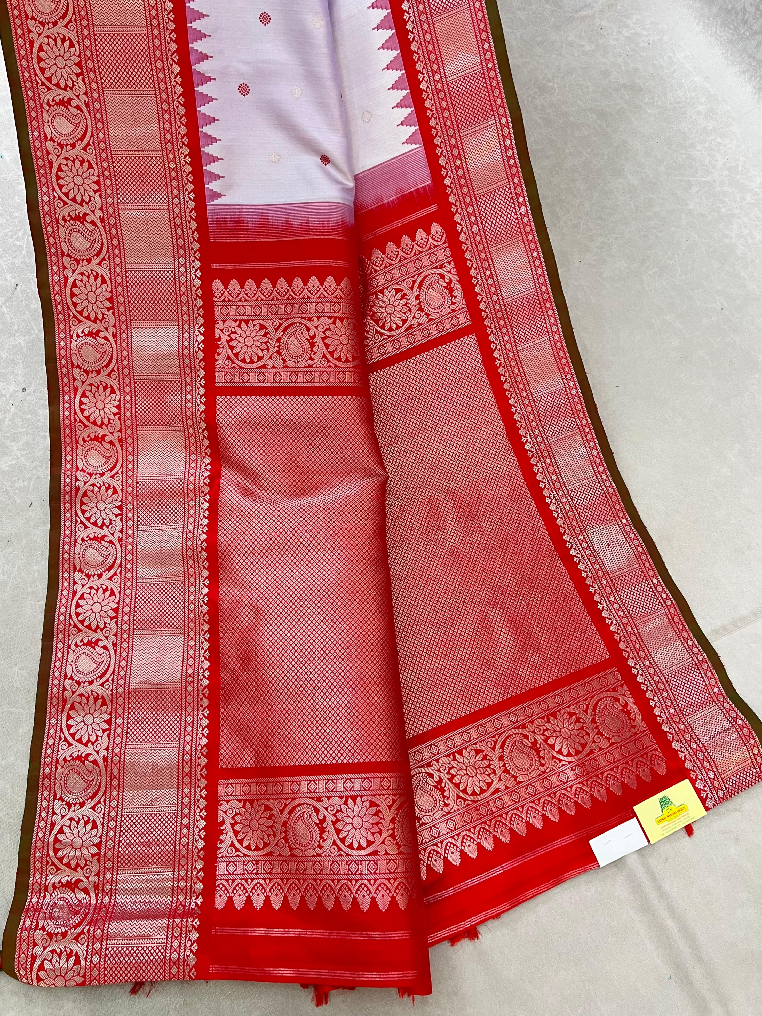 This elegant Gadwal Pure Silk Handloom Saree exudes with its timeless Ice blue body adorned with subtle Silver and thread buttas. The striking rich Red border with rich Silver zari detailing and comes with green Selvedge, adds a touch of royal grandeur. Perfect for festive and traditional occasions, this saree beautifully blends heritage craftsmanship with understated sophistication. Pair with contrast blouse, and is Silk Mark certified for authenticity.
