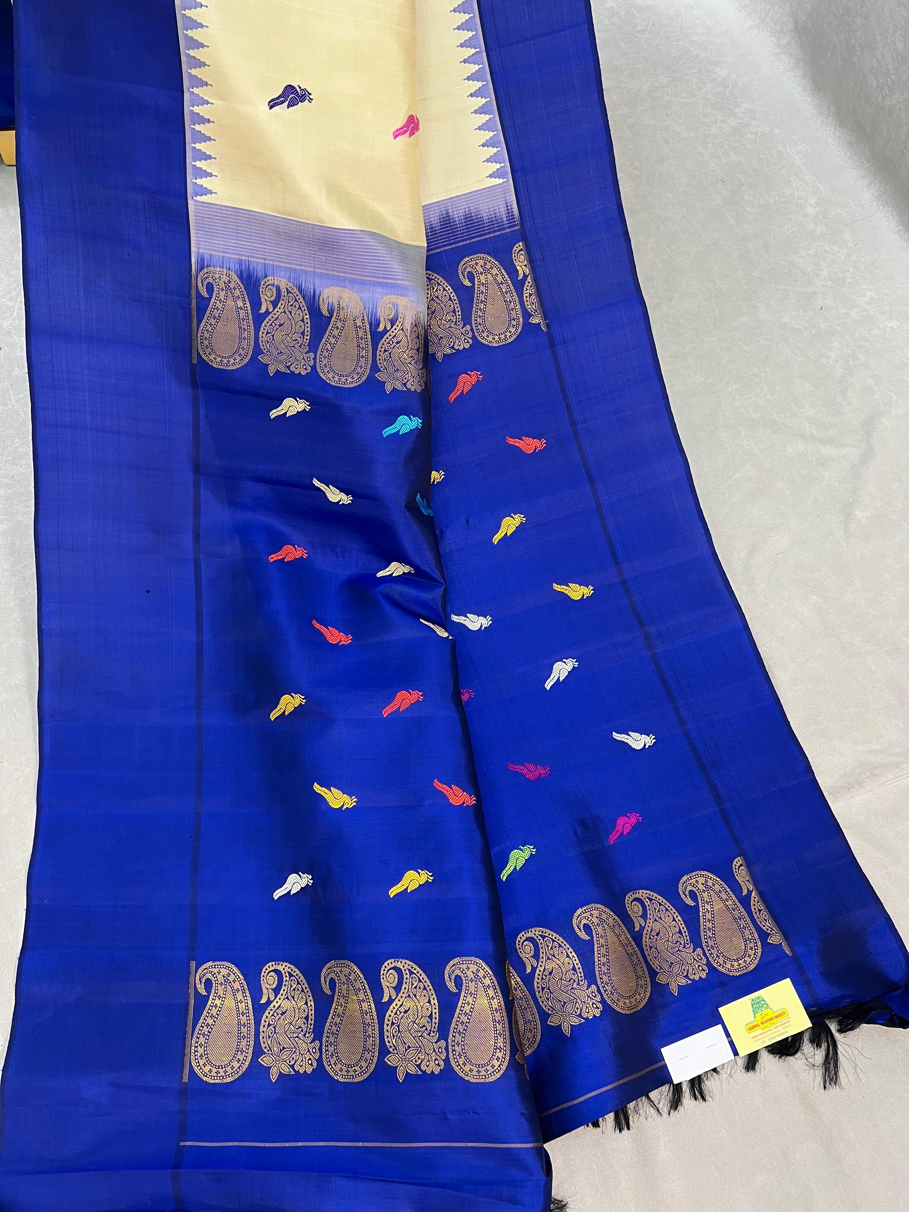 This elegant Gadwal Pure Silk Handloom Saree features a graceful Beige body that radiates softness and charm, beautifully adorned with vibrant multicolor parrot motifs woven across the fabric, adding a lively and artistic appeal. The saree is enhanced with a contrasting Royal blue border designed with subtle temple (gopuram) patterns, symbolizing heritage and tradition, making this saree a perfect choice for festive gatherings, traditional occasions, and elegant celebrations. Lightweight, lustrous, and finely woven, This saree comes with Contrast blouse and is Silk mark certified.
