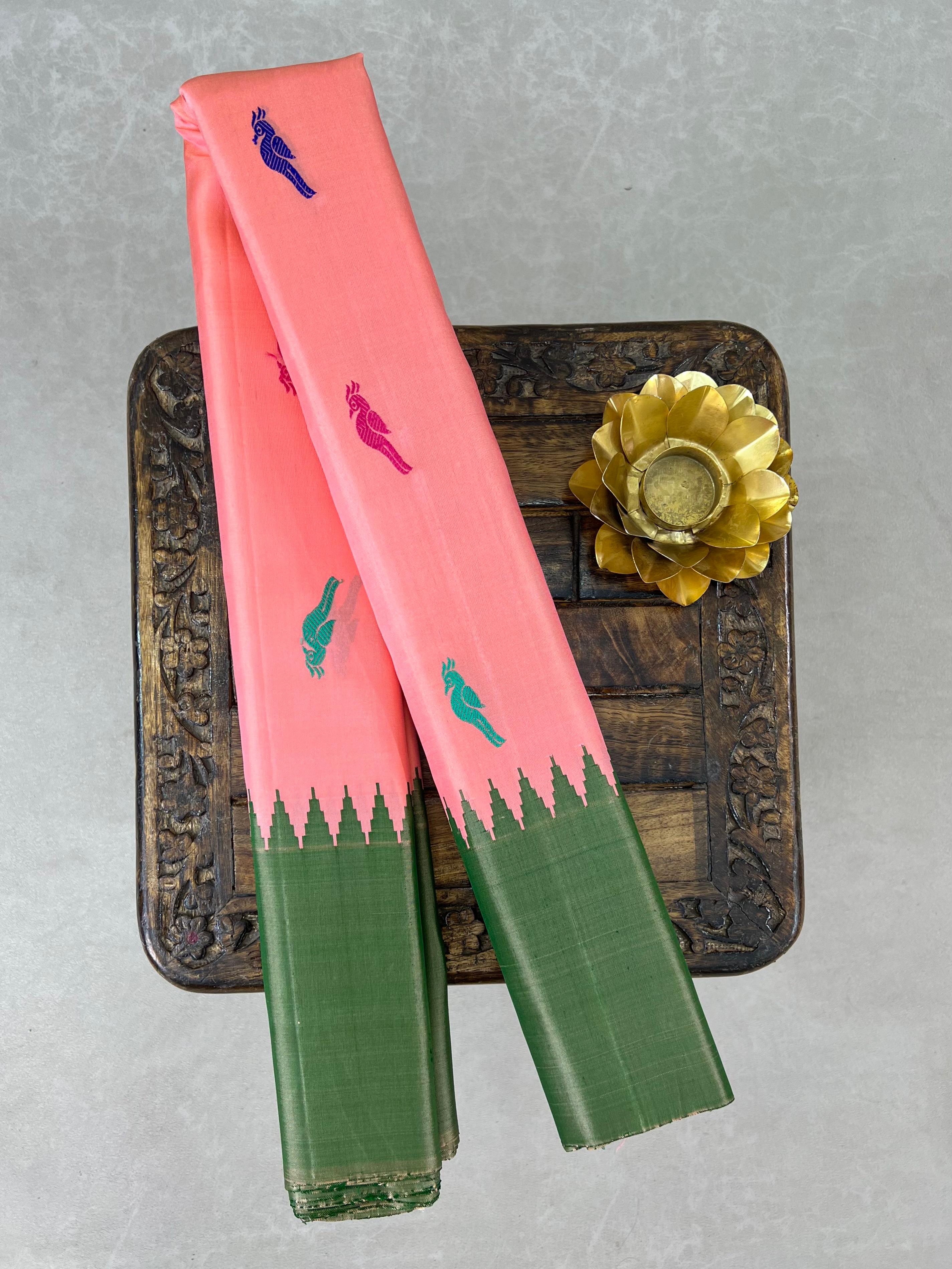 This elegant Gadwal Pure Silk Handloom Saree features a graceful Peach pink body that radiates softness and charm, beautifully adorned with vibrant multicolor parrot motifs woven across the fabric, adding a lively and artistic appeal. The saree is enhanced with a contrasting Olive green border designed with subtle temple (gopuram) patterns, symbolizing heritage and tradition, making this saree a perfect choice for festive gatherings, traditional occasions, and elegant celebrations. Lightweight, lustrous, and finely woven, This saree comes with Contrast blouse and is Silk mark certified.