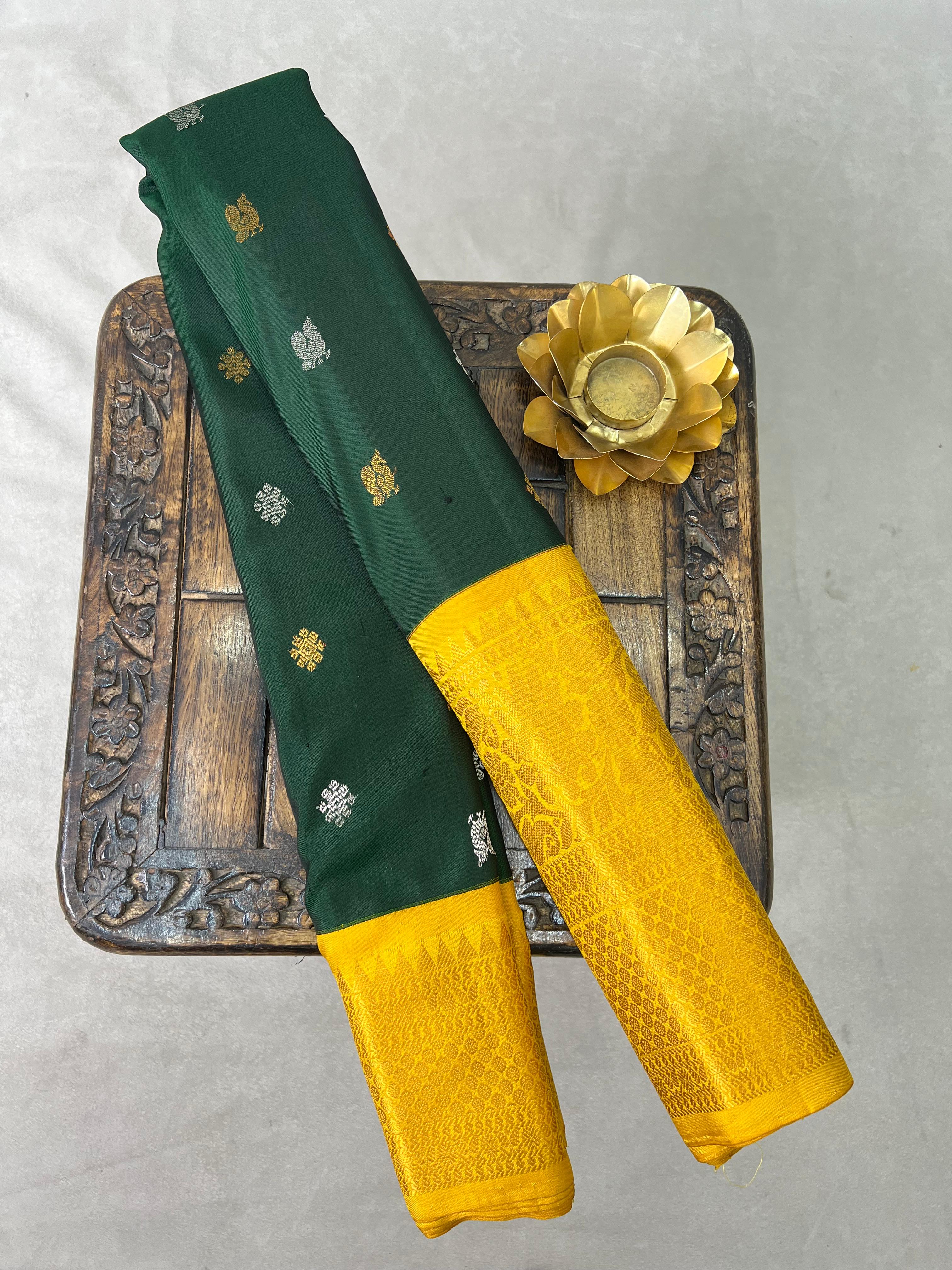 Grace your wardrobe with this stunning Gadwal Pure Silk Saree, featuring a bottle green colour body embellished with gold and silver buttas. The yellow kuttu border with intricate rich golden zari work, making it an ideal choice for traditional celebrations and festive gatherings. Pair with contrast blouse, and is Silk Mark certified for authenticity.