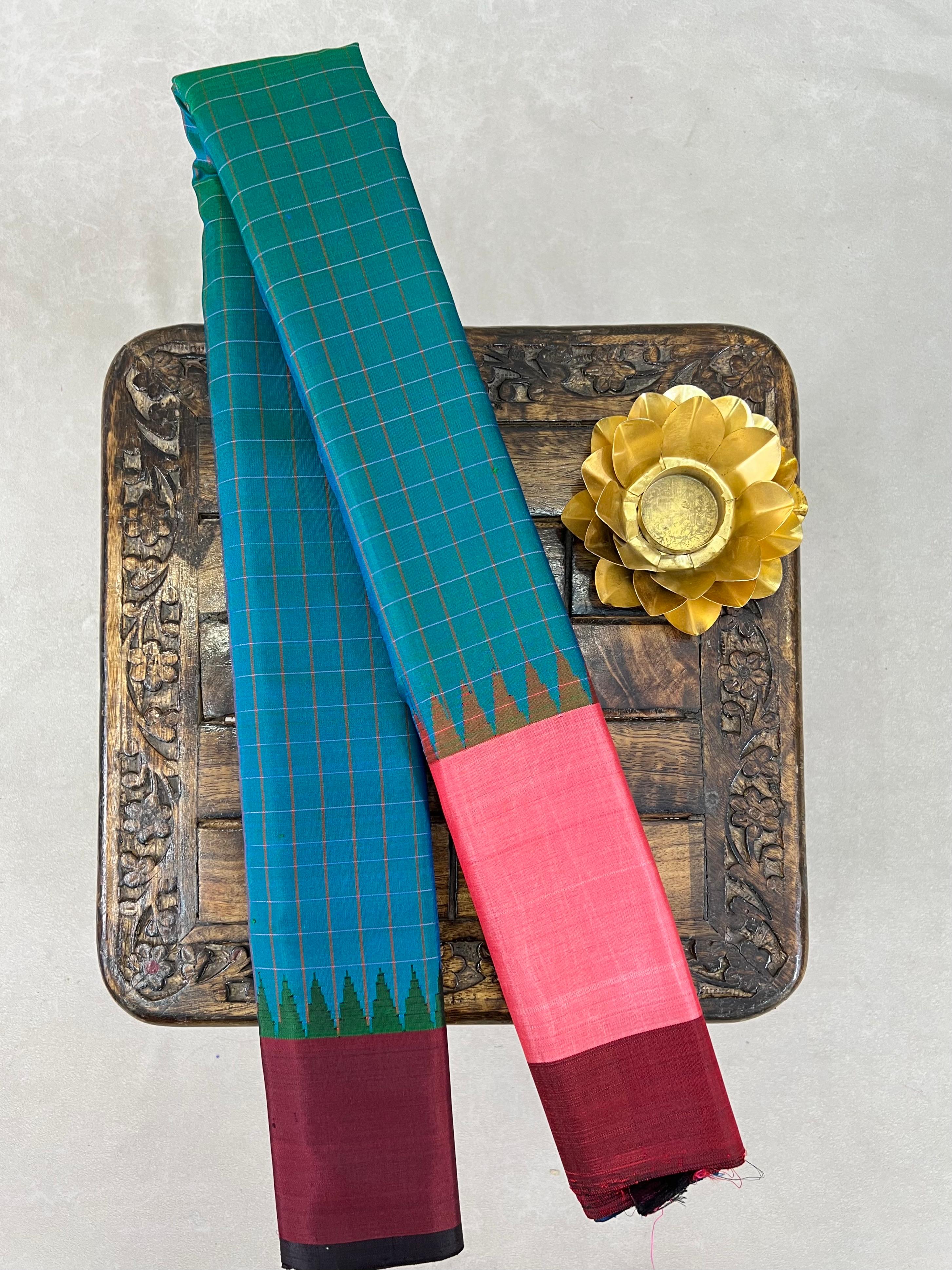 This is a Gadwal Pure Silk Plain Border Handloom Saree, featuring a Peacock Green body with subtle Checks patterns with Golden zari, beautifully contrasted by a plain Ganga-Jamuna in onion shade-Maroon border. The classic color combination and fine handloom weave make it a timeless piece, perfect for traditional occasions and festive celebrations. Pair with contrast blouse, and is Silk Mark certified for authenticity.