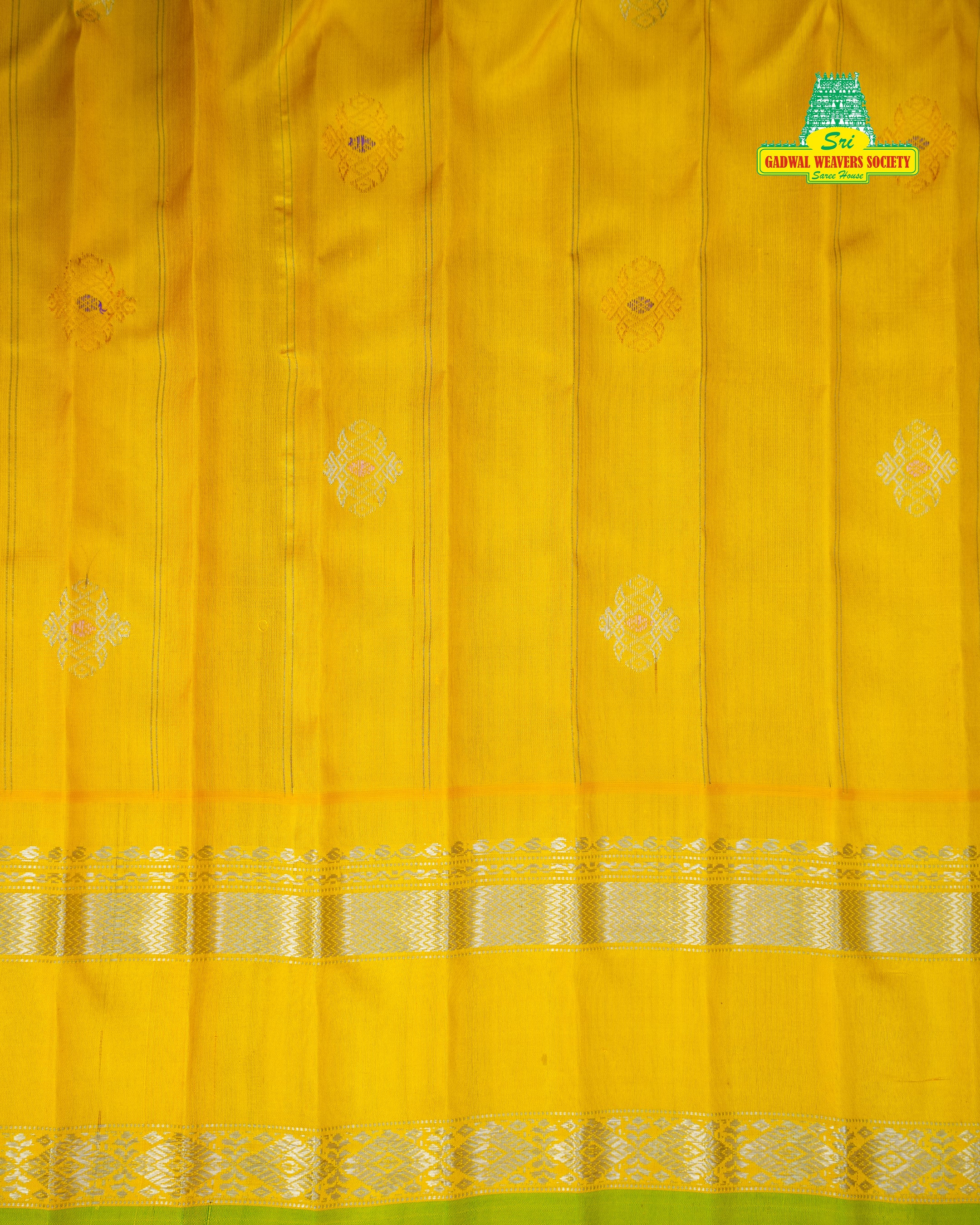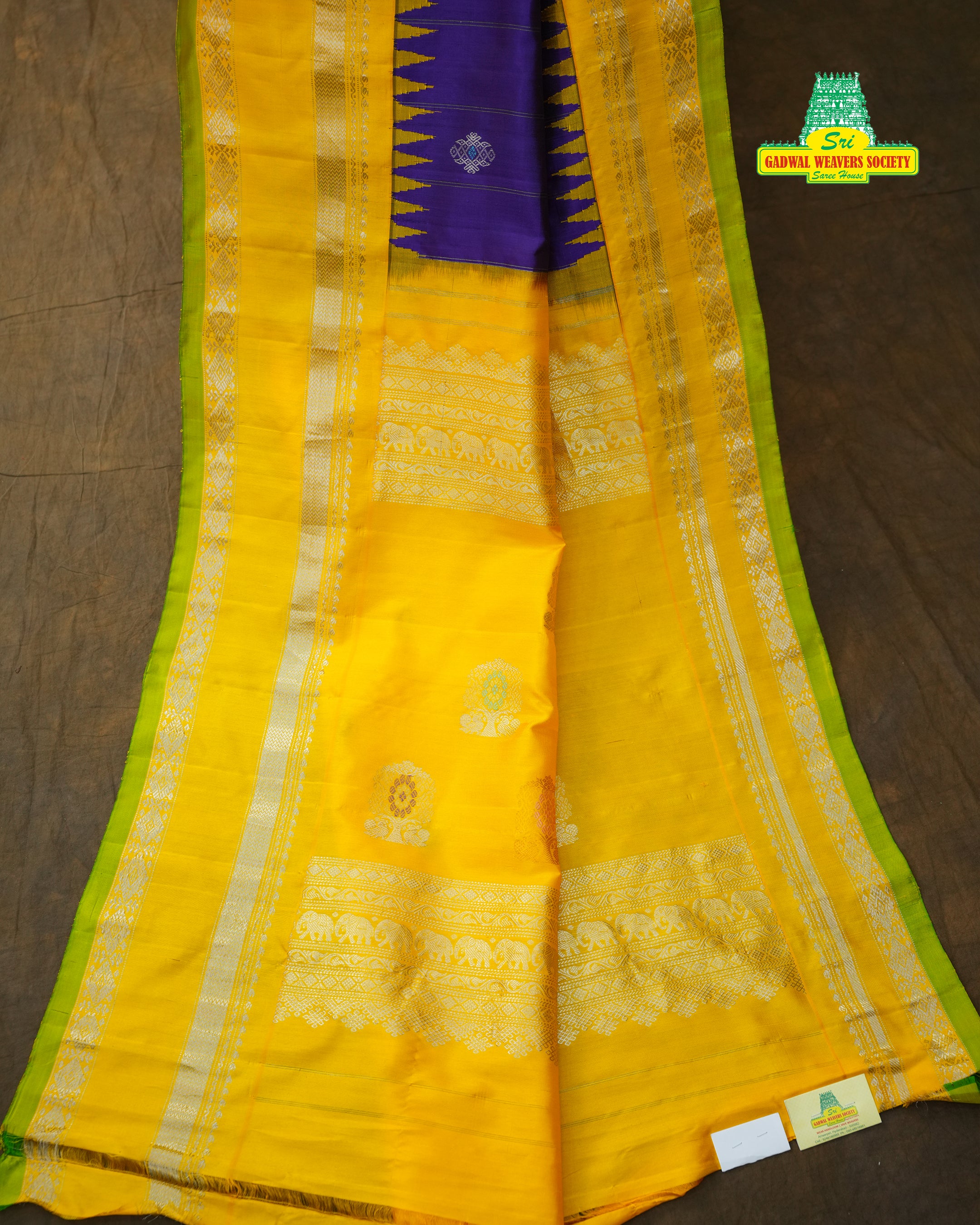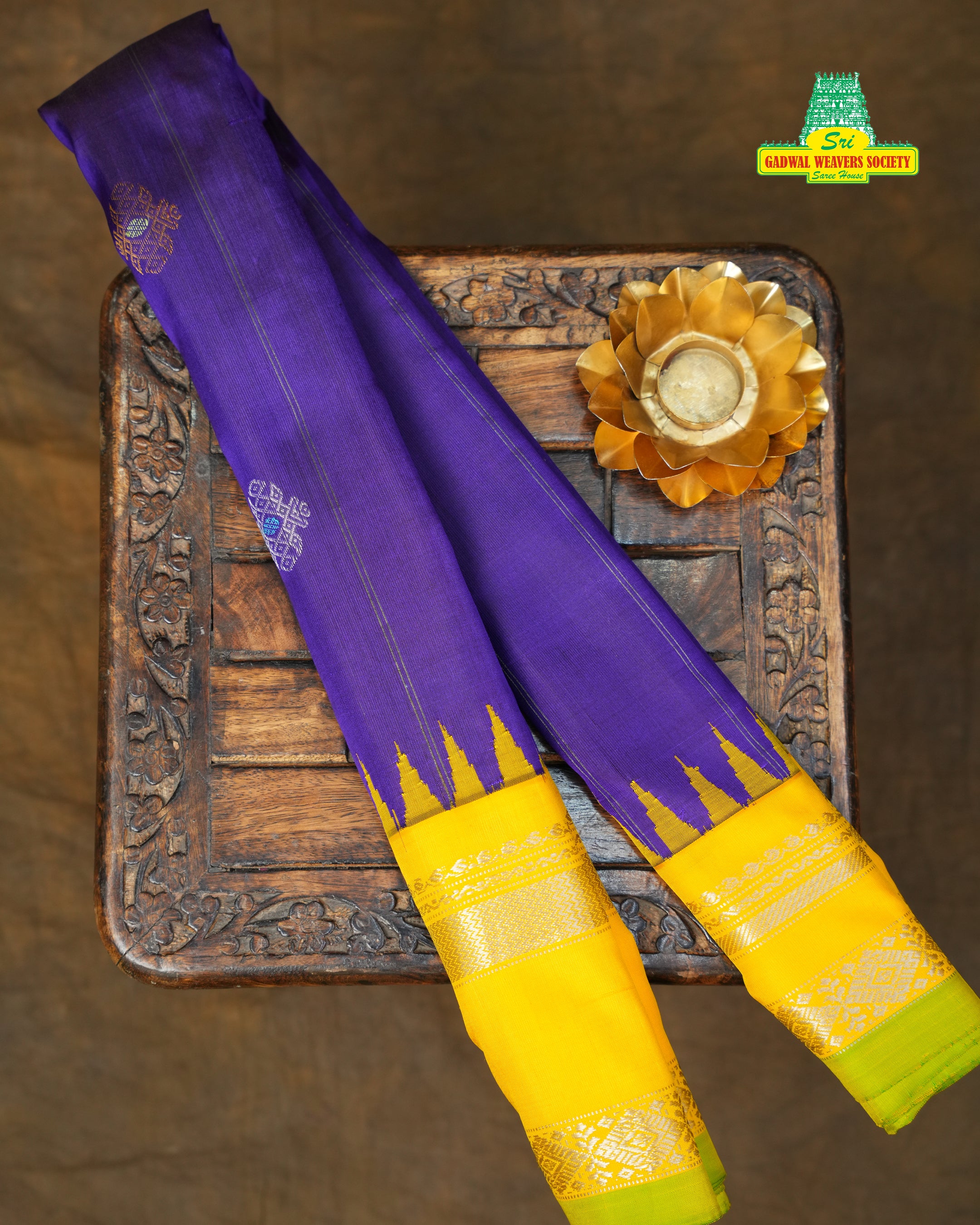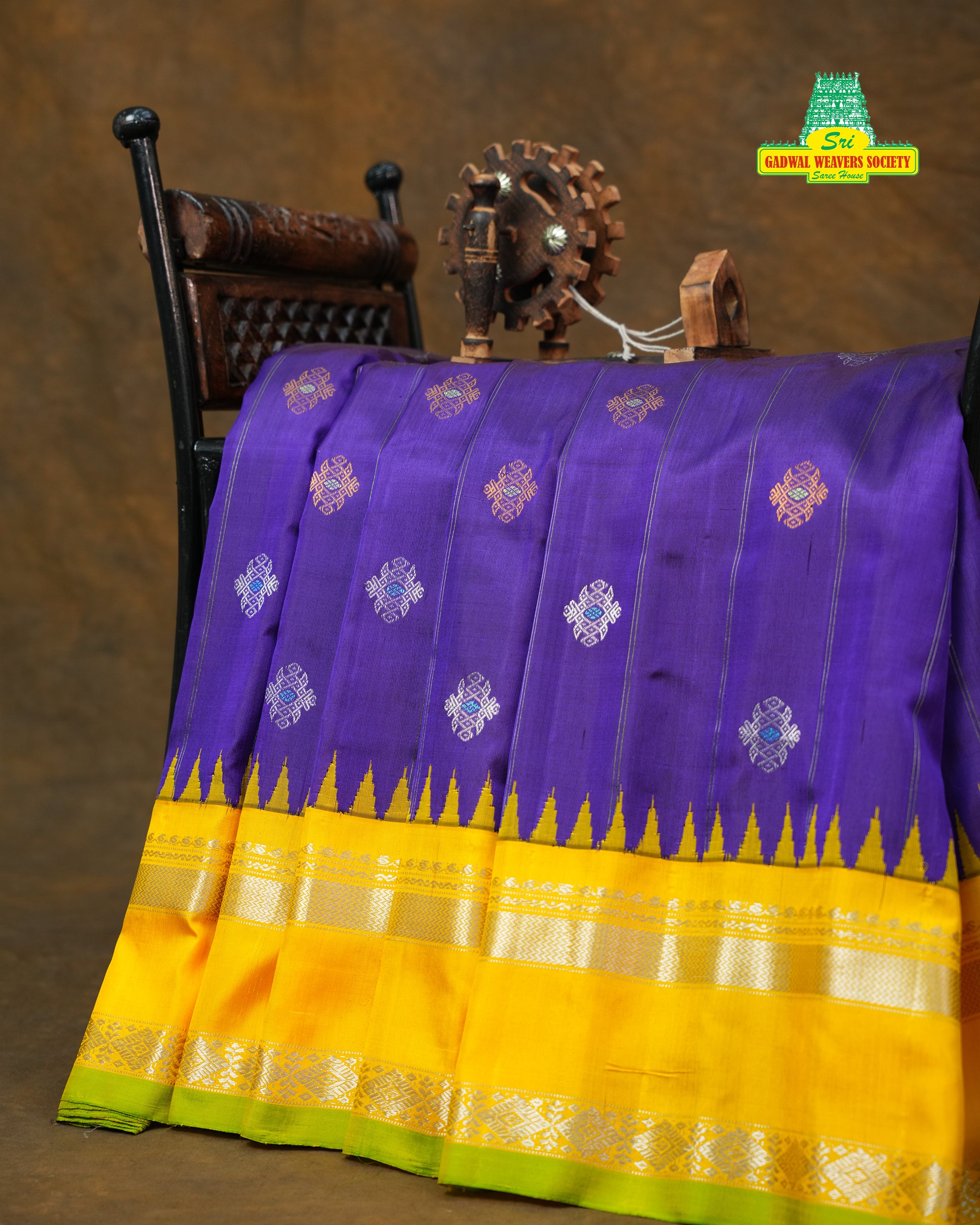 This elegant Gadwal pure silk saree comes in a graceful violet body with gold and silver kolam meena buttas and zari stripes. The yellow gap border is adorned with intricate silver zari weaving with green selvedge, adding a touch of richness and tradition. A perfect blend of subtle charm and regal elegance, this handloom masterpiece is ideal for festive and special occasions. Comes with contrast blouse, and Silk Mark certified — perfect for traditional celebrations.
