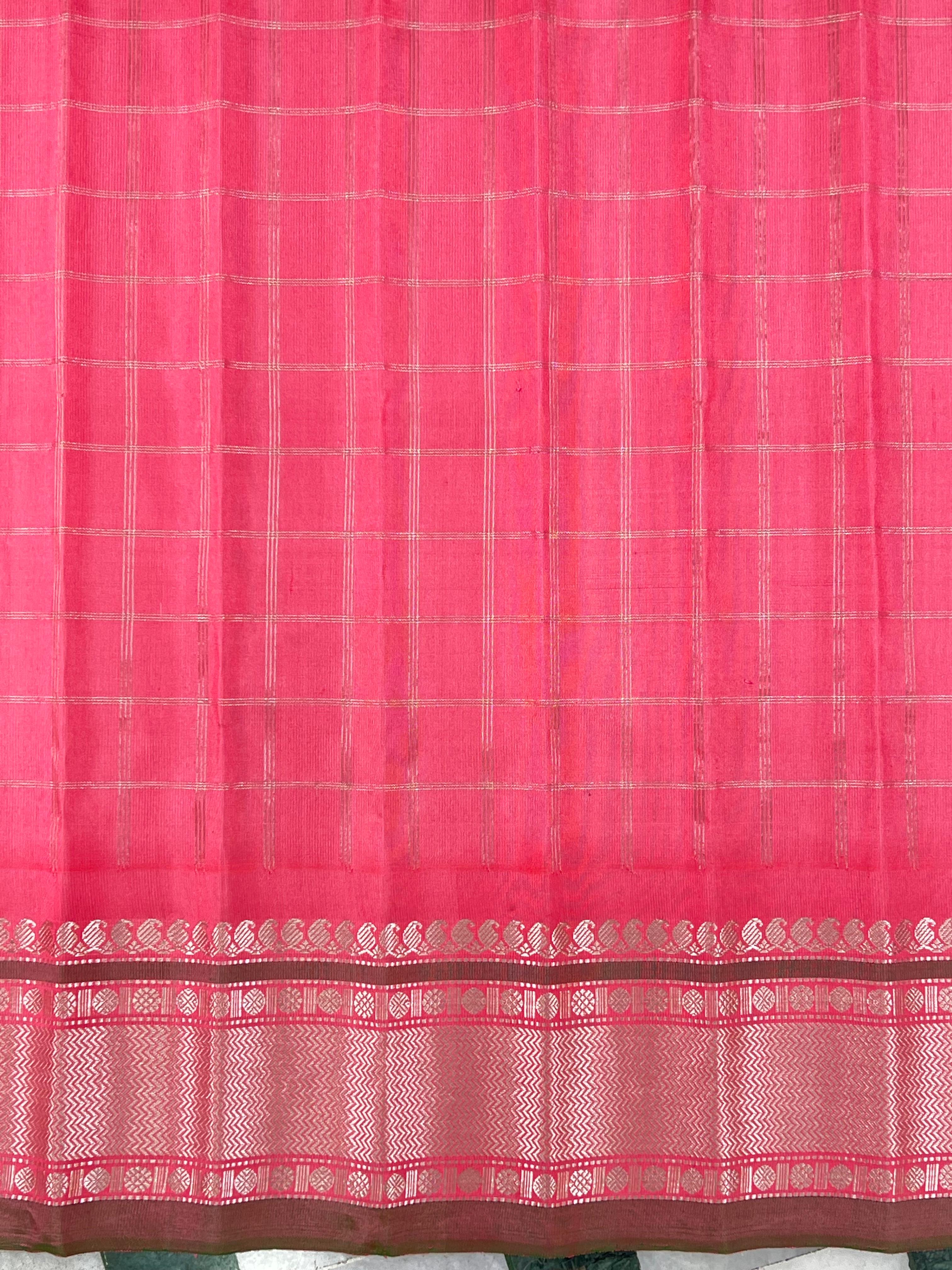 This Gadwal Pure Silk Handloom Saree features a royal blue body with elegant silver checks and contrast pink–silver buttas, creating a rich traditional charm. The contrast rosy pink border and pallu are beautifully woven with temple motifs and fine zari patterns, adding a festive glow. Paired with a contrast blouse, this saree is Silk Mark Certified, ensuring pure silk quality and exquisite handloom craftsmanship — a perfect pick for special occasions and celebrations.