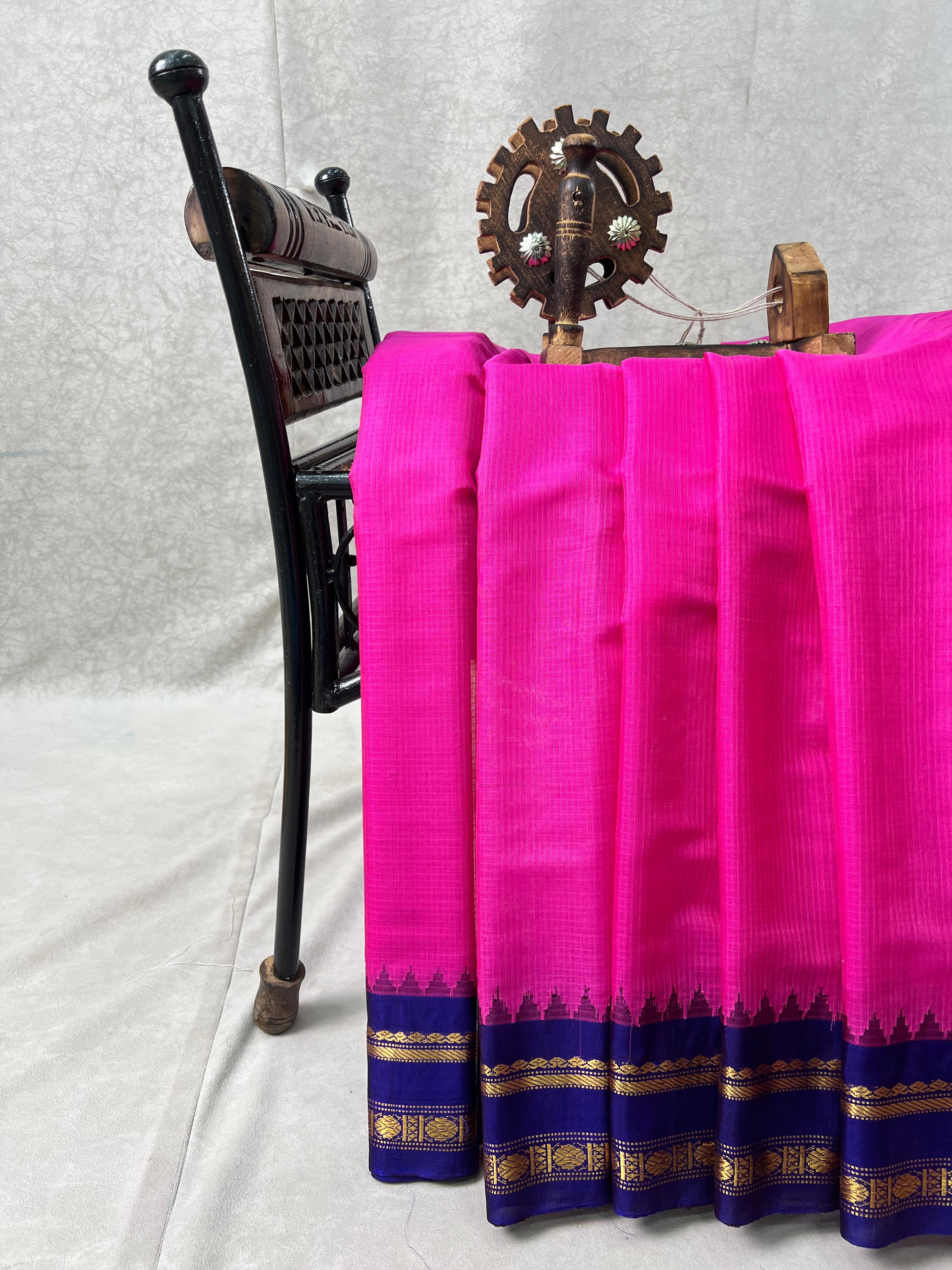 This is a Gadwal Cotton Kuttu Handloom Saree, featuring a rich pink body contrasted with a navy blue border. The border is adorned with intricate golden zari weaving in traditional kuttu technique, giving it a timeless elegance. Lightweight and breathable, this saree is perfect for graceful everyday wear or simple festive occasions, showcasing the authentic charm of handloom craftsmanship. Blouse not included.
