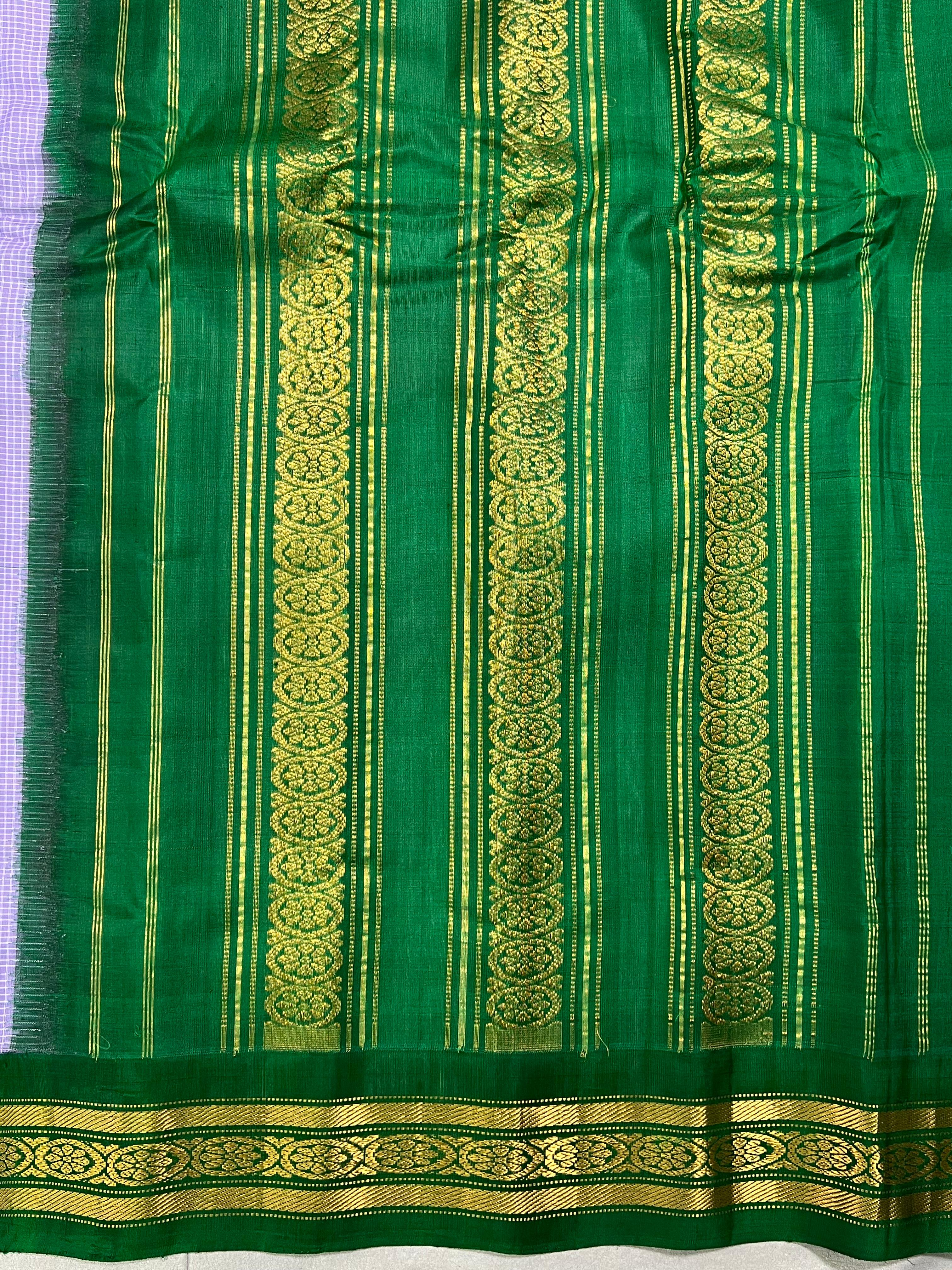 This is a Gadwal Cotton Kuttu Handloom Saree, featuring a soft lavender body with white checks contrasted with a green border. The border is adorned with intricate golden zari weaving in traditional kuttu technique, giving it a timeless elegance. Lightweight and breathable, this saree is perfect for graceful everyday wear or simple festive occasions, showcasing the authentic charm of handloom craftsmanship. Blouse not included.