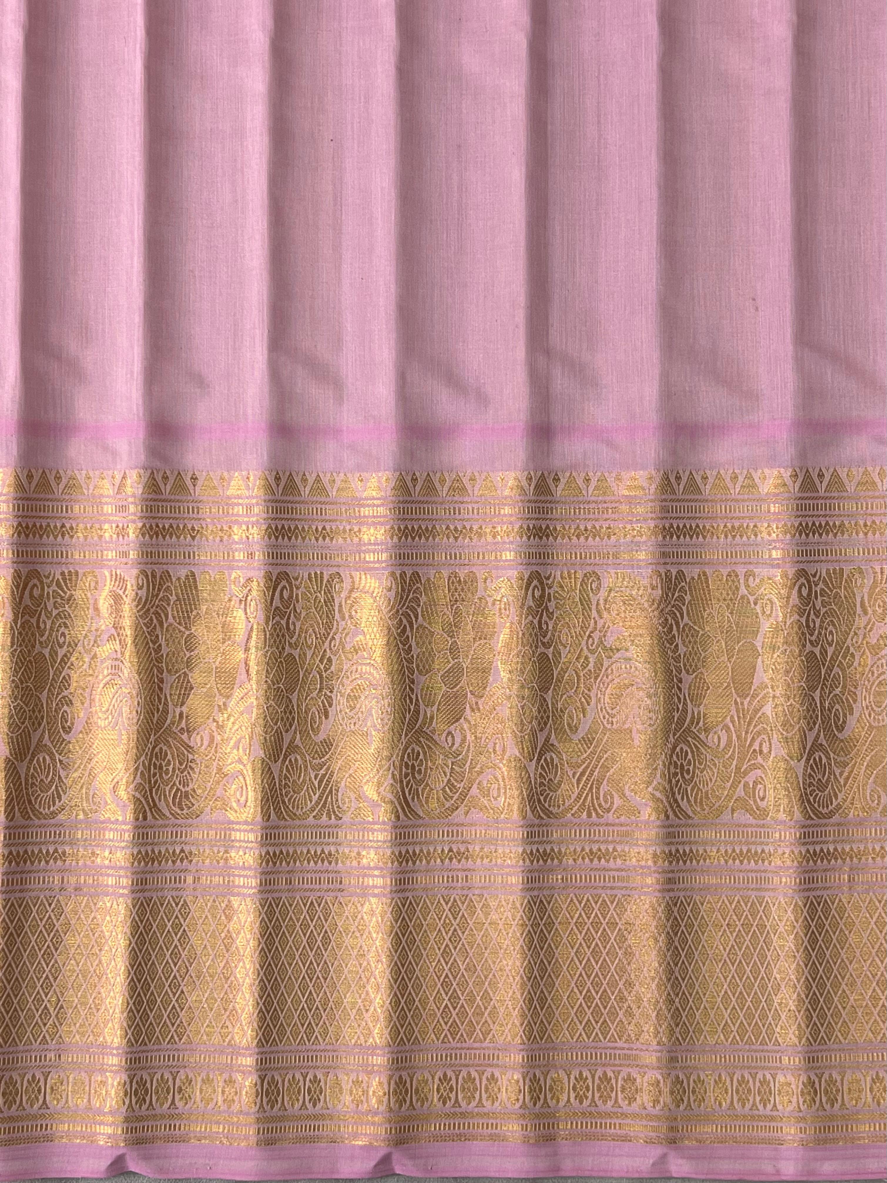 This elegant Gadwal Cotton Silk (Sico) Saree features a graceful sea green body with delicate buttas in gold and silver, paired with a rich contrast onion pink border and pallu woven in intricate golden zari motifs. Lightweight yet grand, it beautifully blends the comfort of cotton with the sheen of silk, making it ideal for festive and traditional occasions. Comes with contrast blouse.