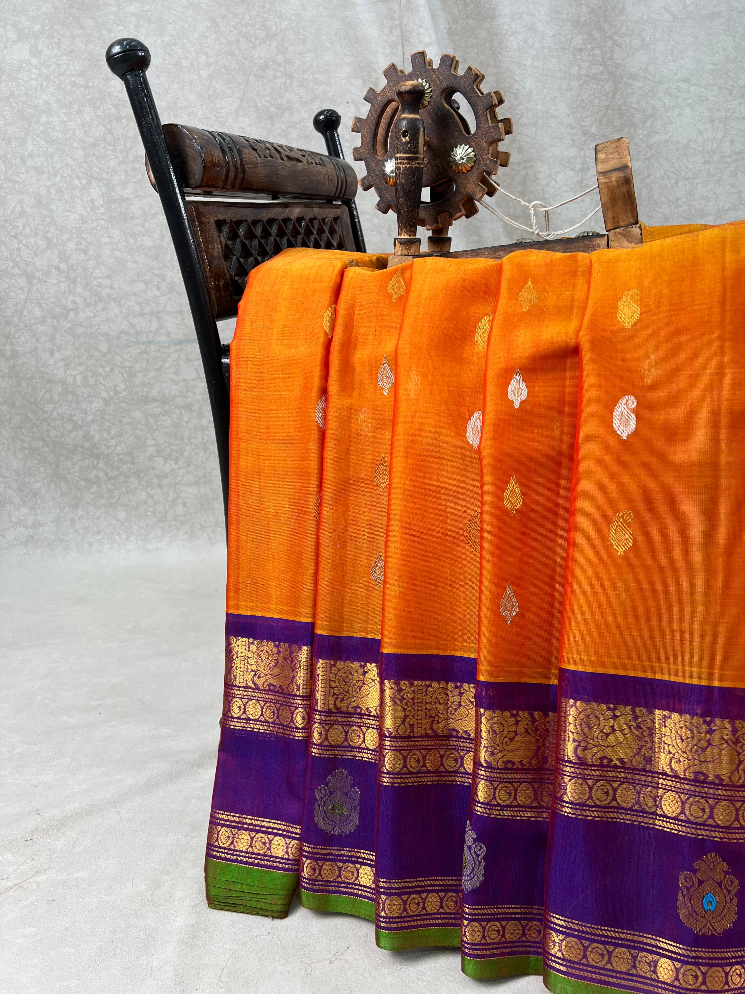 Elegant and timeless, this Gadwal Gap Border Meena Butta Cotton Silk Handloom Saree features a rich orange colour body adorned with delicate silver and gold buttas. The graceful purple border with intricate golden weaving and meena buttas with green selvedge adds a touch of grandeur, making it a perfect blend of tradition and sophistication. Comes with contrast blouse.