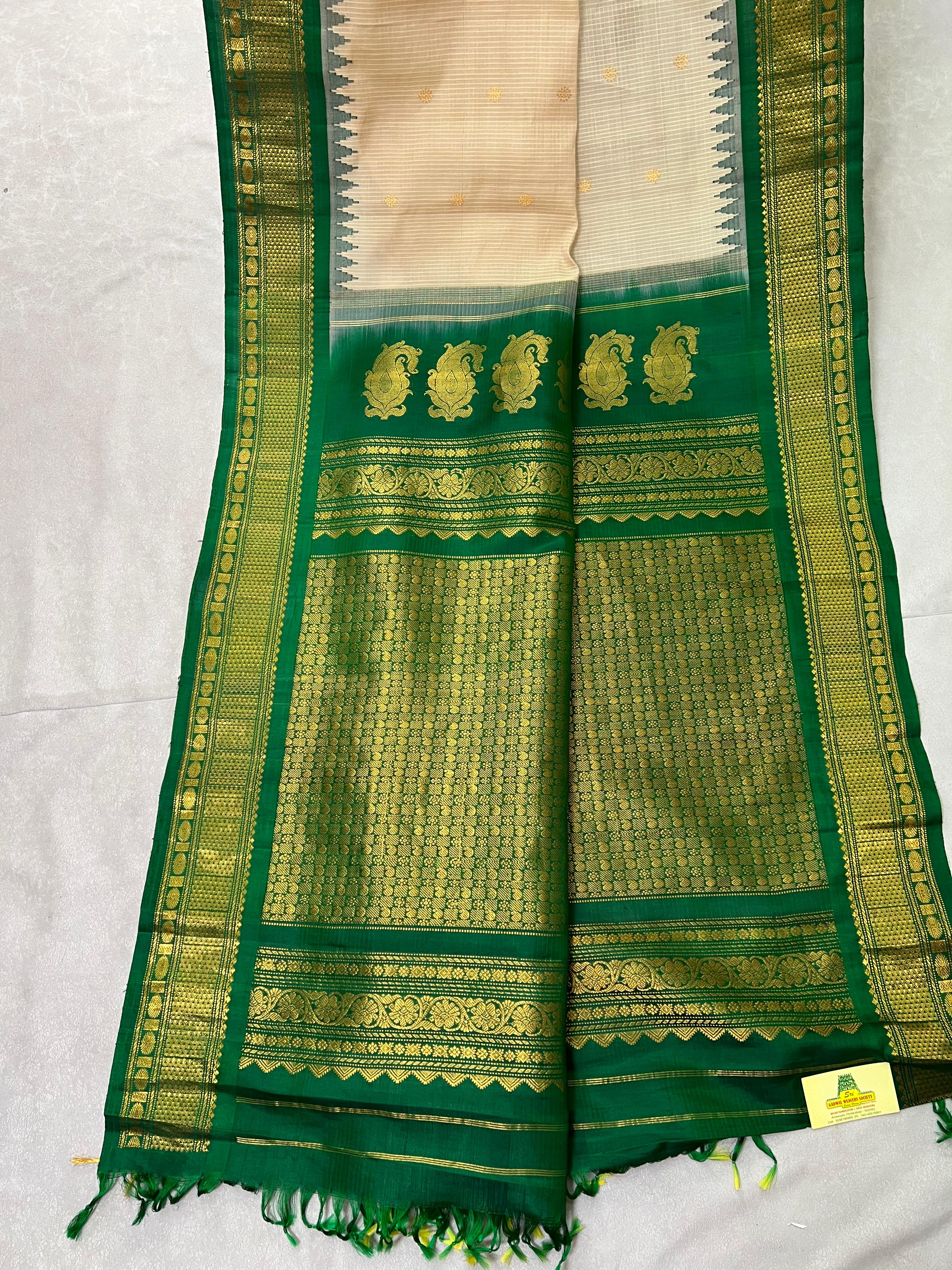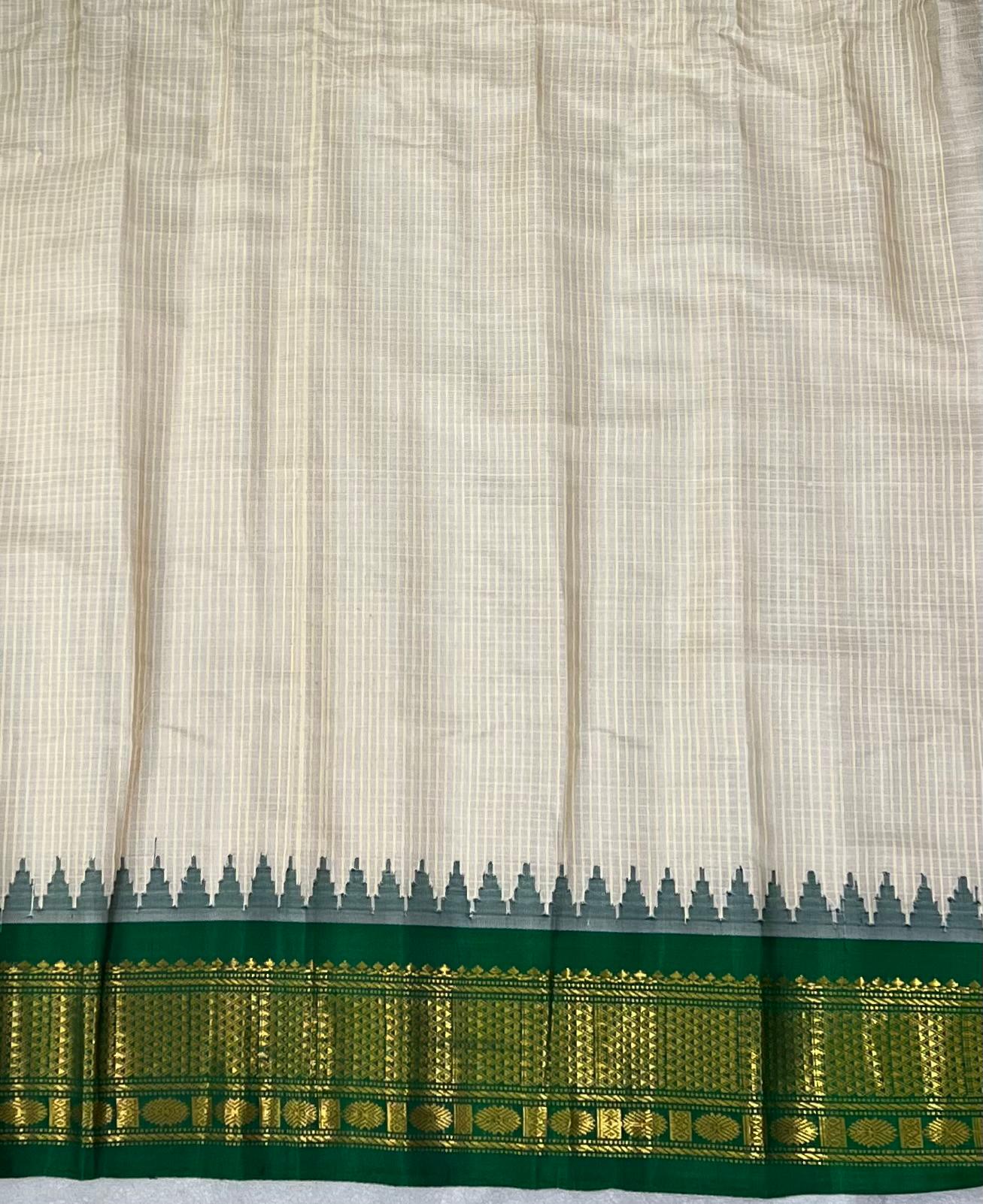 This elegant Gadwal Handloom Cotton Silk Saree features a rich off white colour body adorned with delicate vertical stripes and small woven motifs. The striking green zari border with traditional temple design and intricate gold weaving adds a regal contrast. Lightweight, soft, and easy to drape, this SICO saree beautifully blends the comfort of cotton with the sheen of silk — perfect for festive and traditional occasions. Comes with matching blouse.