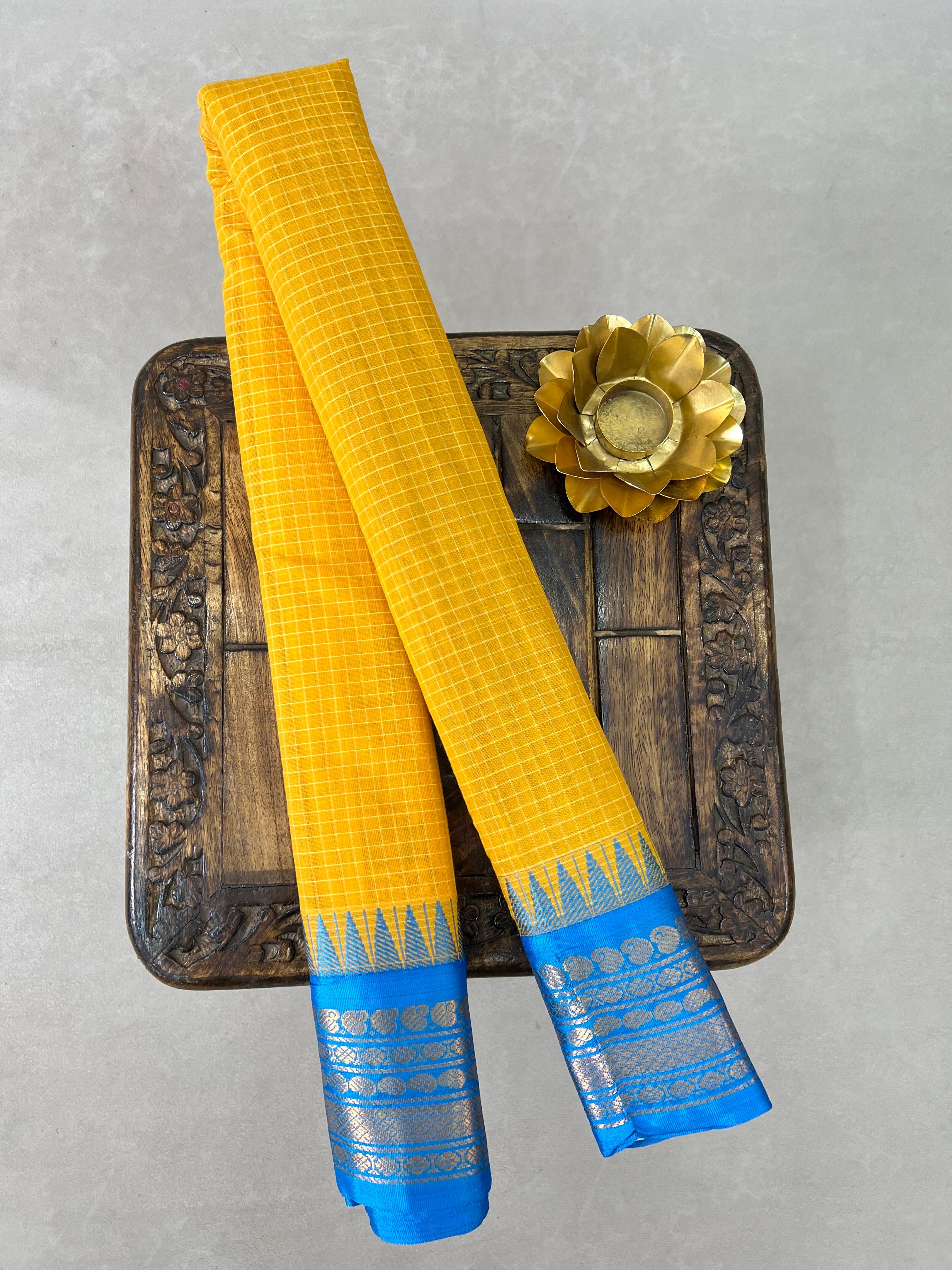 This elegant Gadwal Pure Cotton Checks Handloom Saree features a subtle Yellow Color base adorned with fine white checks, giving it a classy and timeless appeal. The contrasting Sky Blue Color Temple border with Gold zari floral motifs add a vibrant touch, beautifully balancing tradition with sophistication. Lightweight and comfortable, it is perfect for everyday wear as well as special occasions. Blouse not included.