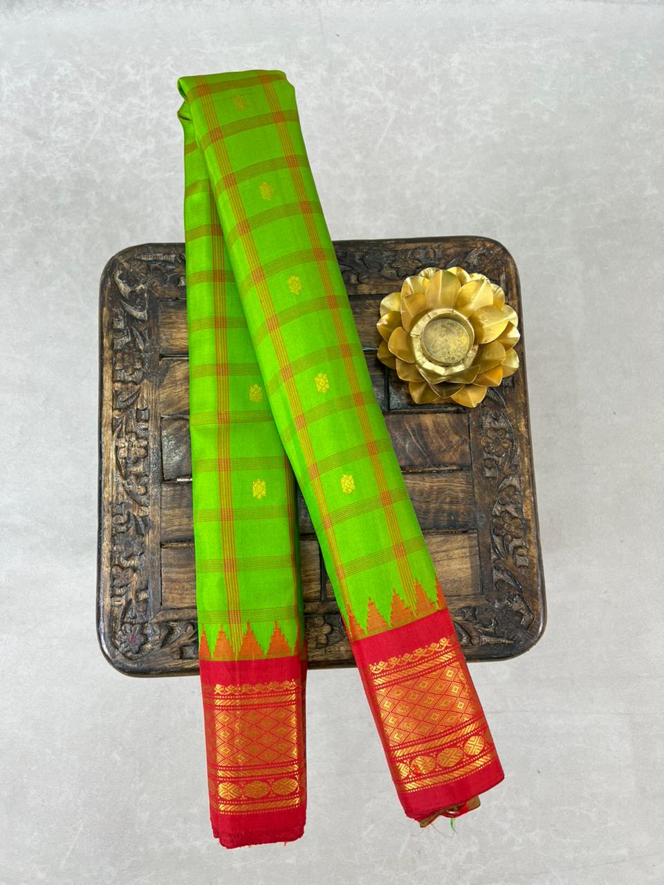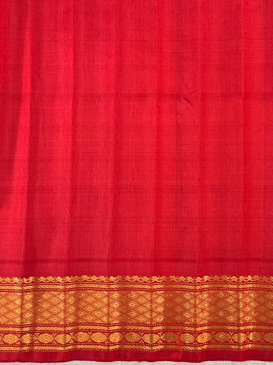 This elegant Gadwal Pure Silk Checks Handloom Saree features a vibrant Parrot Green body adorned with classic Thread checks, beautifully enhanced with delicate Gold zari buttas. The saree is complemented by a Rich red border with intricate Gold zari detailing, adding a striking traditional contrast. A perfect blend of heritage and elegance, ideal for weddings, festive occasions, and special celebrations. This saree comes with contrast Blouse, and it is Silk mark Certified.