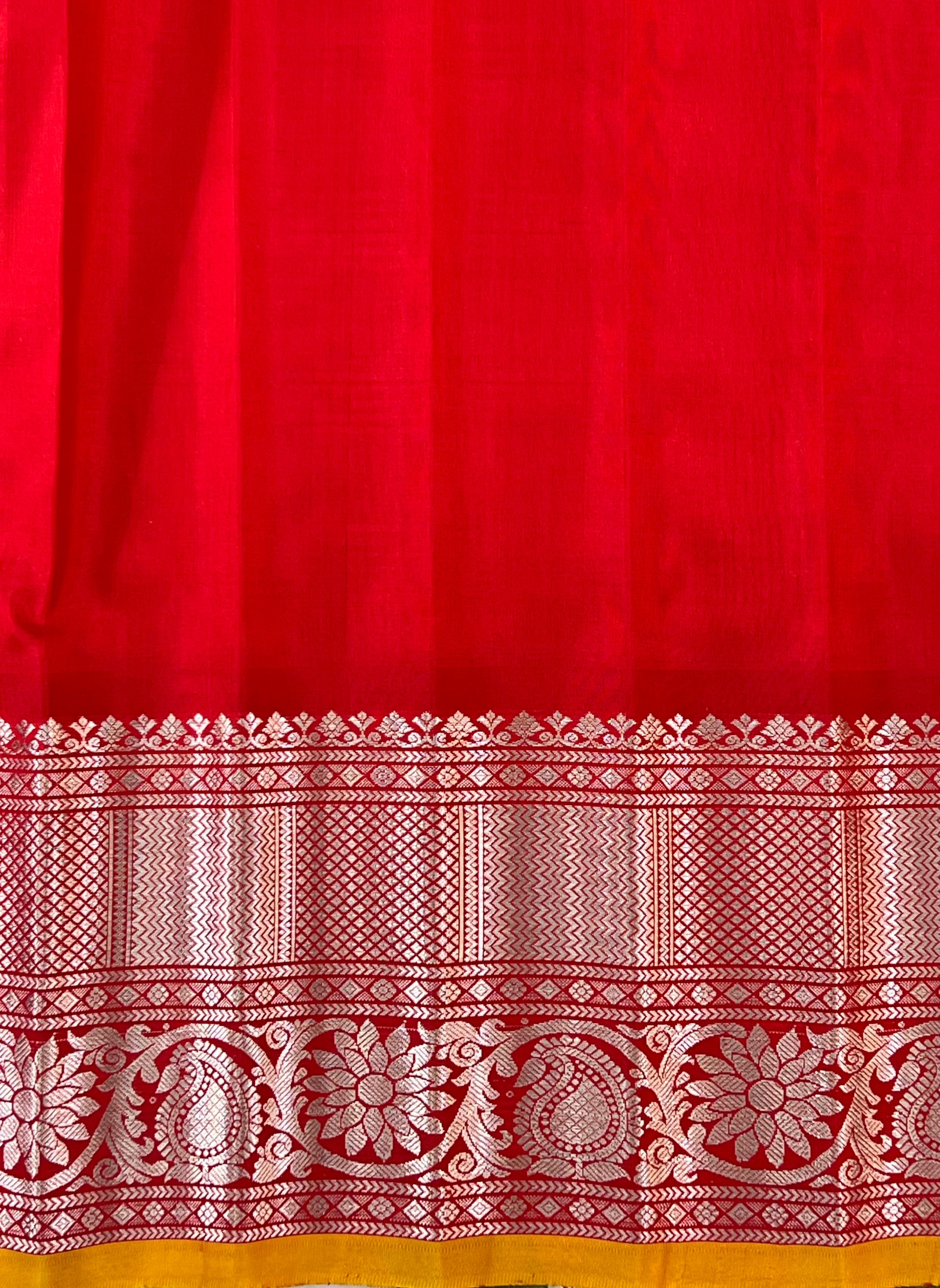 This elegant Gadwal Pure Silk Burberry Checks Handloom Saree features a Beige body adorned with classic kattam checks, beautifully enhanced with delicate Silver and thread buttas. The saree is complemented by a rich Red border with intricate gold zari weaving and comes with yellow selvedge, adding a striking traditional contrast. A perfect blend of heritage and elegance, ideal for weddings, festive occasions, and special celebrations. This saree comes with contrast Blouse, and it is Silk mark Certified.