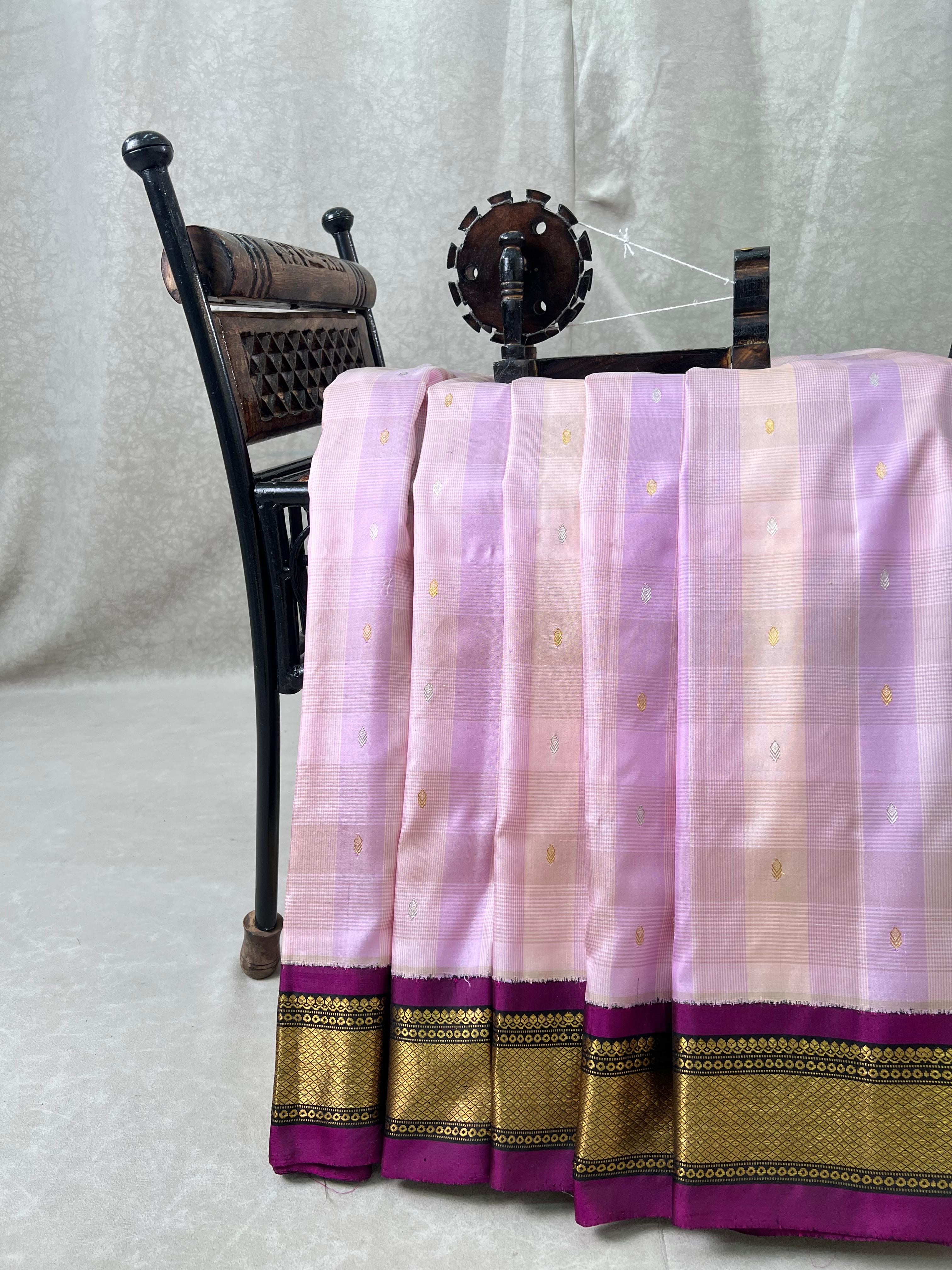 This elegant Gadwal Pure Silk Burberry Checks Handloom Saree features a Dual tone light purple with Beige body adorned with classic kattam checks, beautifully enhanced with delicate Silver and gold buttas. The saree is complemented by a Black border with intricate gold zari weaving and comes with Magenta selvedge, adding a striking traditional contrast. A perfect blend of heritage and elegance, ideal for weddings, festive occasions, and special celebrations. This saree comes with contrast Blouse, and it is Silk mark Certified.