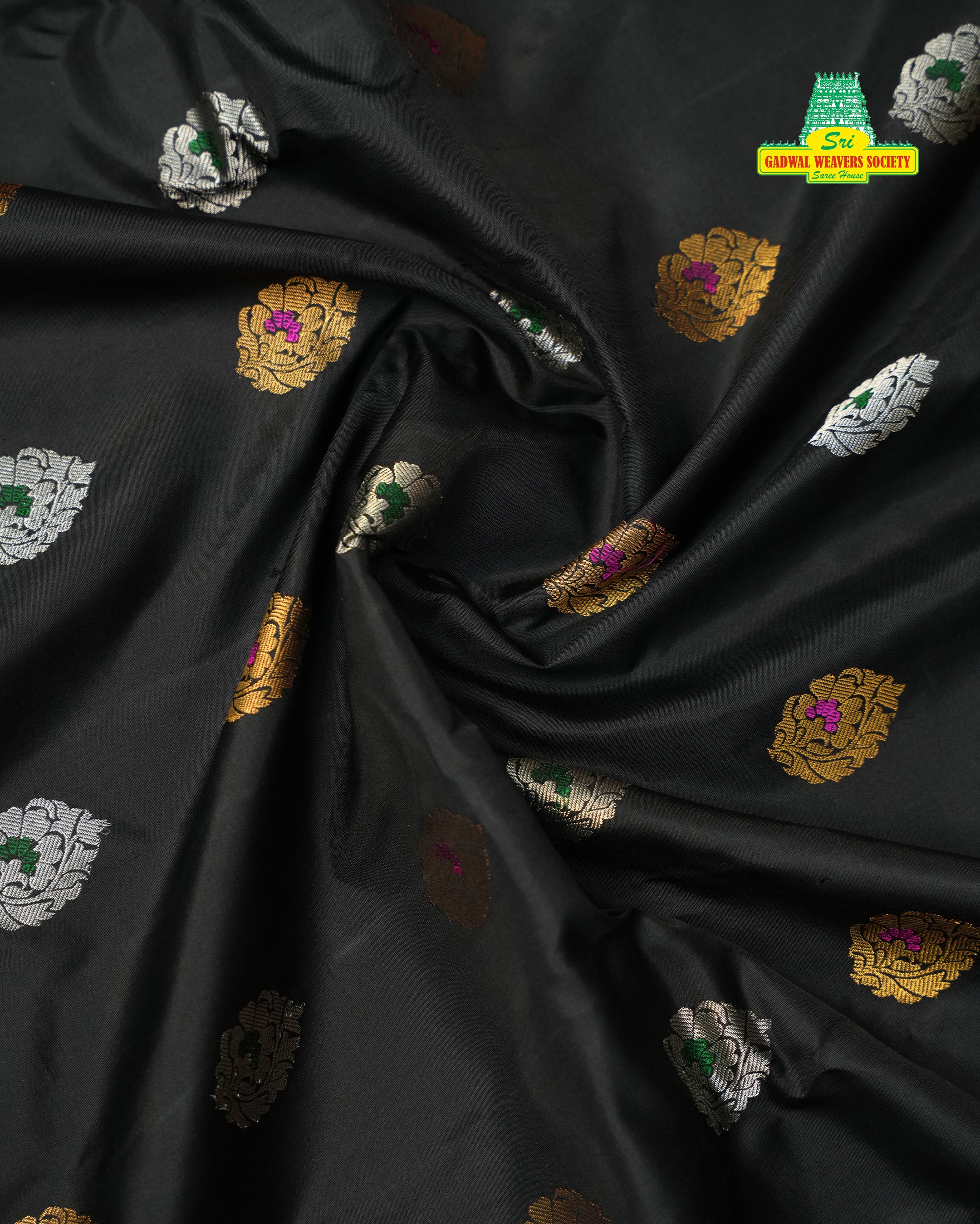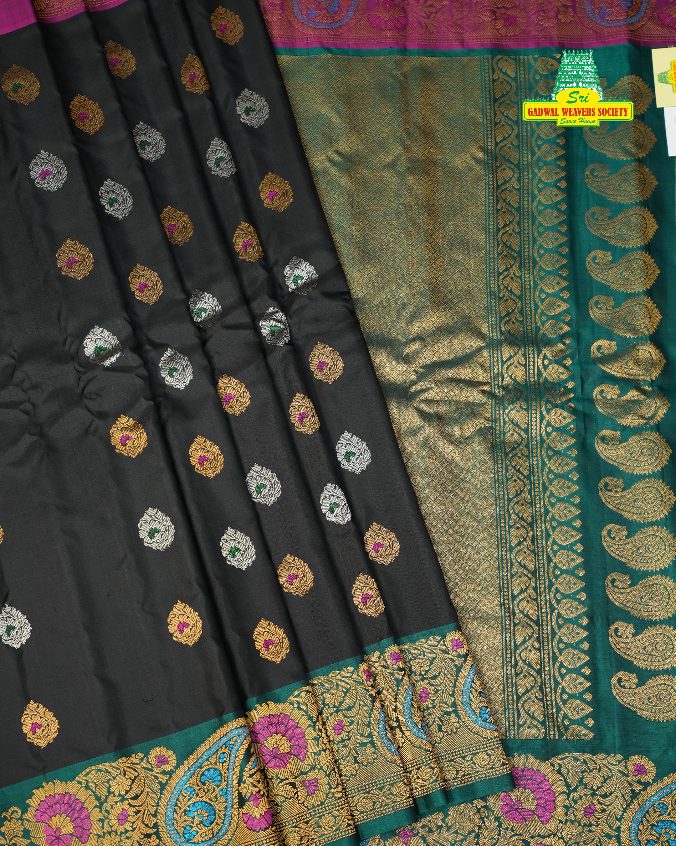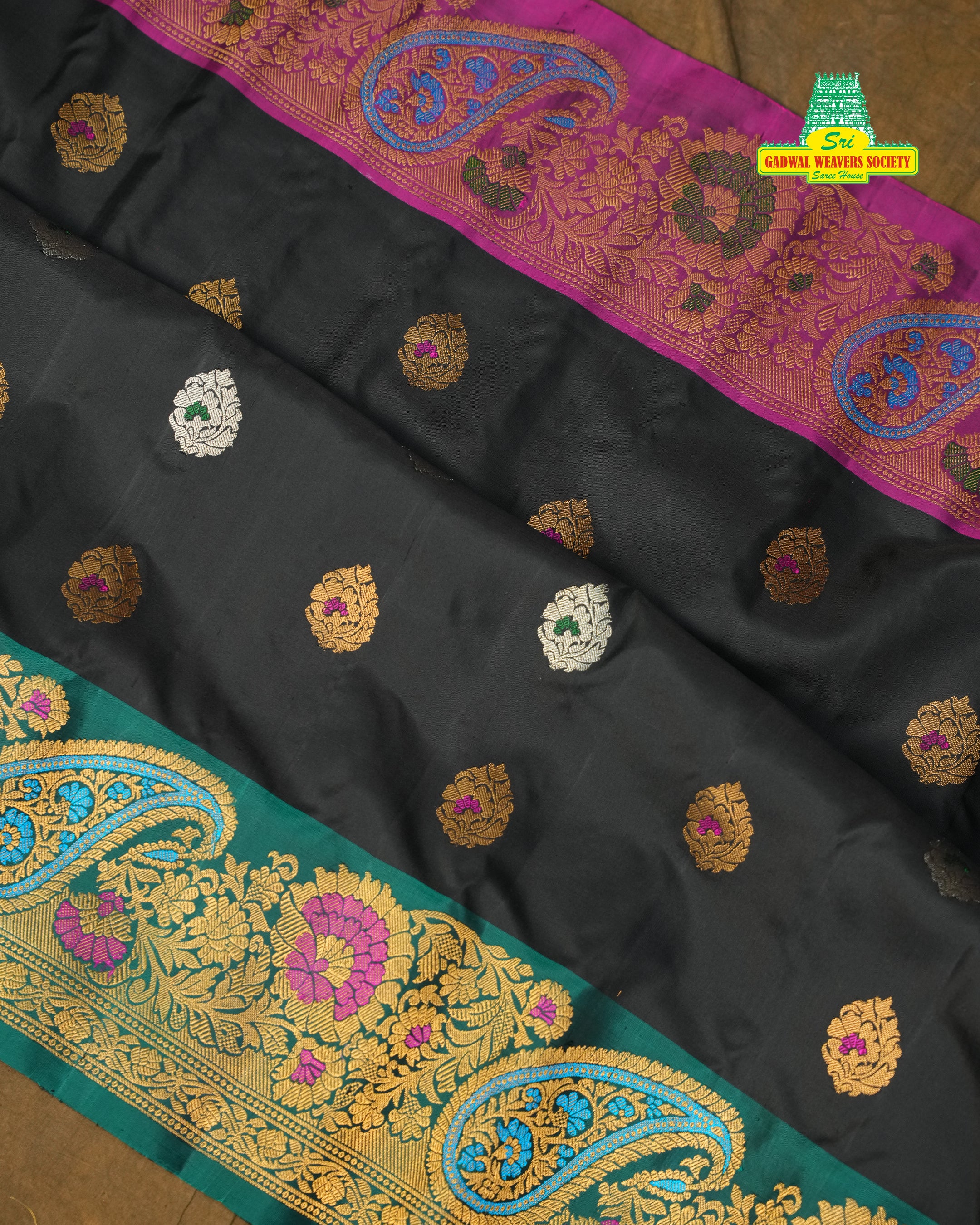 This Gadwal Pure Silk Ganga Jamuna Meenakari Saree is a timeless masterpiece showcasing the elegance of handloom weaving. The saree features a graceful black body with subtle floral self-designs, complemented by a stunning dual-tone Ganga Jamuna border—a classic contrast of rich peacock green with gold zari on one side and vibrant purple with gold zari on the other. Comes with contrast blouse, and Silk Mark certified — perfect for traditional celebrations.