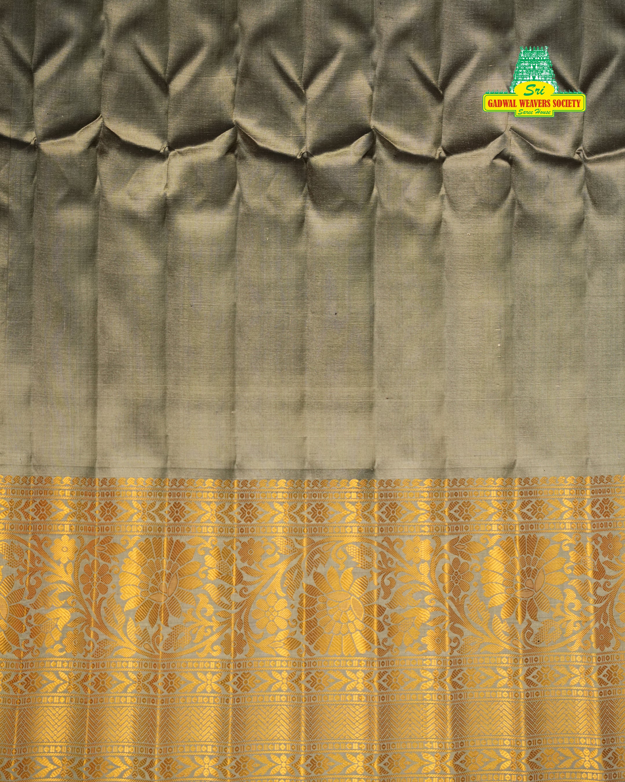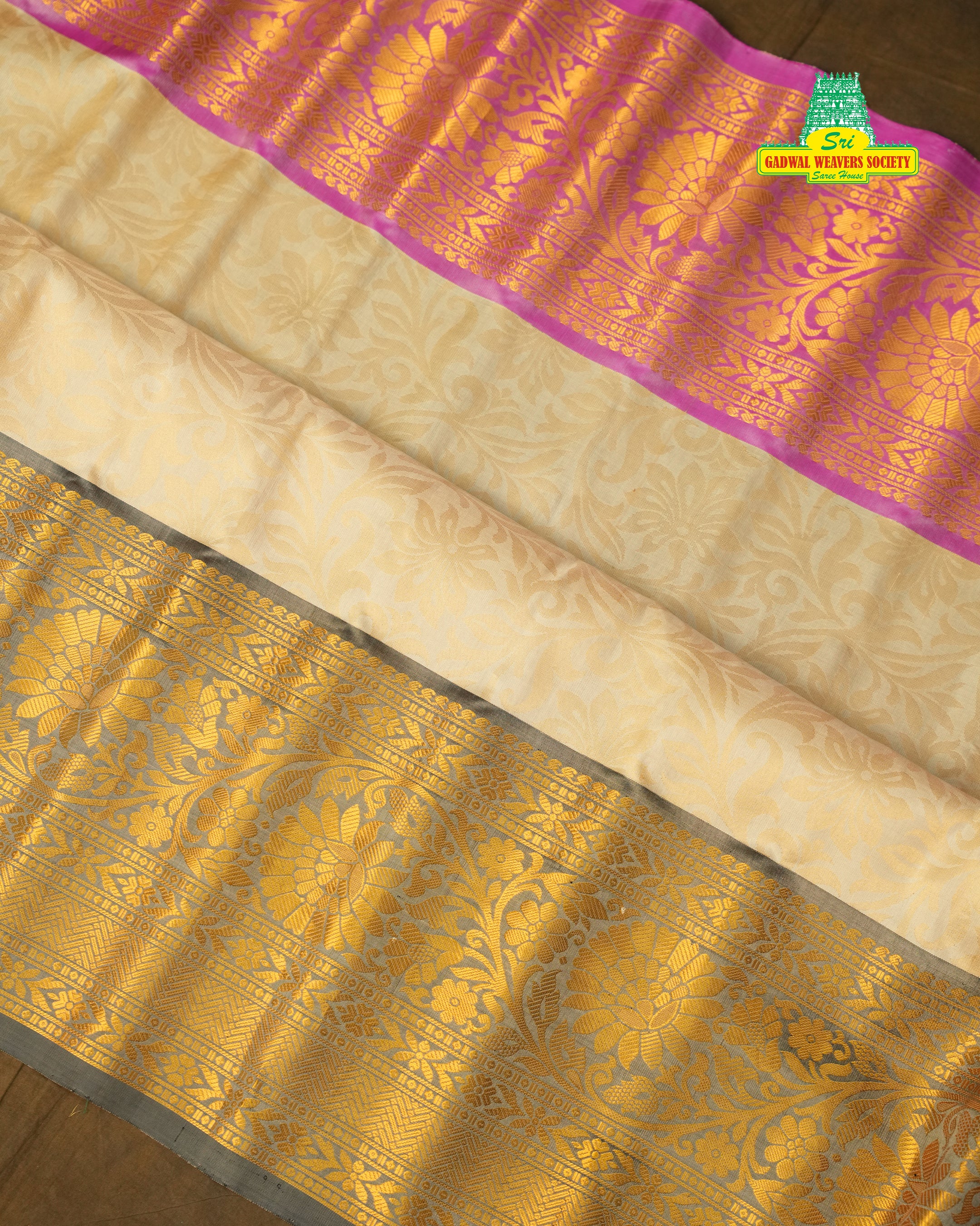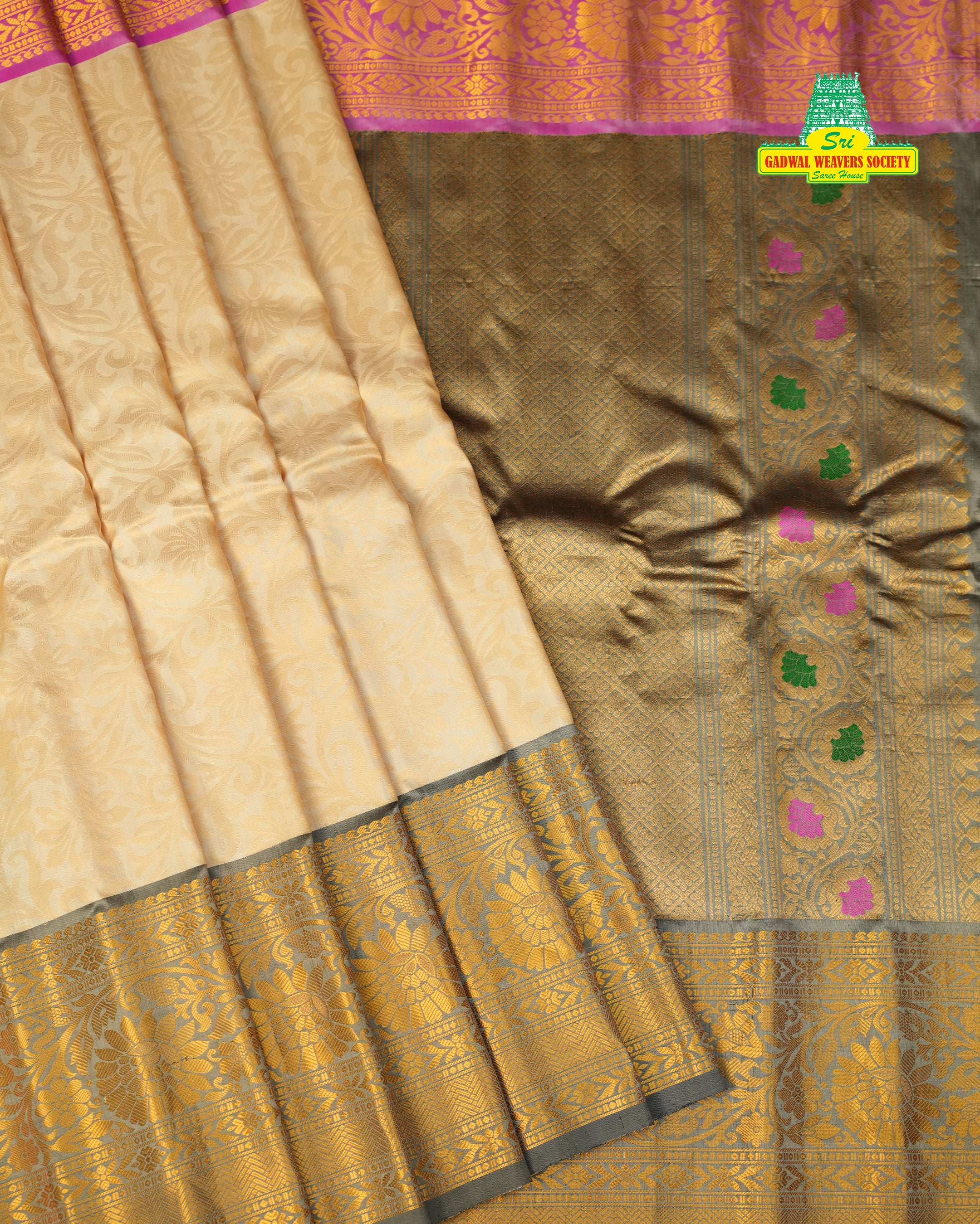 This Gadwal Pure Silk Ganga Jamuna Brocade Saree is a timeless masterpiece showcasing the elegance of handloom weaving. The saree features a graceful beige body with subtle floral self-designs, complemented by a stunning dual-tone Ganga Jamuna border—a classic contrast of rich grey with gold zari on one side and vibrant pink with gold zari on the other. Comes with contrast blouse, and Silk Mark certified — perfect for traditional celebrations.