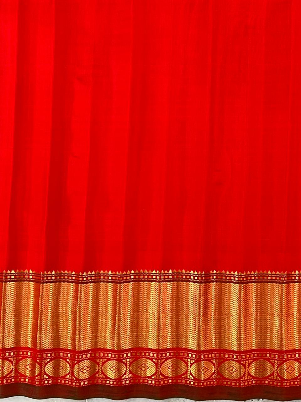 This Gadwal Pure Silk Handloom Saree features a White body with Black gingham checks elegantly adorned with delicate gold zari and Red thread motifs, The saree is beautifully enhanced by a striking Temples appears on the Red border, highlighted with intricate gold zari detailing and comes with green selvedge, adding a regal traditional appeal. Ideal for festive, wedding, and traditional occasions, this masterpiece showcases the authentic craftsmanship of Gadwal handlooms. Pair it with a contrast blouse, and enjoy complete assurance as it is Silk Mark Certified.