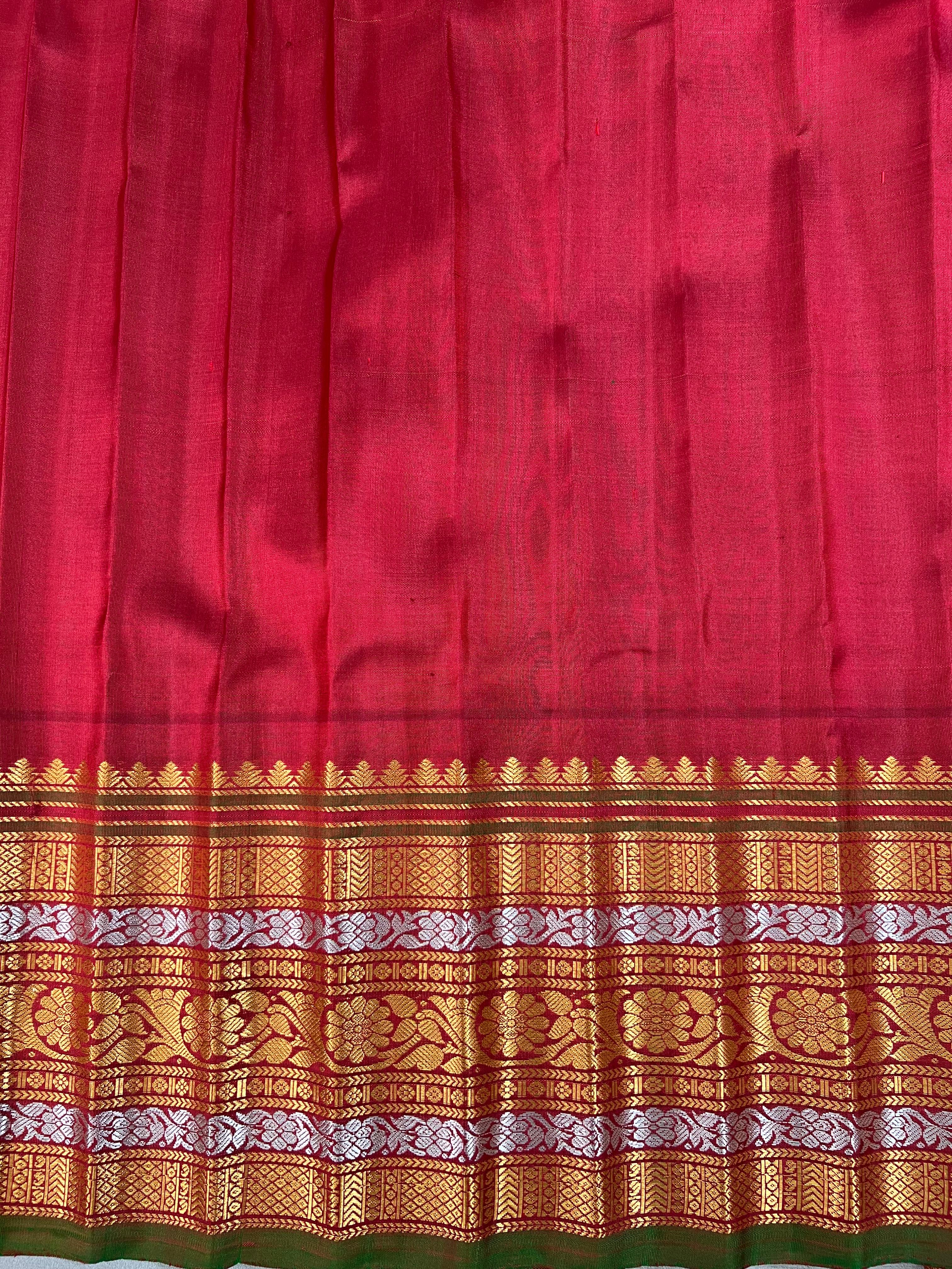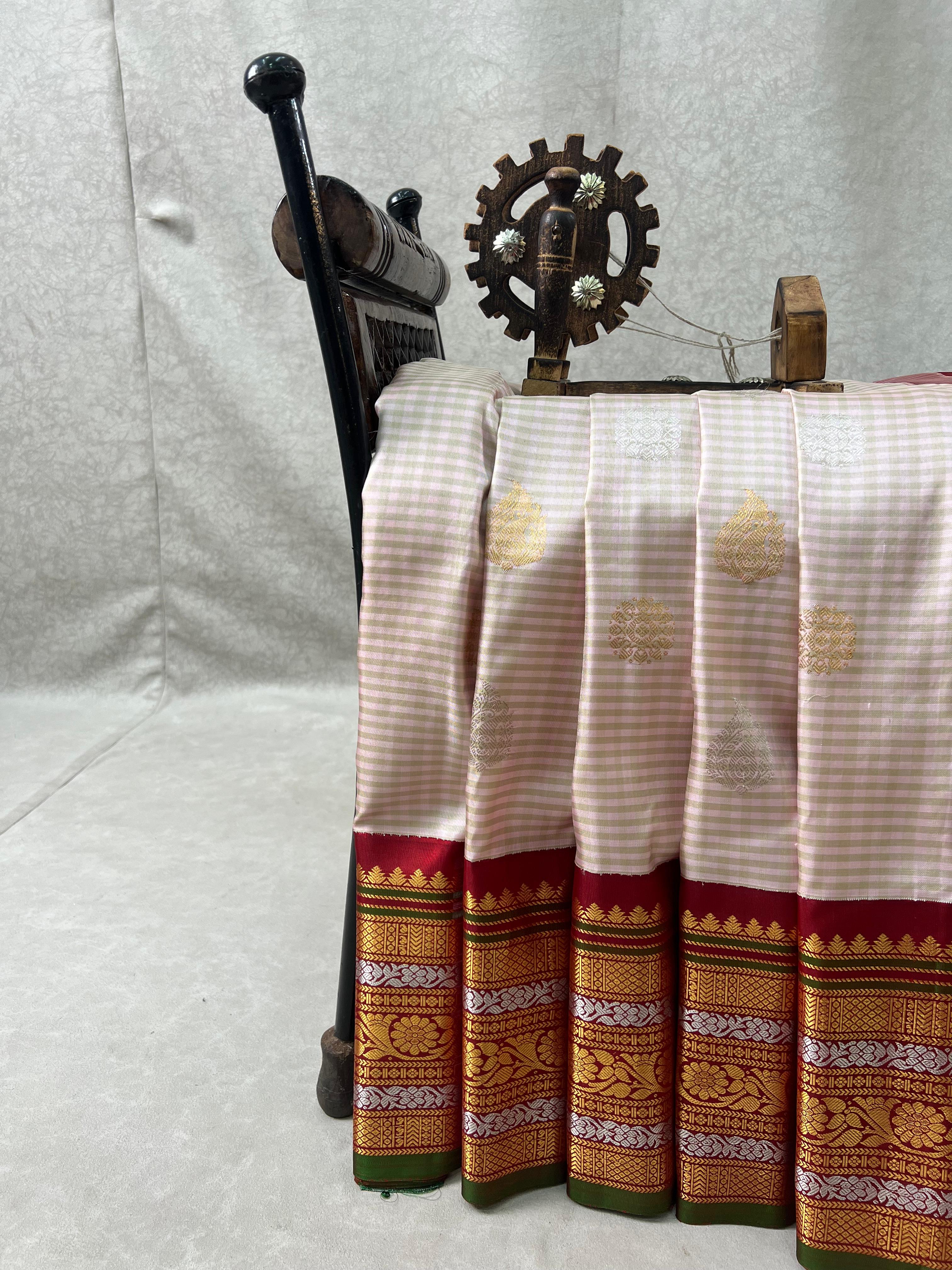 This exquisite Gadwal pure silk handloom saree features delicate gingham checks adorned with baby pink body with light green checks shimmering gold and silver buttas. The rich contrast maroon border and pallu with green selvedge, woven with intricate zari work, add a regal touch. Paired with a matching contrast blouse and Silk Mark certified for authenticity, this saree is a timeless blend of tradition and grace.