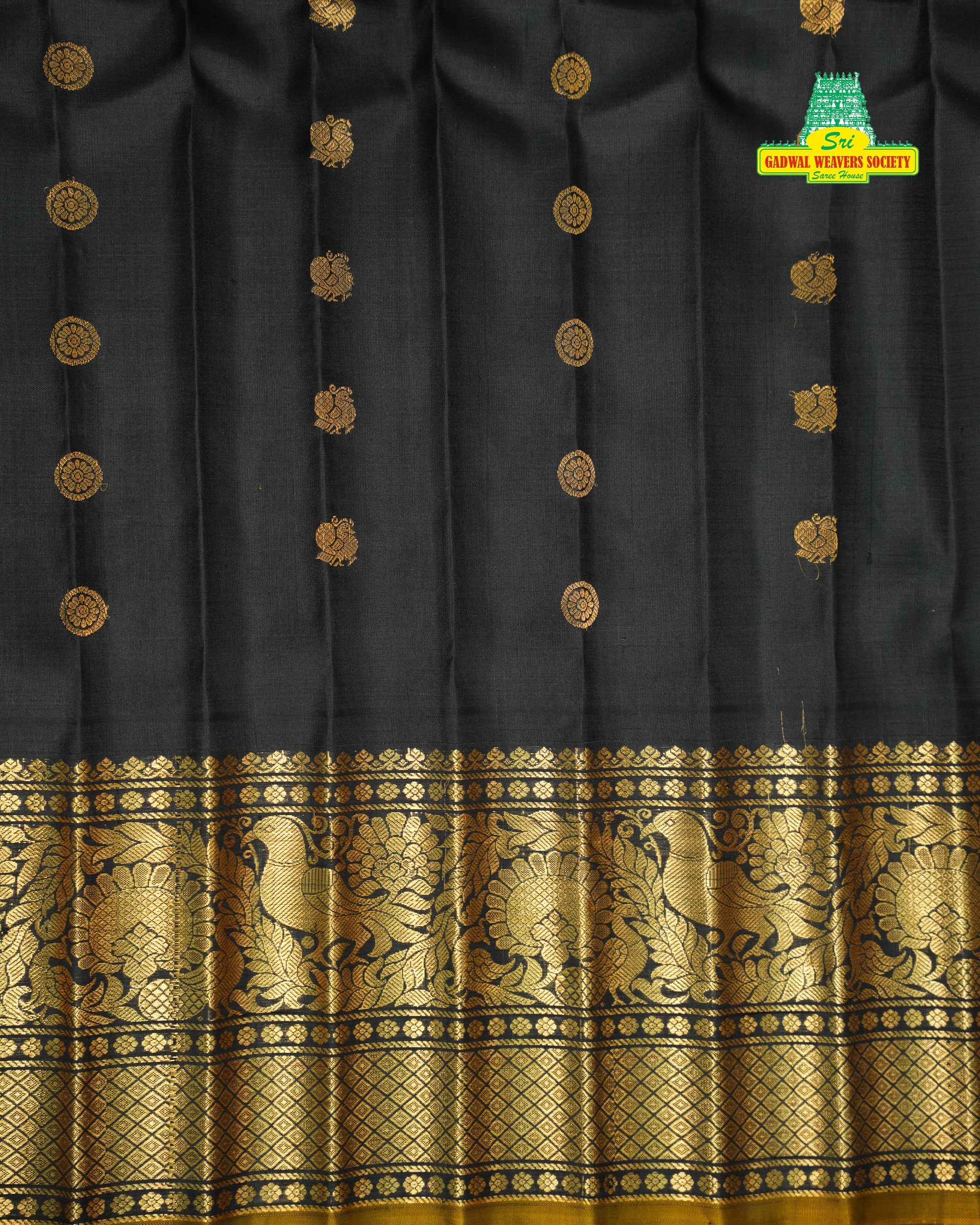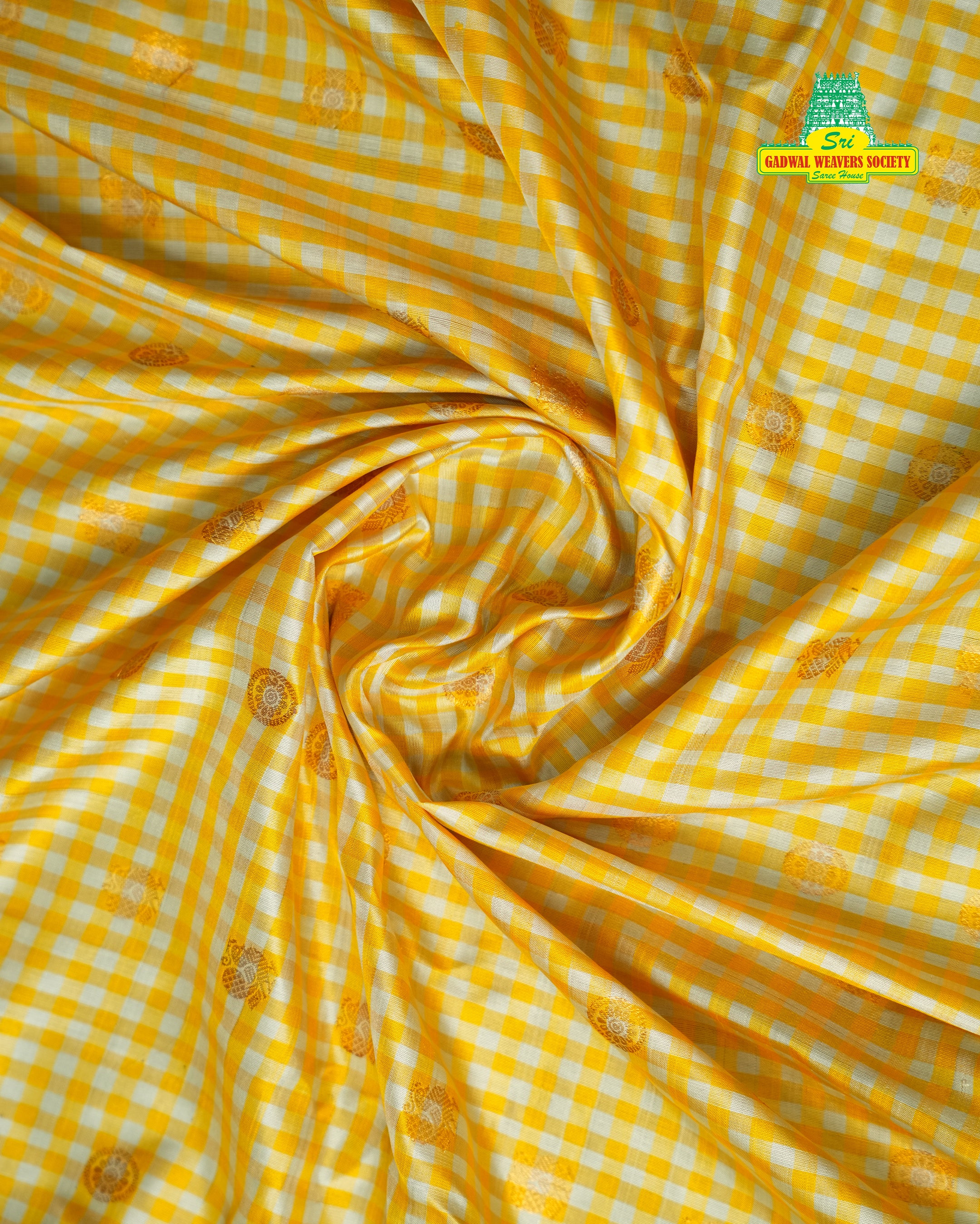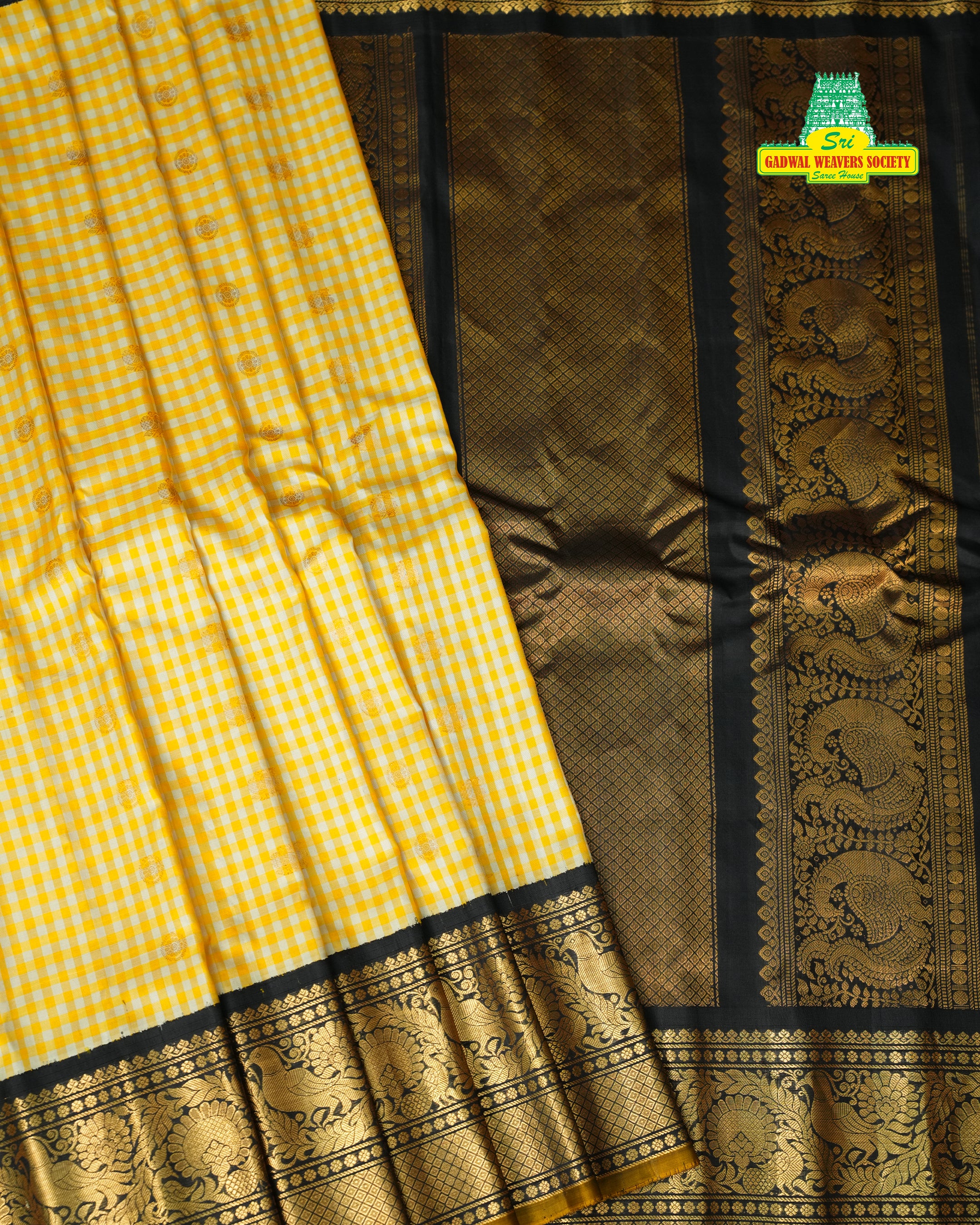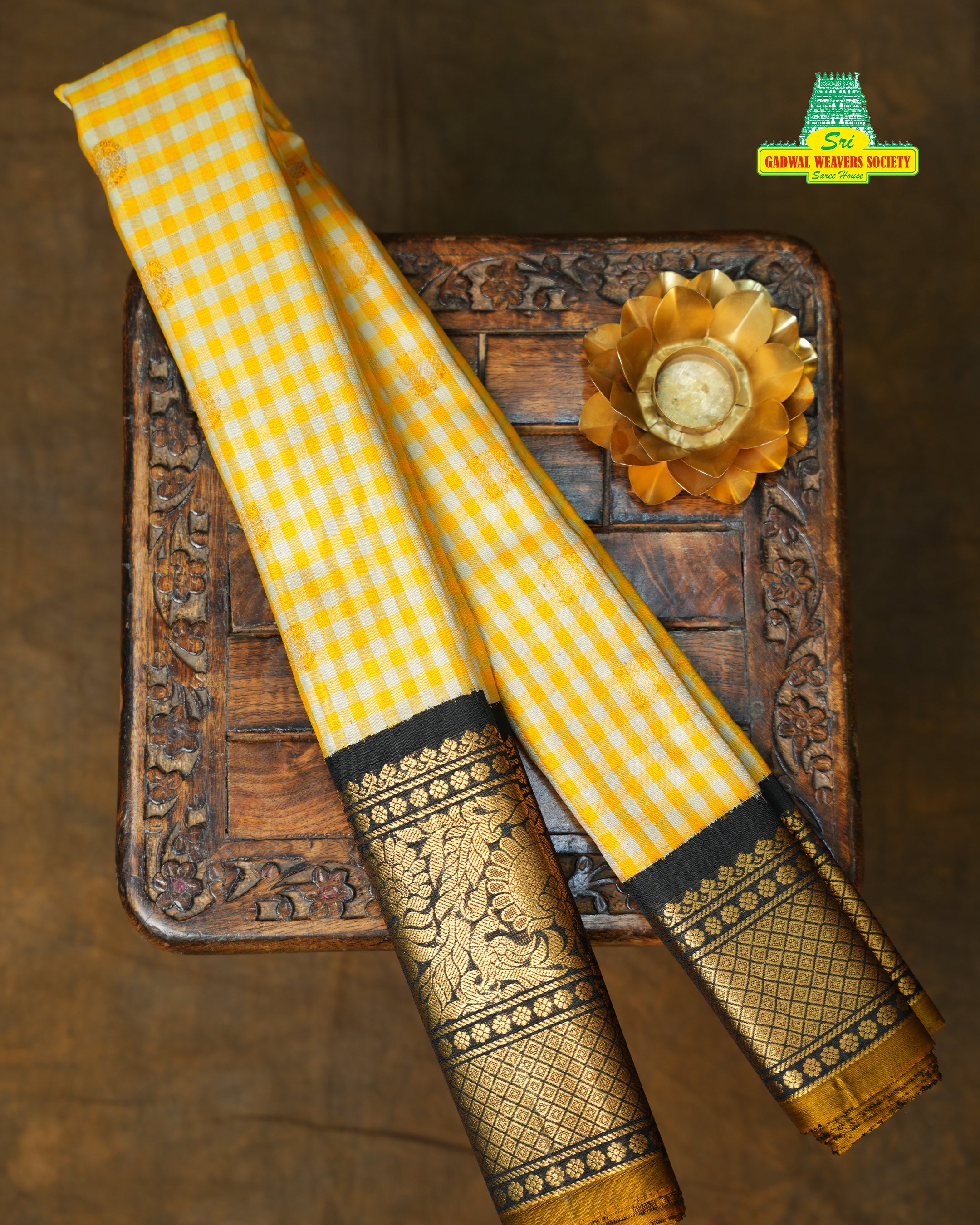 A stunning blend of tradition and charm, this Gadwal Pure Silk Saree features elegant yellow and white gingham checks adorned with delicate zari buttas. The rich black zari woven border and pallu with intricate peacock motifs with mustard edge add a regal touch, making it perfect for festive and traditional occasions. Paired with a matching contrast blouse and Silk Mark certified for authenticity, this saree is a timeless blend of tradition and grace.