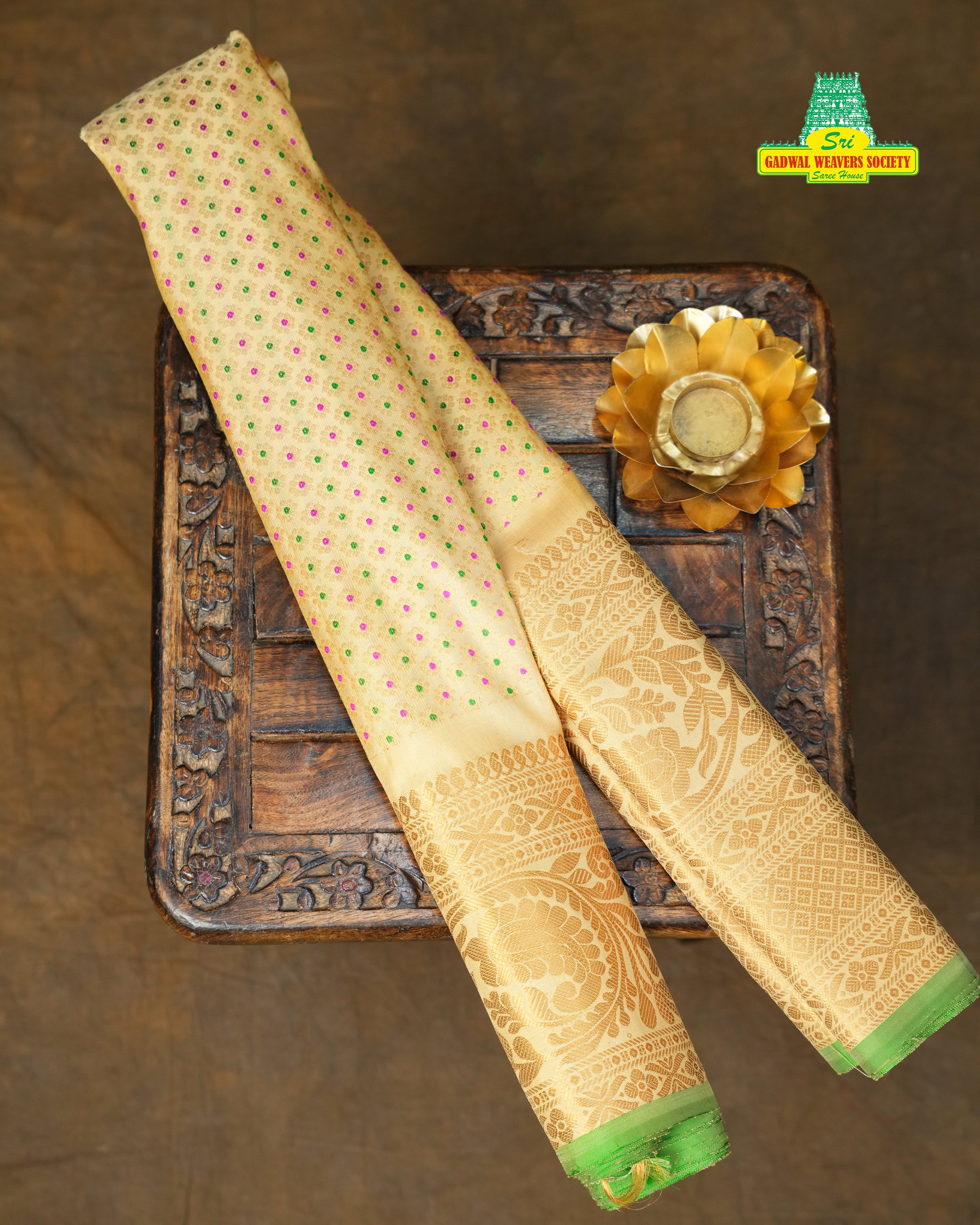 This stunning Gadwal Brocade Silk saree features a finely woven golden off white body with intricate detailing, beautifully self border and pallu adorned with rich multicolor gold zari floral meena motifs. The saree is tastefully finished with a light green selvedge, adding a charming pop of color to this regal ensemble Comes with contrast blouse and Silk Mark certified — perfect for weddings and festive celebrations.