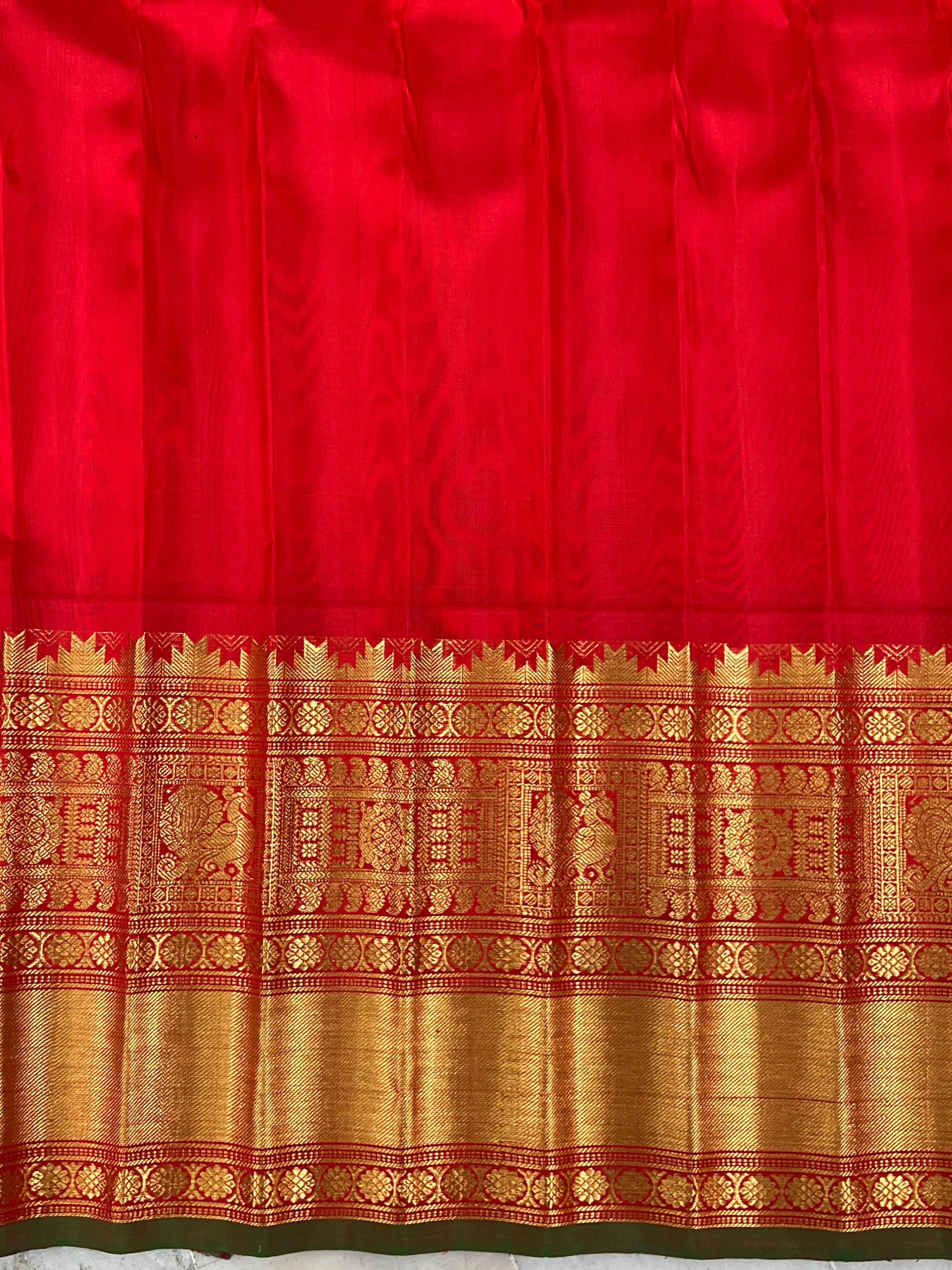 Grace your wardrobe with this stunning Gadwal Pure Silk Saree, featuring a green colour body embellished with gold and silver butterfly motifs. The vibrant dark red border with intricate motifs and rich golden zari work with green selvedge adds a striking contrast, making it an ideal choice for traditional celebrations and festive gatherings. Pair with contrast blouse, and is Silk Mark certified for authenticity.