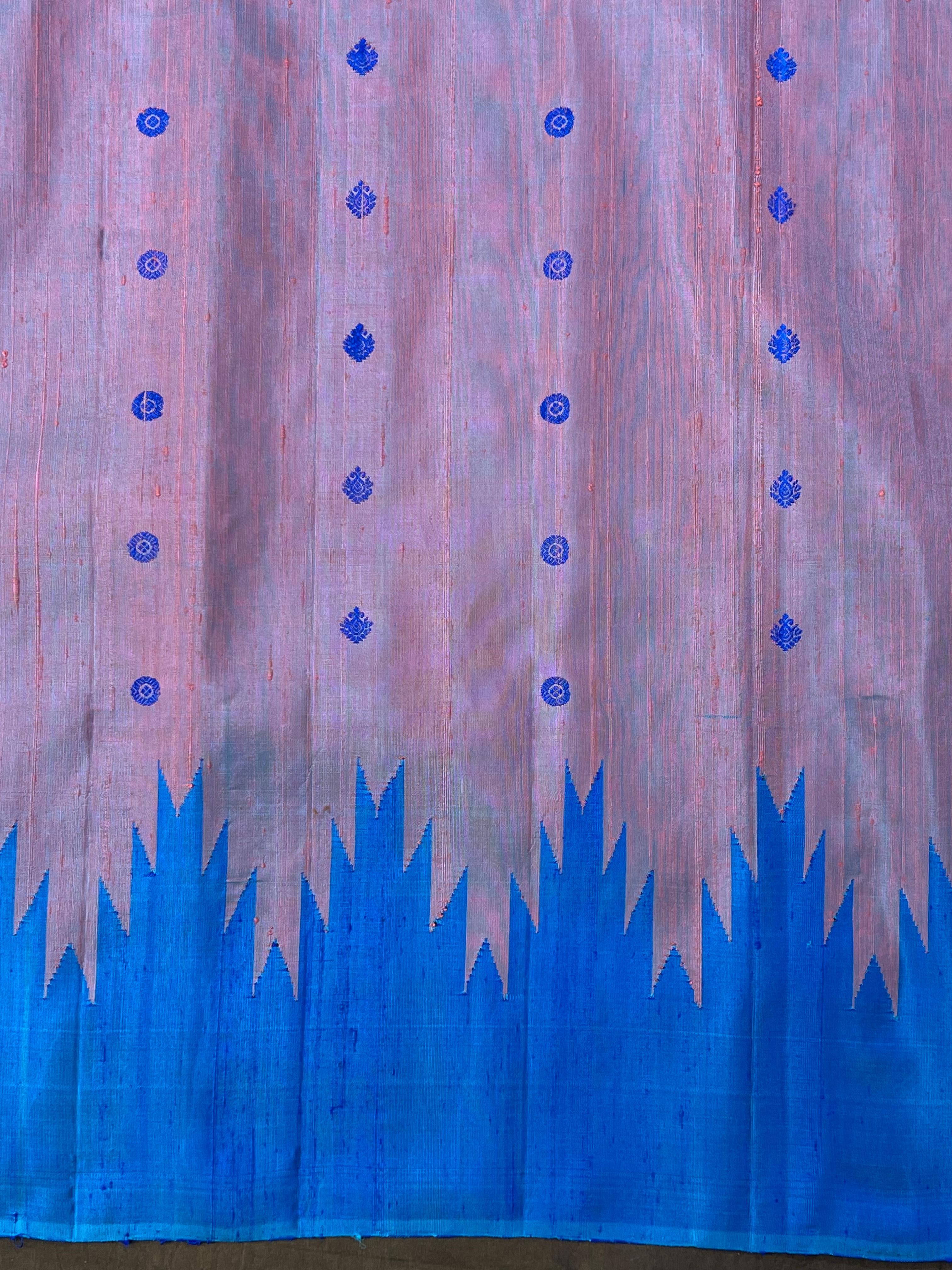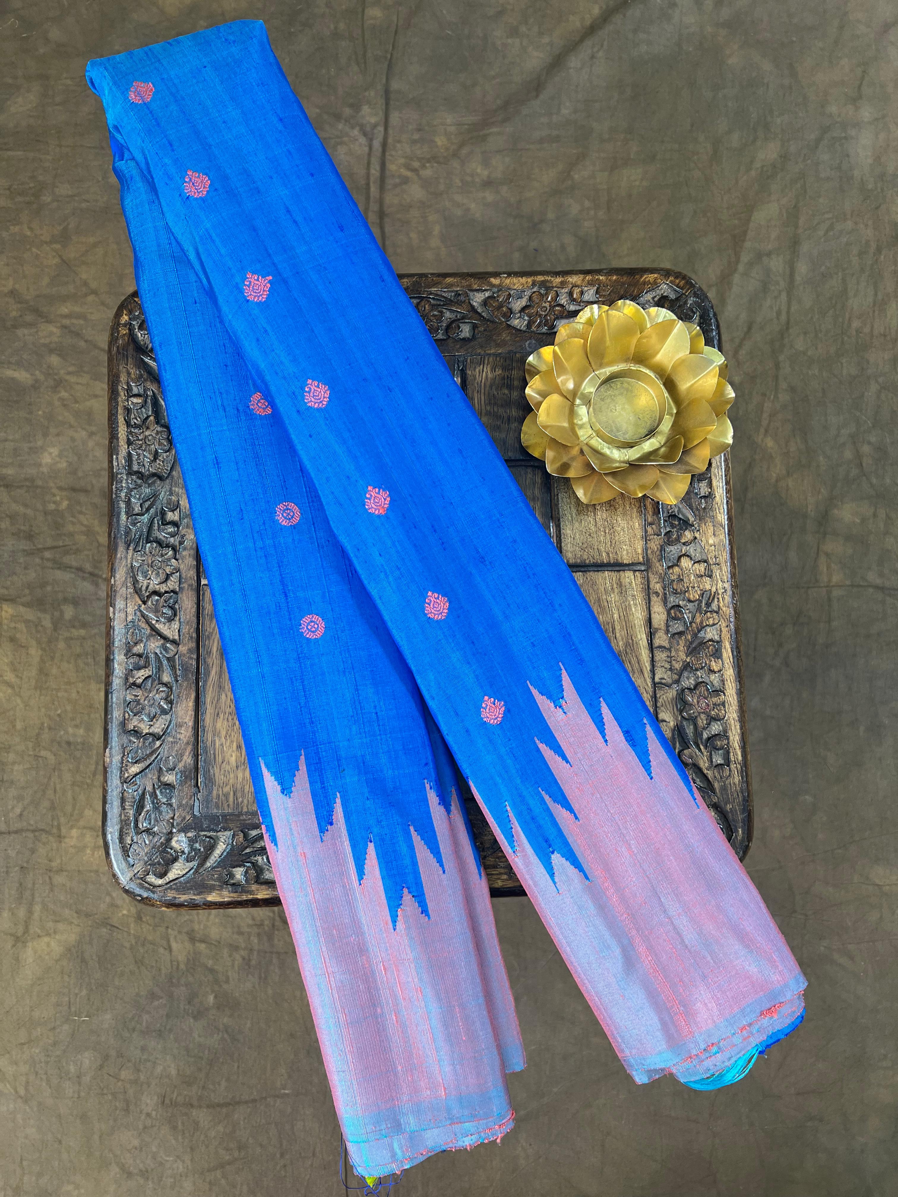Gadwal Pure Silk Handloom Saree, crafted from luxurious Dupion silk. A soft blue body sprinkled with peach buttas, paired with a striking dualeshade peach and blue pallu and temple border, all crafted without zari for a minimal and modern appeal. And a matching blouse, this Silk Mark certified saree stands out for its smooth, luxurious texture—perfect for those who appreciate subtle elegance with traditional charm.