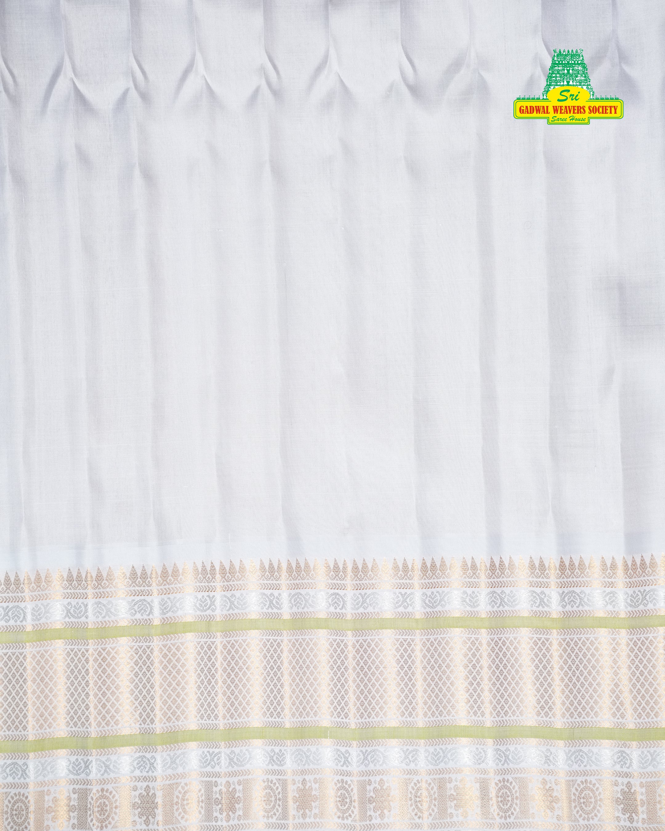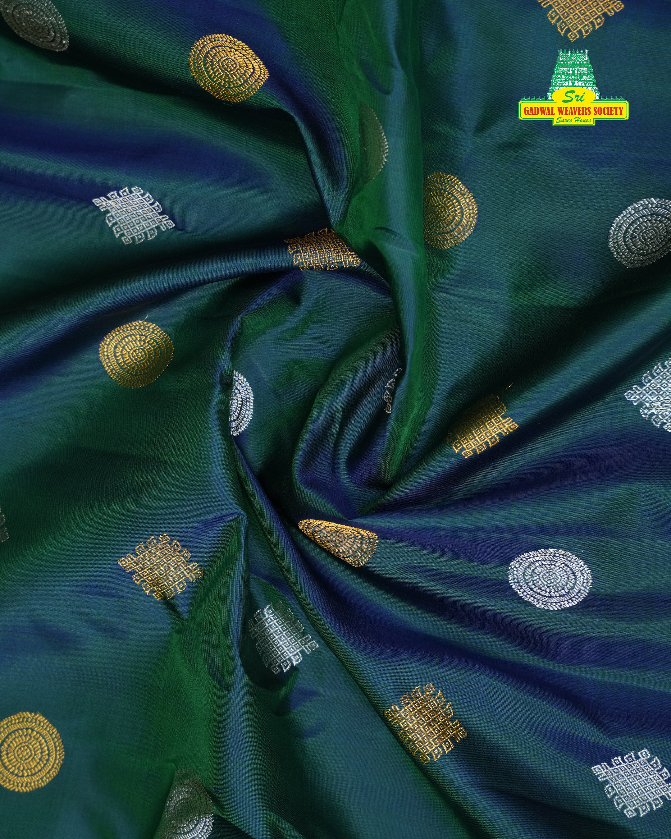 This is a Gadwal Pure Silk Equal Border Handloom Saree, beautifully woven in a bottle green colour. The body is adorned with delicate golden and silver buttas, while the contrasting lilac gold and silver zari border with a touch of light green adds elegance. The pallu features rich zari weaving in traditional motifs, showcasing the fine craftsmanship. A perfect blend of grace and tradition, ideal for festive and special occasions. Comes with a contrast blouse, making it a perfect choice for festive occasions and grand celebrations!. Silk Mark Certified.