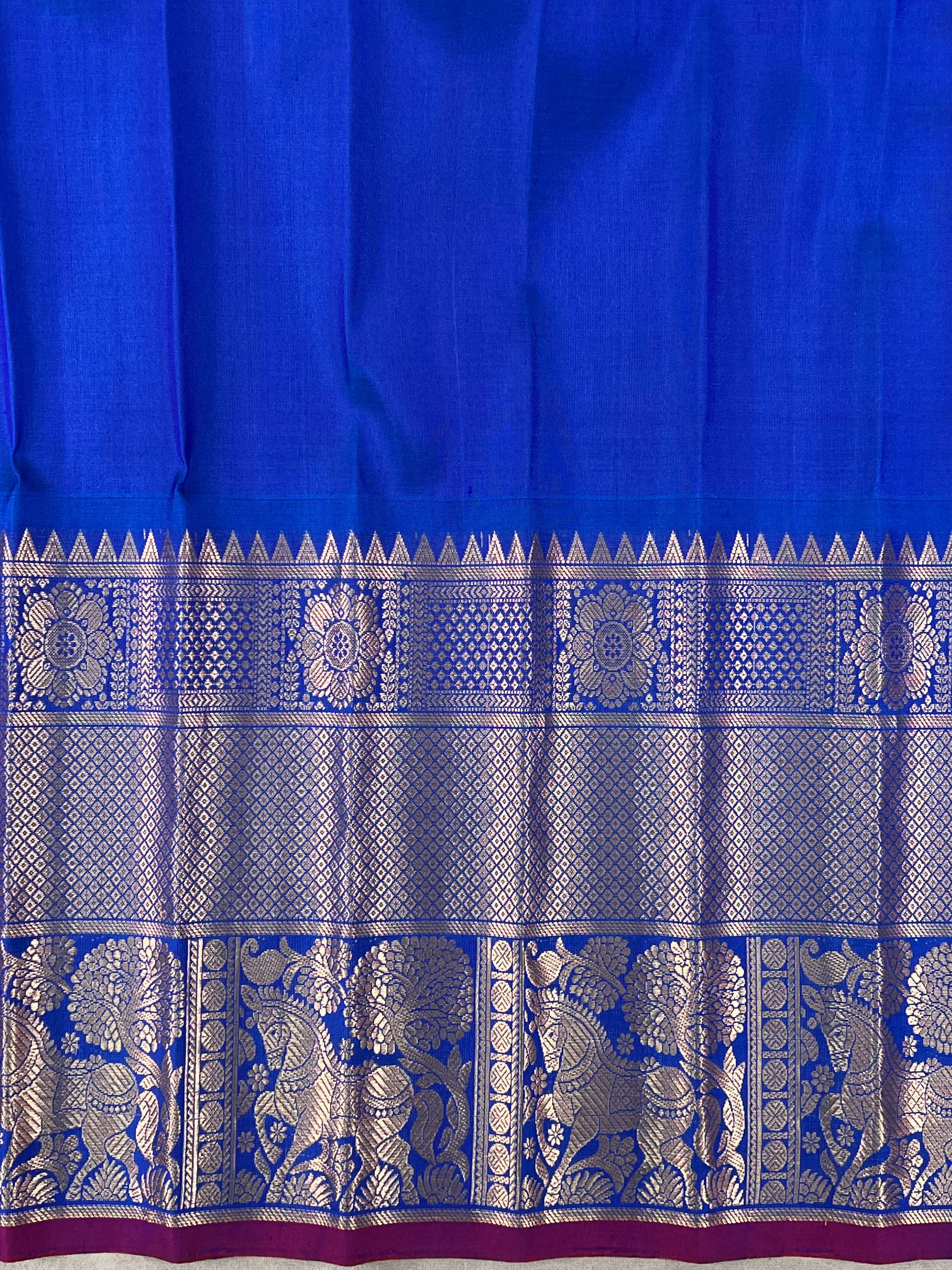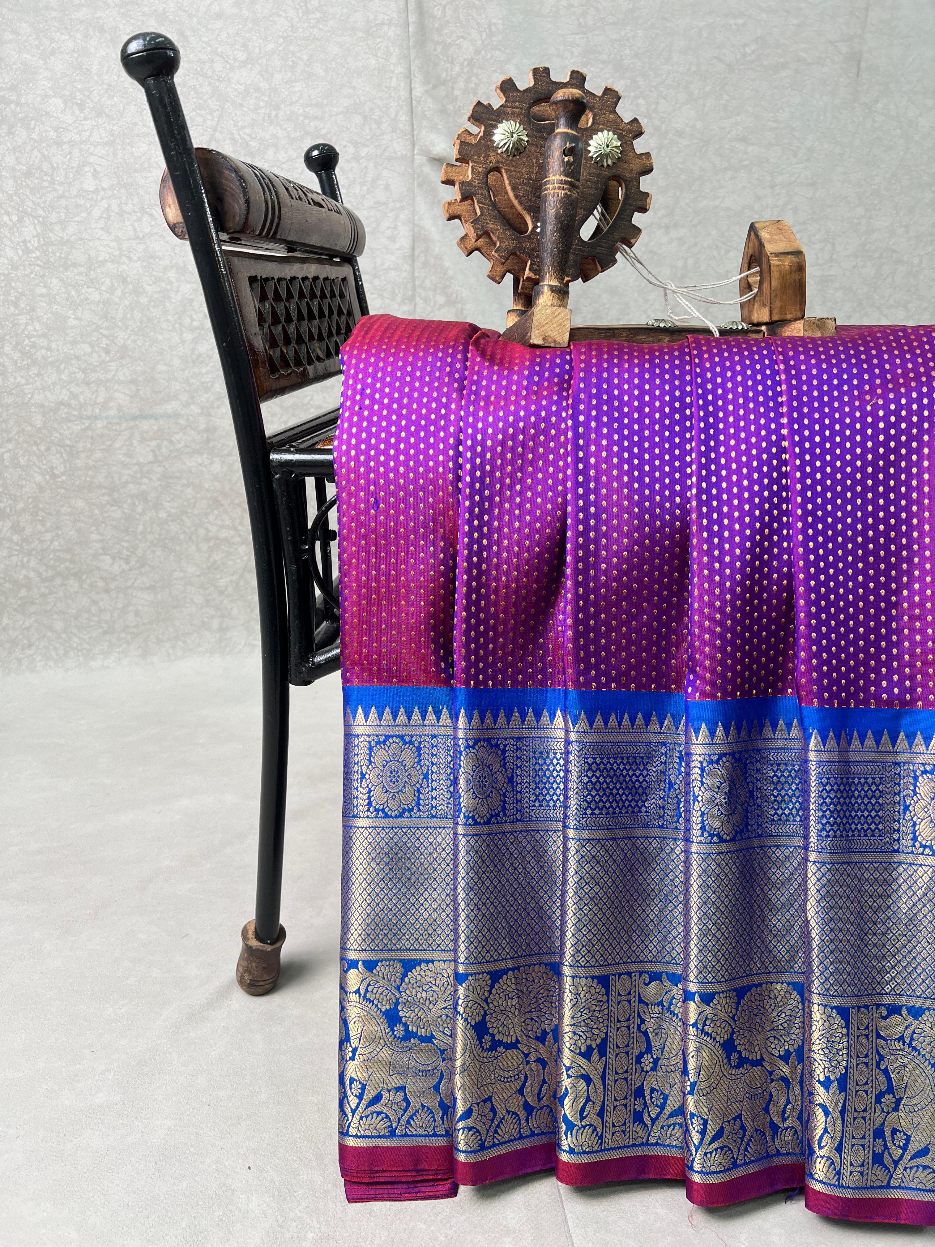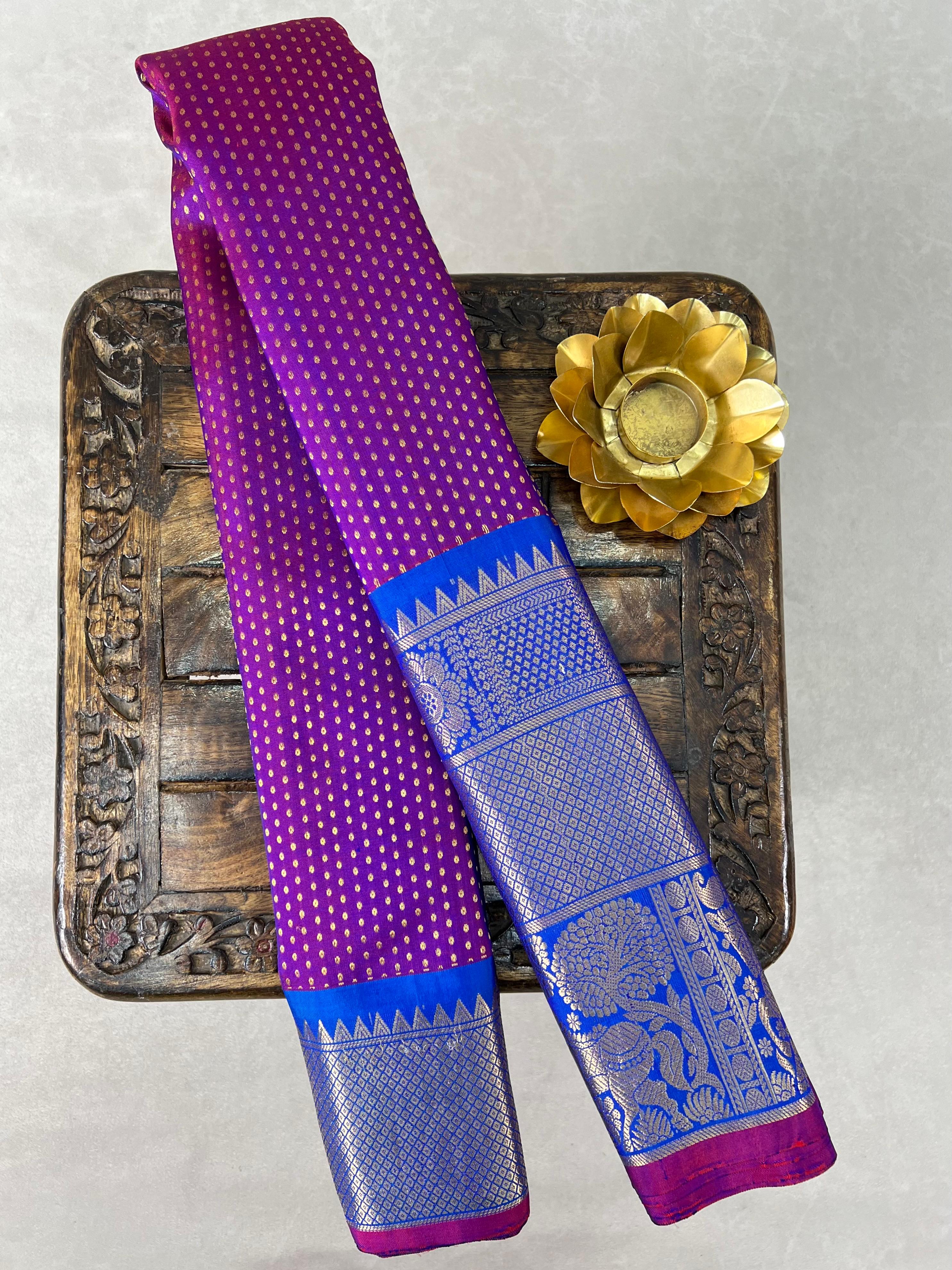 Exuding grace and traditional artistry, this Gadwal Pure Silk Handloom Saree features a soothing purple body adorned with delicate golden zari buttas. The rich sky blue border and pallu are intricately woven with elegant temple motifs and floral zari designs, adding a royal touch. Perfect for festive occasions and cultural celebrations. Comes with a contrast blouse, making it a perfect choice for festive occasions and grand celebrations!. Silk Mark Certified.