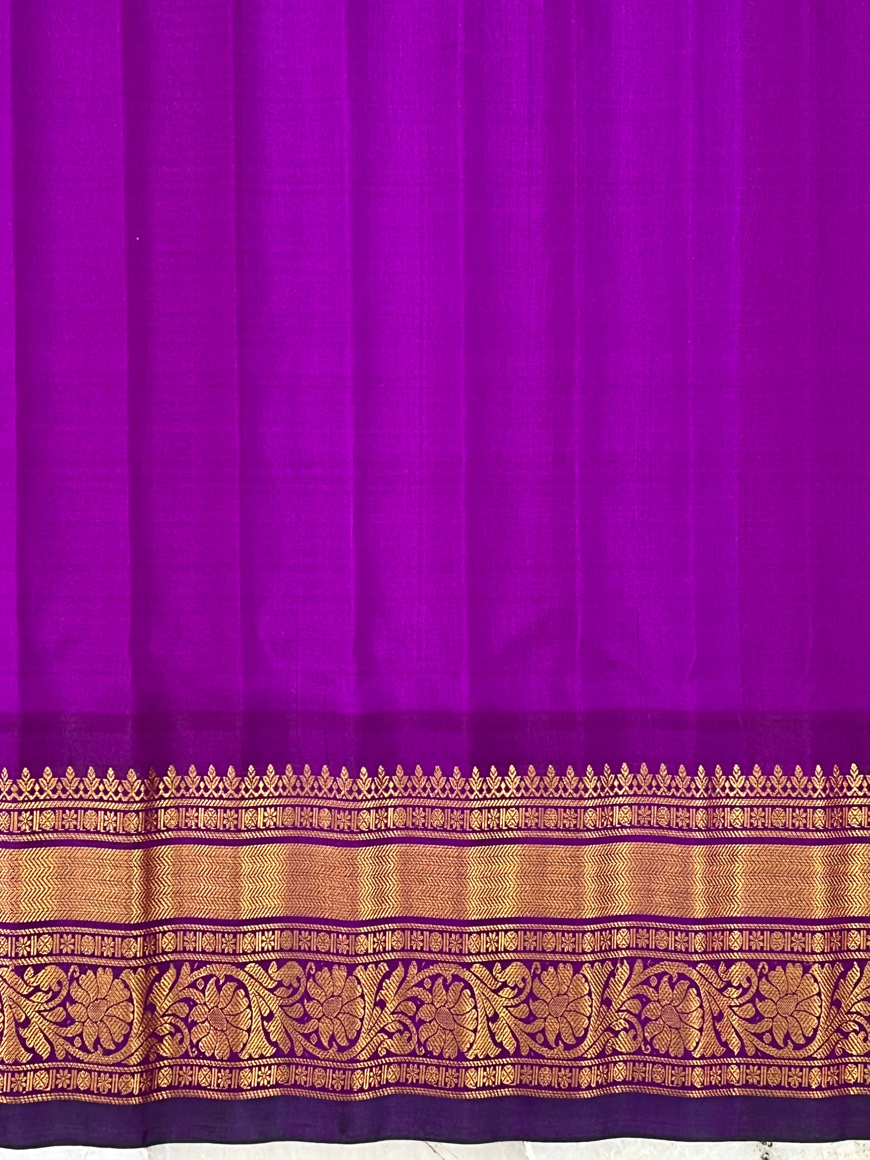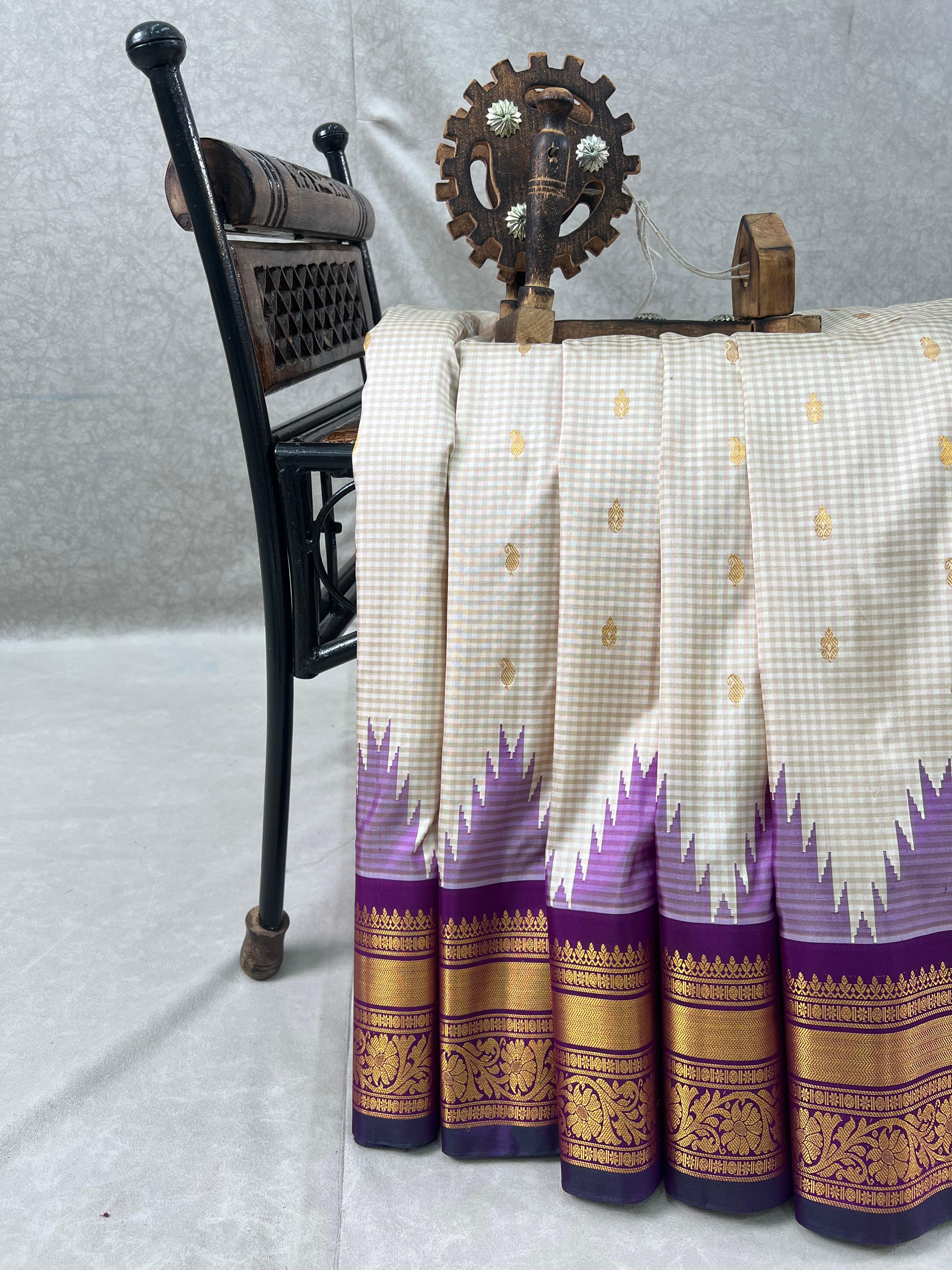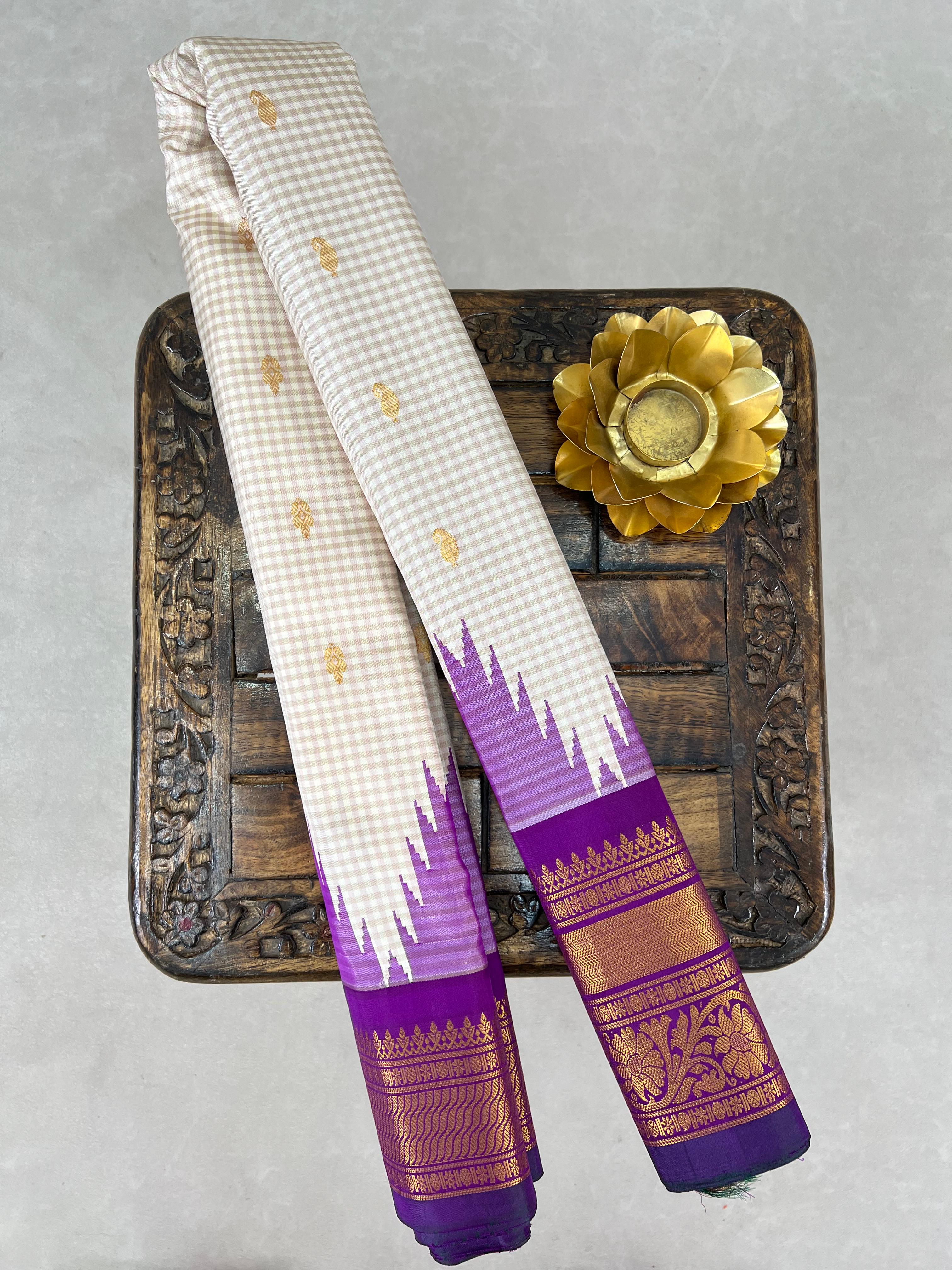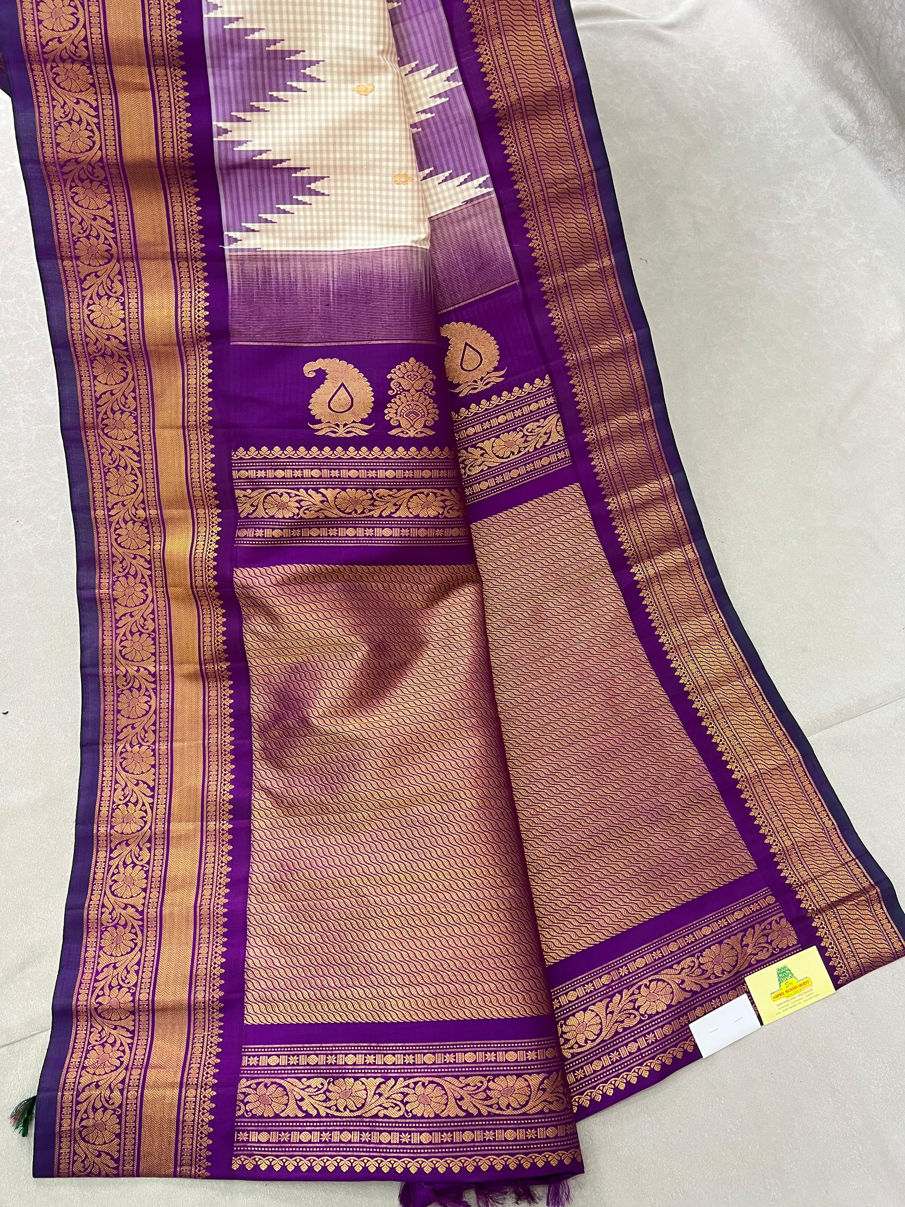 An elegant blend of tradition and charm, this Gadwal Pure Silk Handloom Saree features soft beige and white checks adorned with delicate zari buttas. The rich contrast purple border with intricate golden zari weaving adds a royal touch, while the signature Gadwal craftsmanship ensures unmatched finesse and drape. Perfect for festive and graceful occasions. Comes with a contrast blouse, making it a perfect choice for festive occasions and grand celebrations!. Silk Mark Certified.
