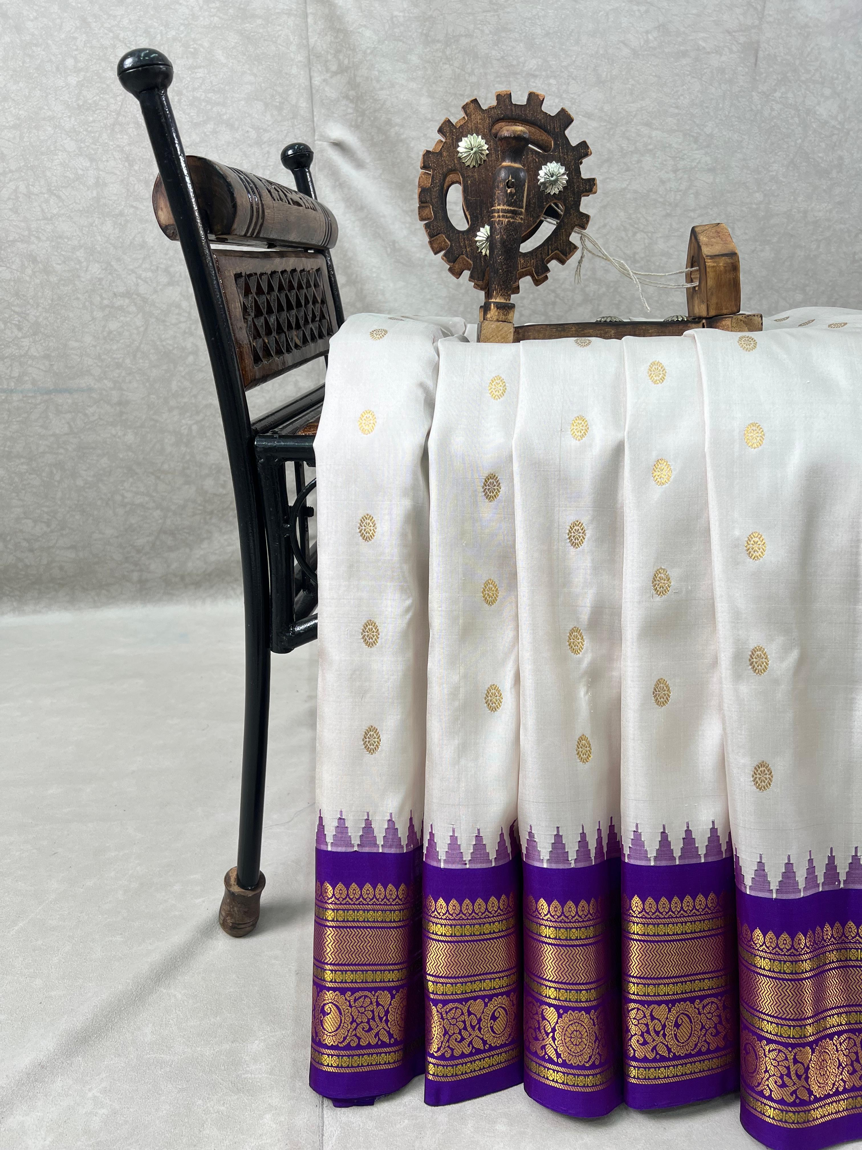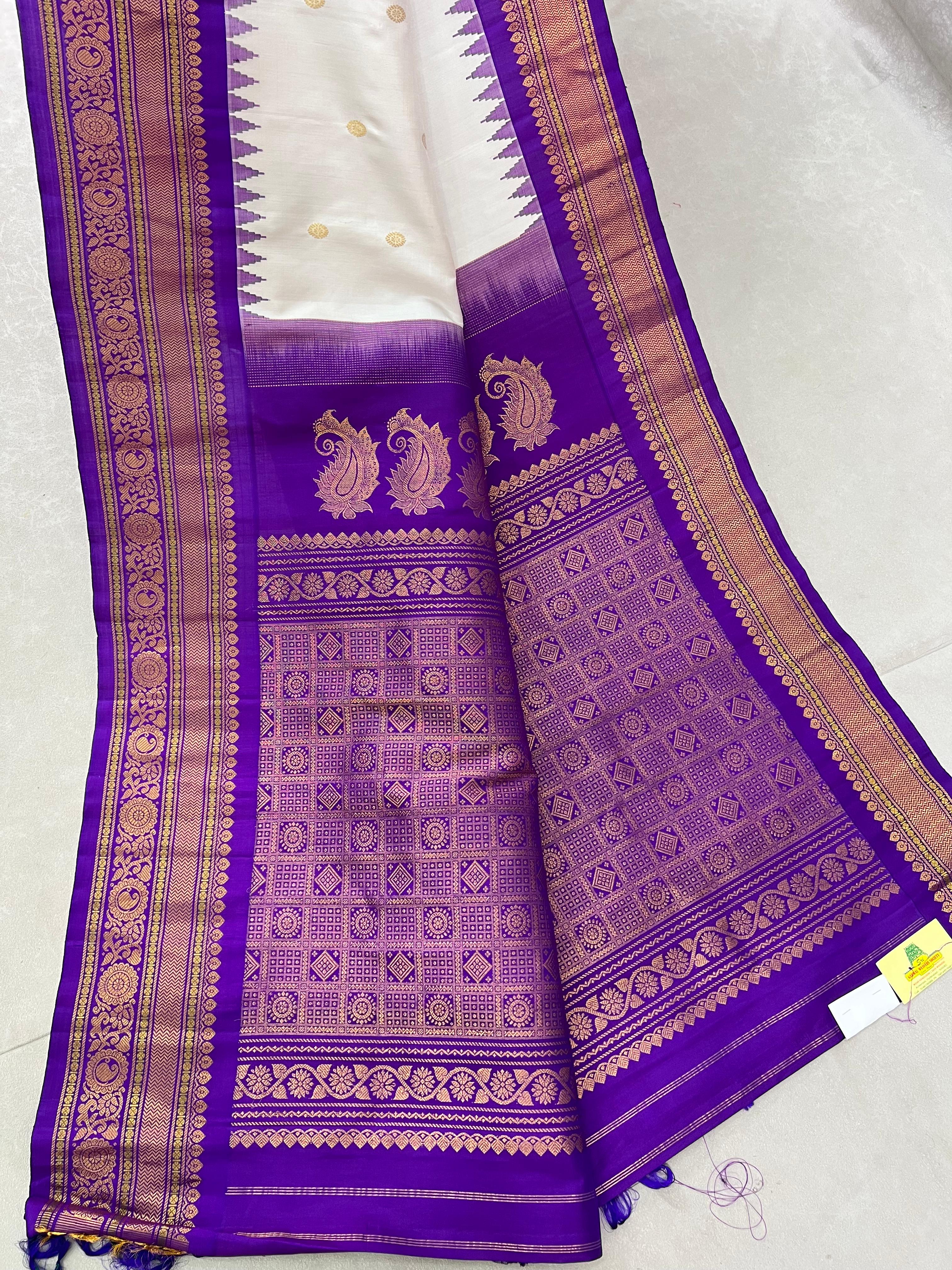 An elegant blend of tradition and charm, this Gadwal Pure Silk Handloom Saree features soft white adorned with delicate zari buttas. The rich contrast purple border with intricate golden zari weaving adds a royal touch, while the signature Gadwal craftsmanship ensures unmatched finesse and drape. Perfect for festive and graceful occasions. Comes with a contrast blouse, making it a perfect choice for festive occasions and grand celebrations!. Silk Mark Certified.