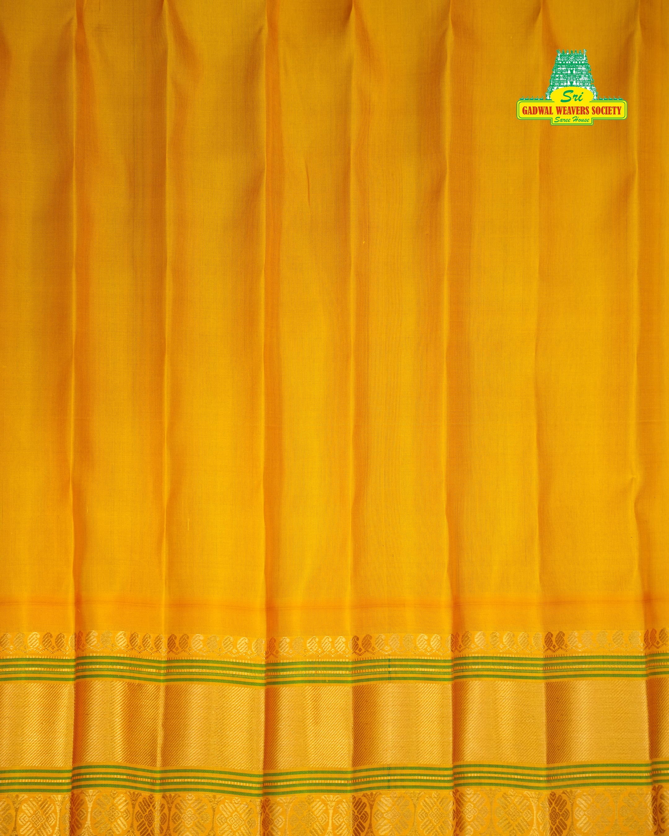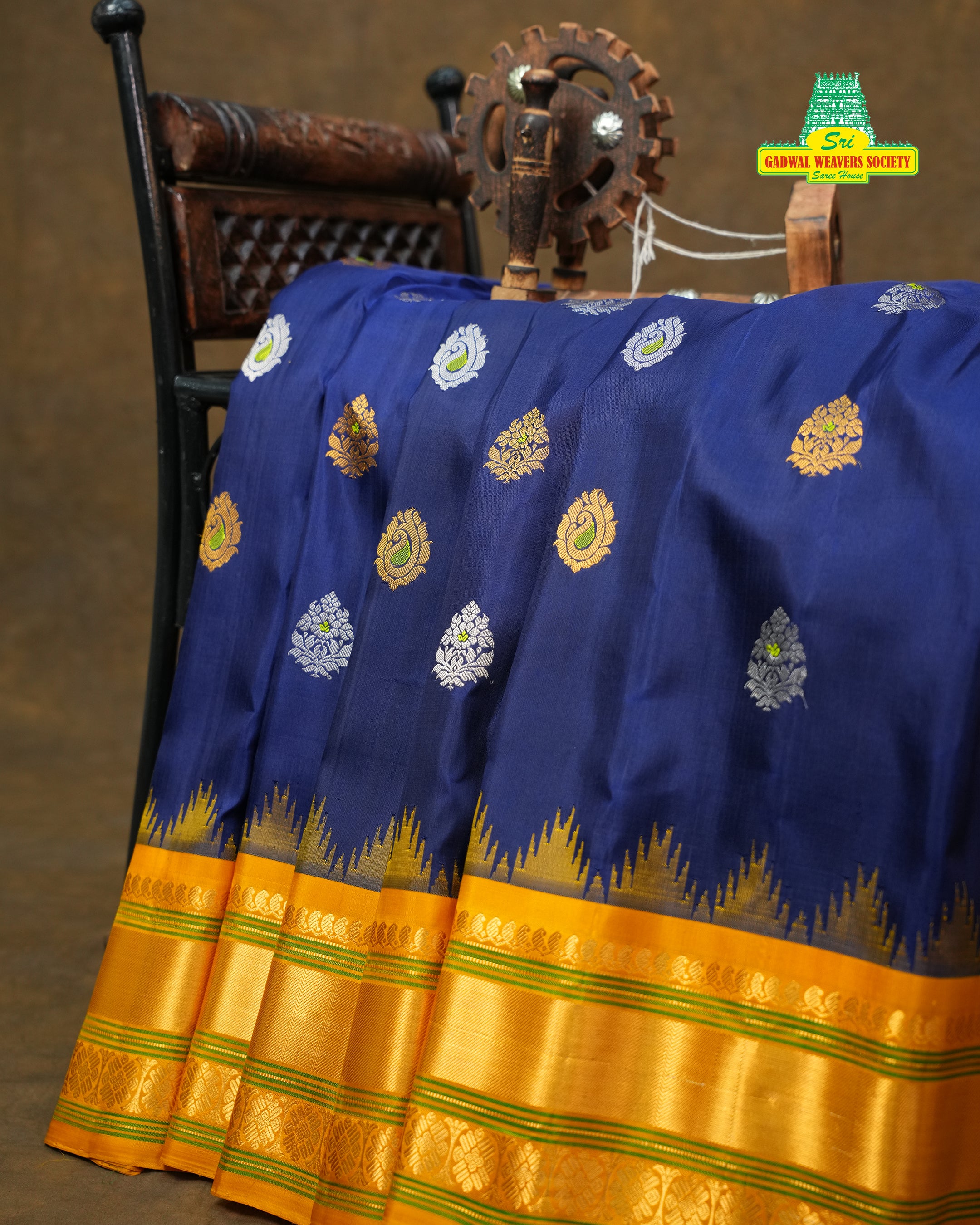 This exquisite Gadwal Handloom Silk Saree showcases timeless elegance with its rich royal blue body adorned with intricate Meena-style buttas. The vibrant contrast golden-yellow border is beautifully woven with temple motifs and zari detailing, adding a regal touch. Perfect for festive occasions and traditional celebrations, this saree reflects the unmatched artistry of Gadwal weavers. Pair with contrast blouse, and is Silk Mark certified for authenticity.