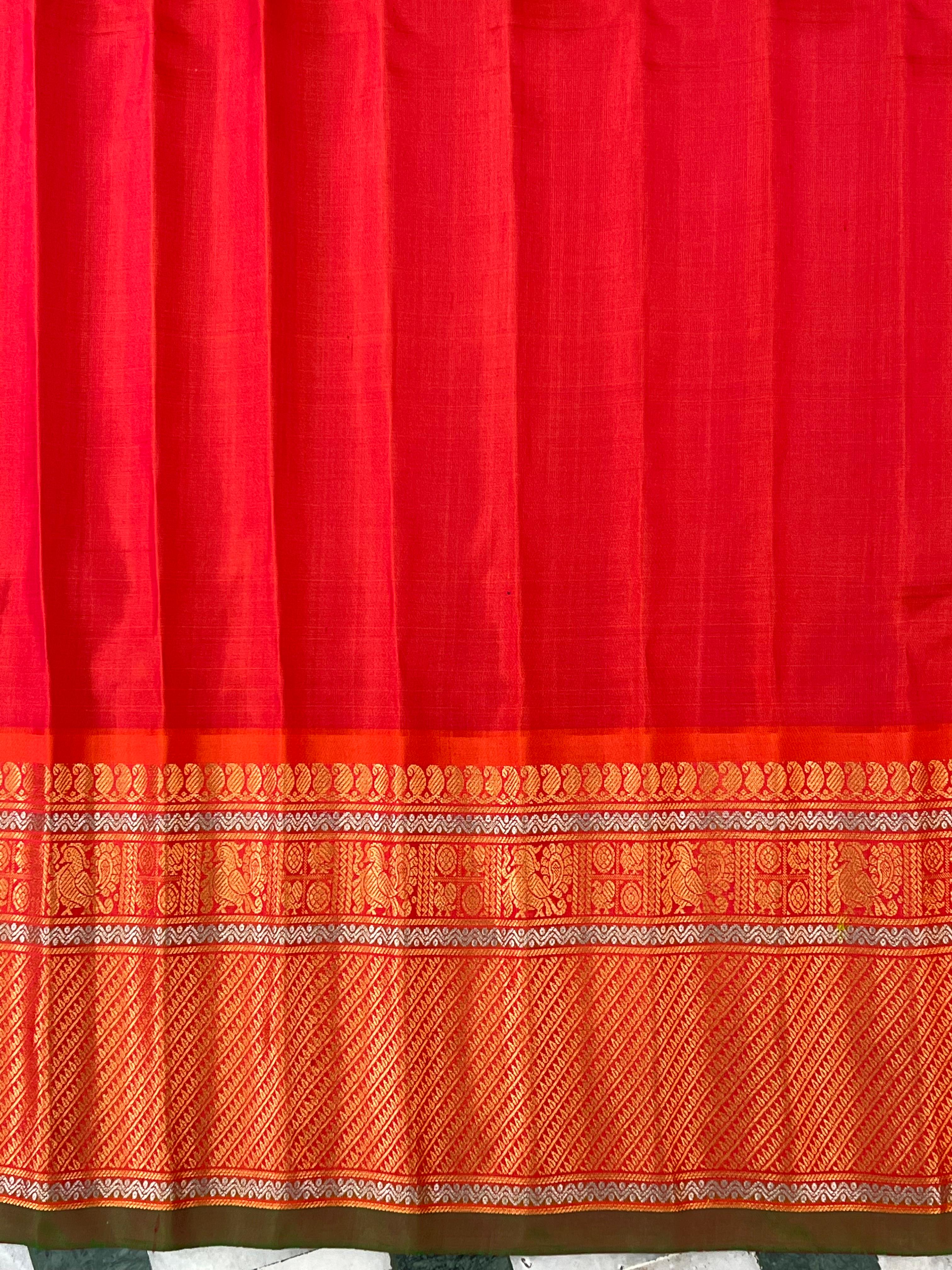This Gadwal Pure Silk Handloom saree, The saree features a bold big border with intricate butta patterns, making it a standout piece for any special occasion. The Dark blue body of the saree is adorned with Gold and Silver motifs, creating an elegant contrast with the vibrant Orange Borders, Comes with Green Selvedge The Silver and golden zari work on the border and pallu adds a regal touch. This saree is perfect for celebrations or festive events, combining traditional artistry with contemporary appeal. The intricate patterns, especially the peacock motifs, are carefully woven, showcasing the expertise of Gadwal weavers. The saree's luxurious fabric and timeless design ensure it remains a symbol of culture and beauty. this saree comes with Contrast Blouse and it is silk mark certified.