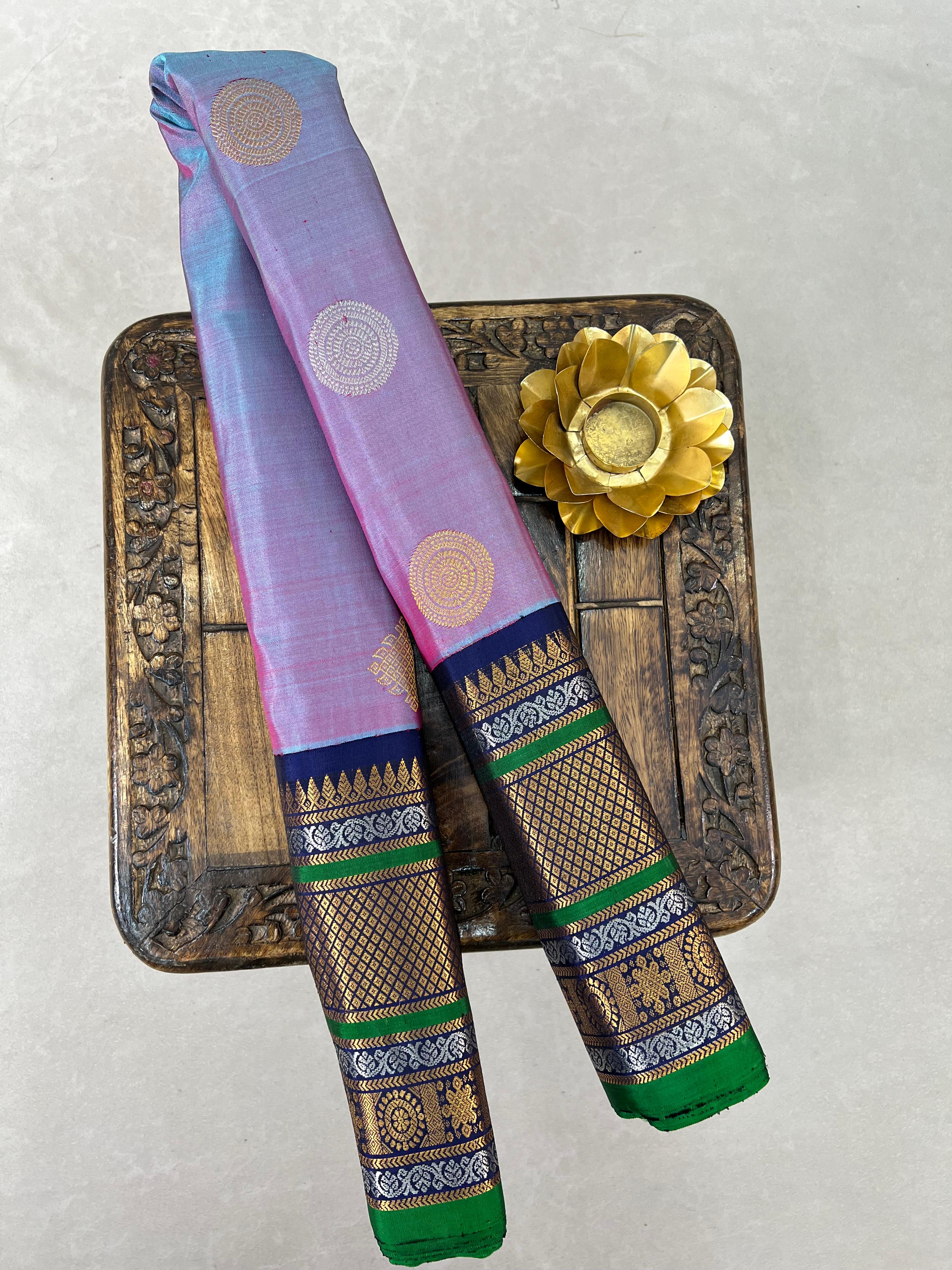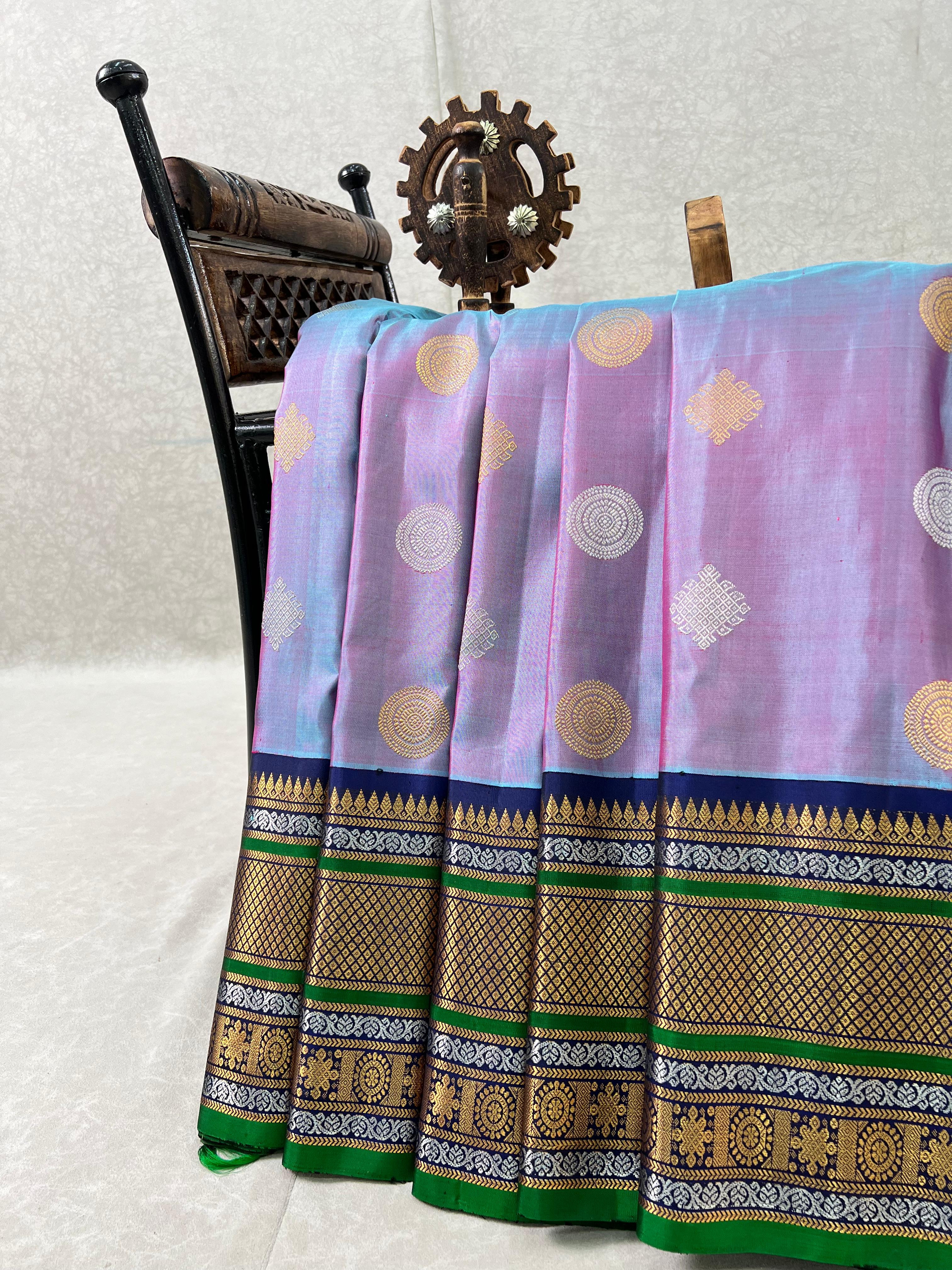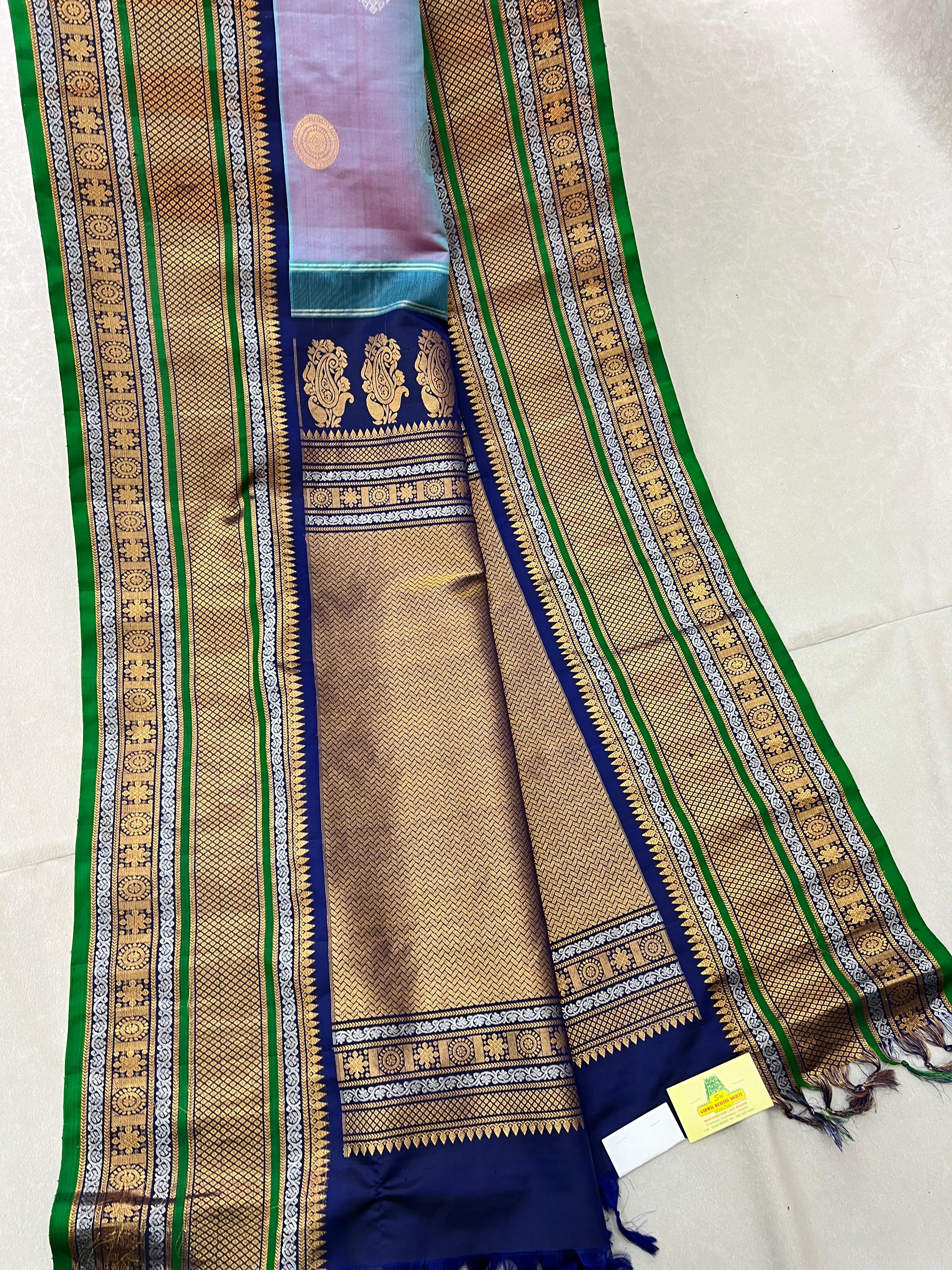 This exquisite Gadwal Butta Pure Silk Handloom Saree beautifully showcases the timeless craftsmanship of Gadwal weaving. The body features a graceful blend of pastel shades, adorned with finely woven gold and silver buttas, adding a touch of shimmering elegance to the drape. Each butta is intricately designed, reflecting the meticulous artistry of skilled weavers. The border stands out with its rich detailing - a striking green line on the border that enhances the overall contrast. Below it flows a grand blue border followed by a deep green panel, enriched with traditional Silver and Gold zari motifs, geometric patterns, and floral accents. The combination of these vibrant hues with the luxurious zari work gives the saree a regal charm, making it perfect for festive occasions, weddings, and special celebrations. This saree comes with Contrast Blouse and it is silk mark certified.