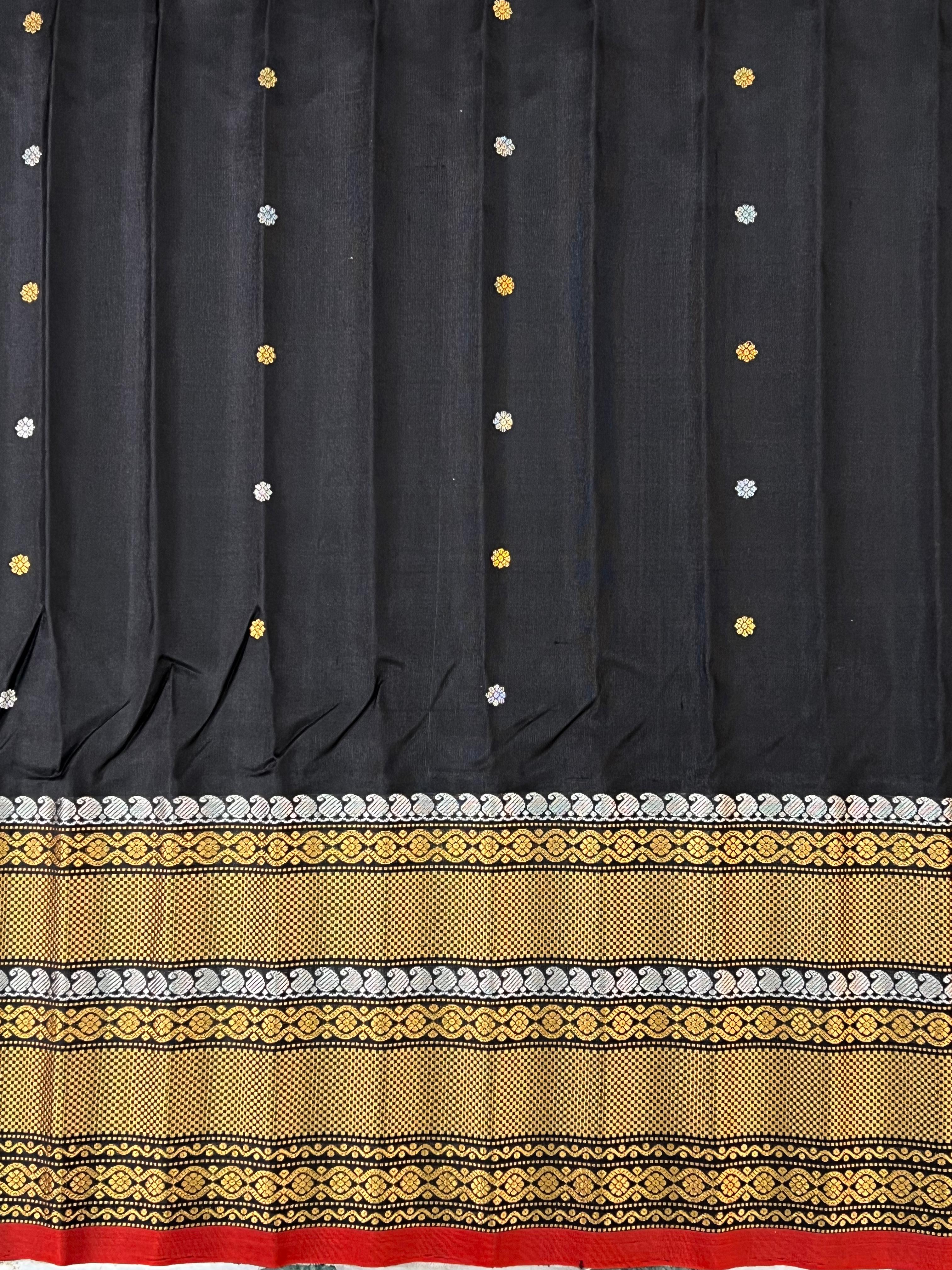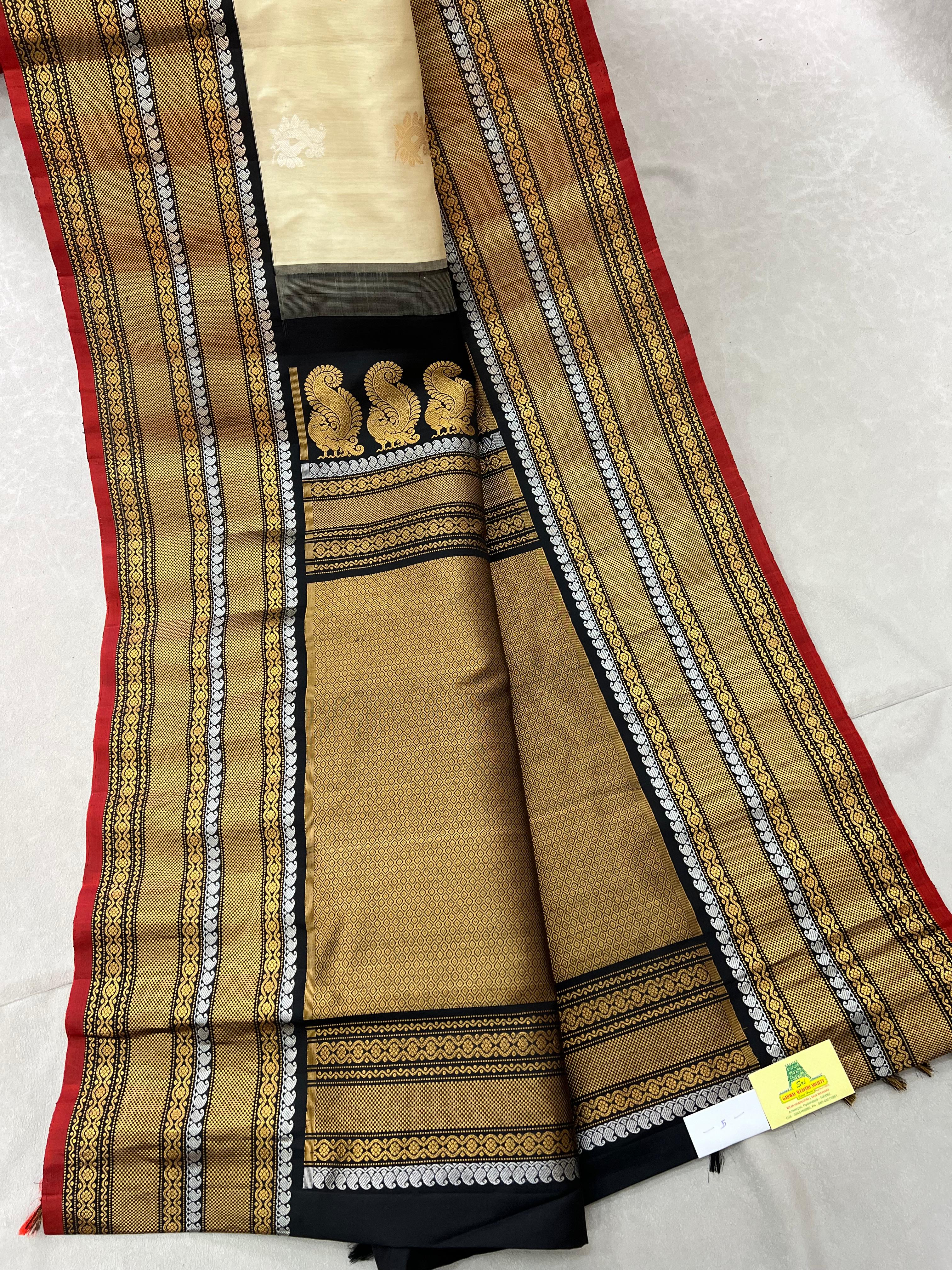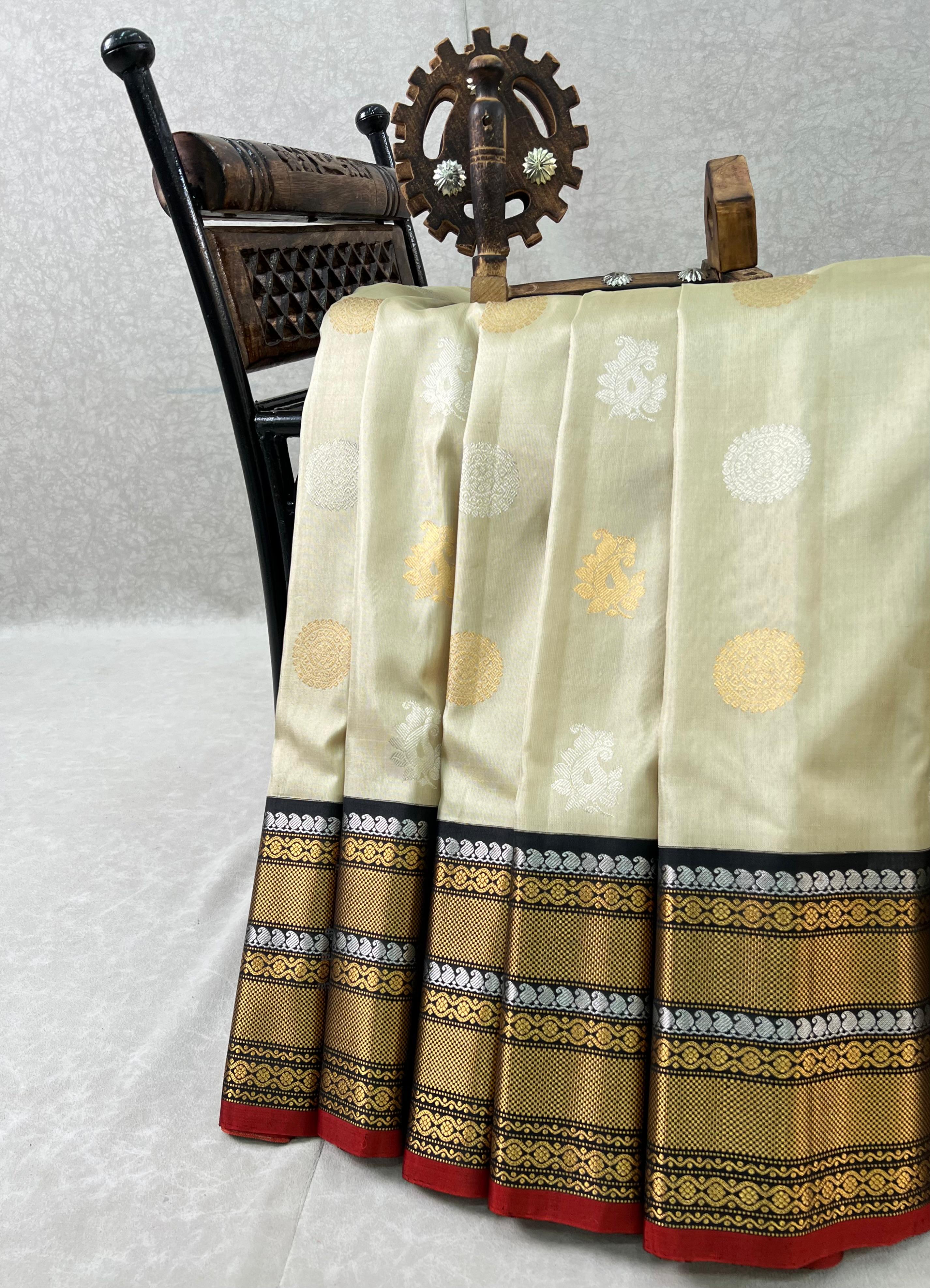 This elegant Gadwal Pure Silk Handloom Saree features a serene cream body adorned with intricately woven gold and silver buttas, including round motifs and paisley-inspired designs that add a refined touch of traditional artistry. The subtle sheen of the silk enhances the beauty of these zari patterns, making the saree look effortlessly graceful. Complementing the soft body is a richly crafted black and gold zari border, highlighted with alternating silver and gold weaving, traditional geometric textures, and intricate motifs that reflect the mastery of Gadwal craftsmanship. The border is finished with a striking Orange selvedge, adding a bold contrast that elevates the saree’s regal appeal. Perfect for weddings, festive occasions, and grand celebrations, this saree embodies timeless elegance, luxury, and the enduring charm of handloom weaving. This saree comes with Contrast Blouse and it is silk mark certified.