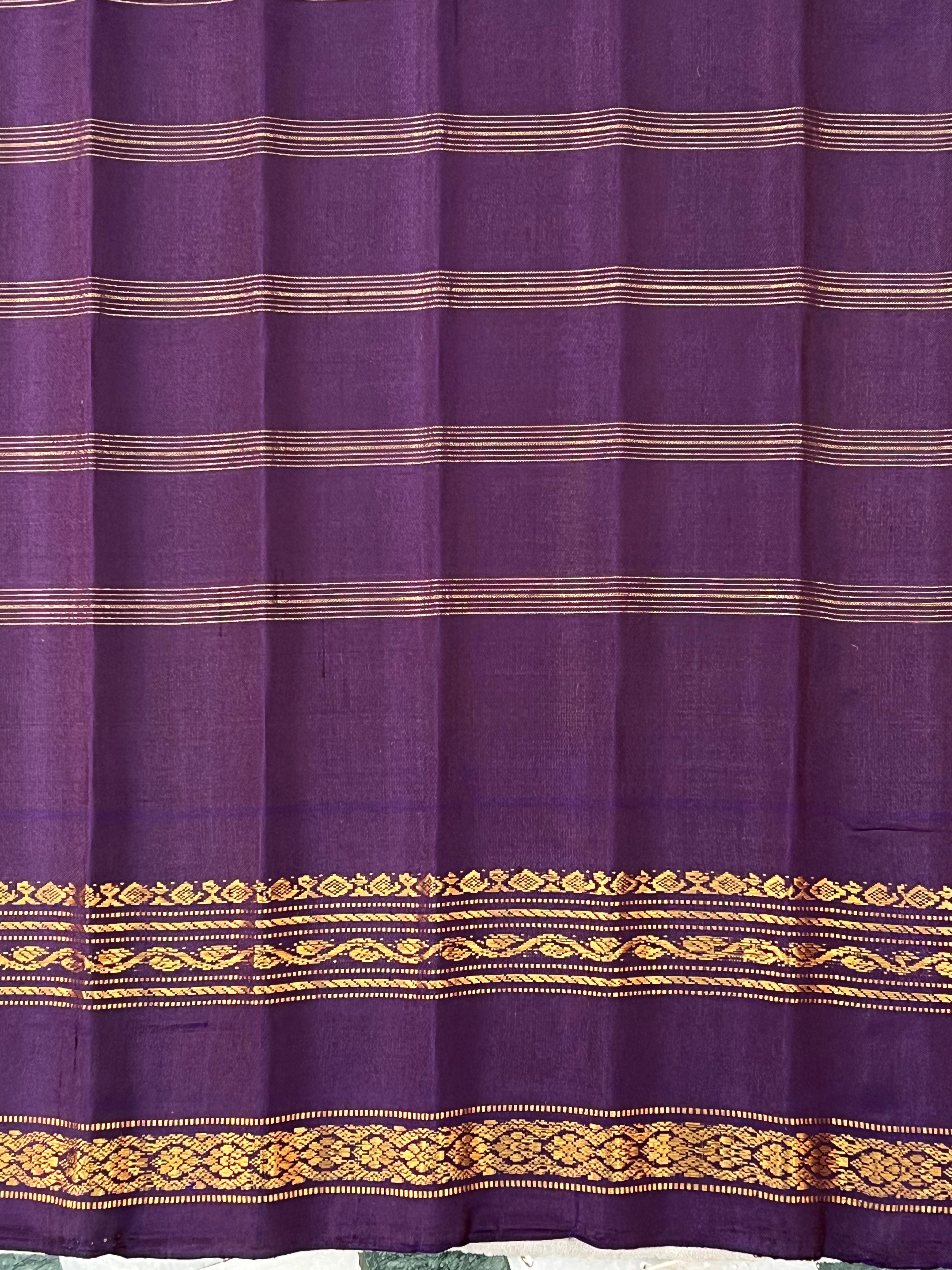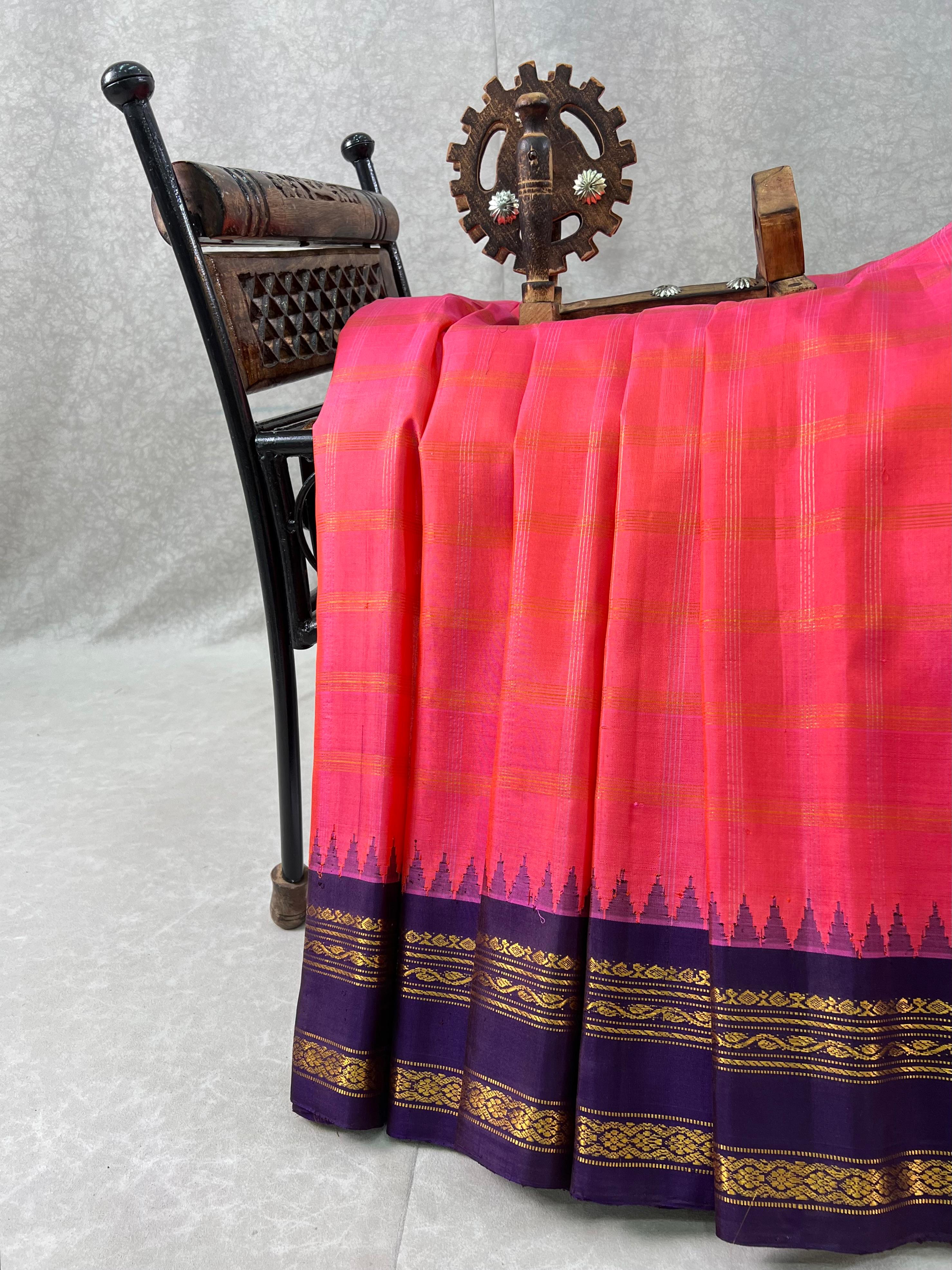 This exquisite Gadwal Pure Silk Handloom Saree features a dual shade pink and orange body adorned with delicate silver and gold zari checks, exuding timeless elegance. The highlight of the saree is temple design and Dark purple gold zari gap border. Perfect for festive and traditional occasions, this saree reflects the classic craftsmanship and royal charm of Gadwal handlooms. Pair it with a contrast blouse, and rest assured, it is Silk Mark certified for authenticity.