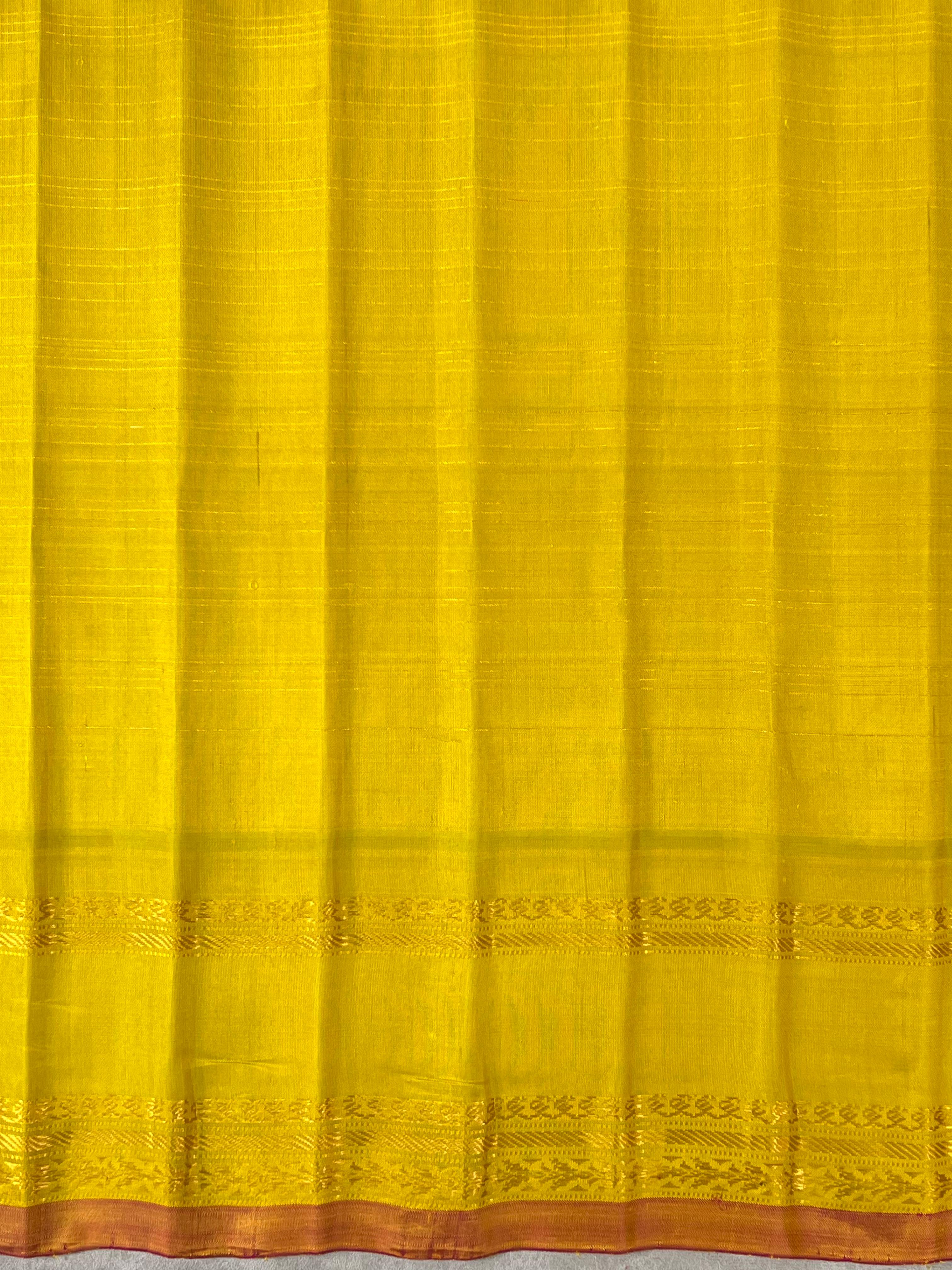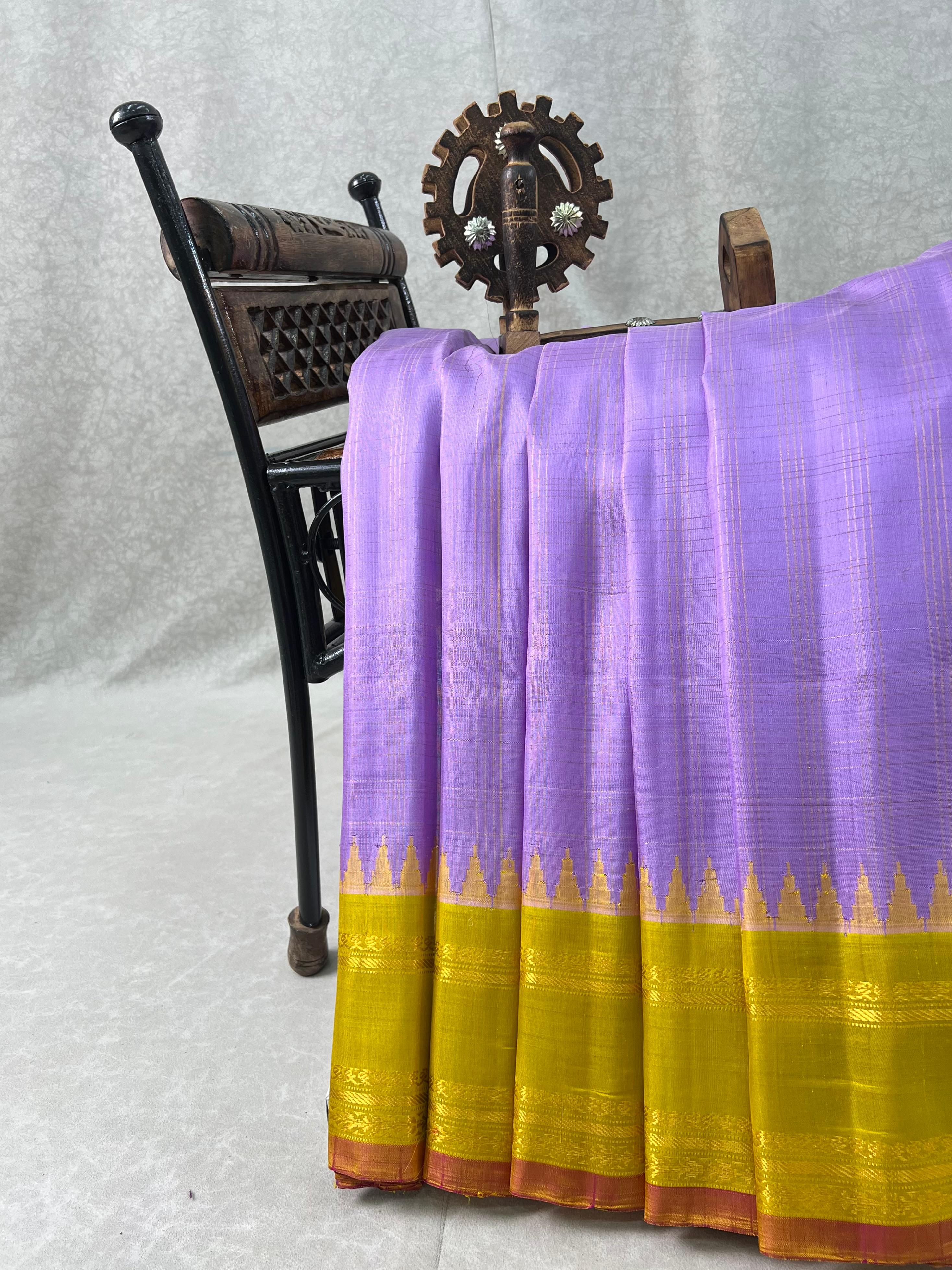 This exquisite Gadwal Pure Silk Handloom Saree features a Bright Lavender body adorned with delicate gold zari checks, exuding timeless elegance. The highlight of the saree is temple design and Yellow gold zari gap border following with Pink Selvedge. Perfect for festive and traditional occasions, this saree reflects the classic craftsmanship and royal charm of Gadwal handlooms. Pair it with a contrast blouse, and rest assured, it is Silk Mark certified for authenticity.