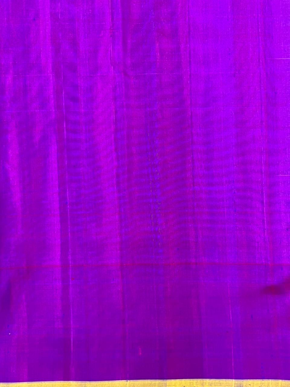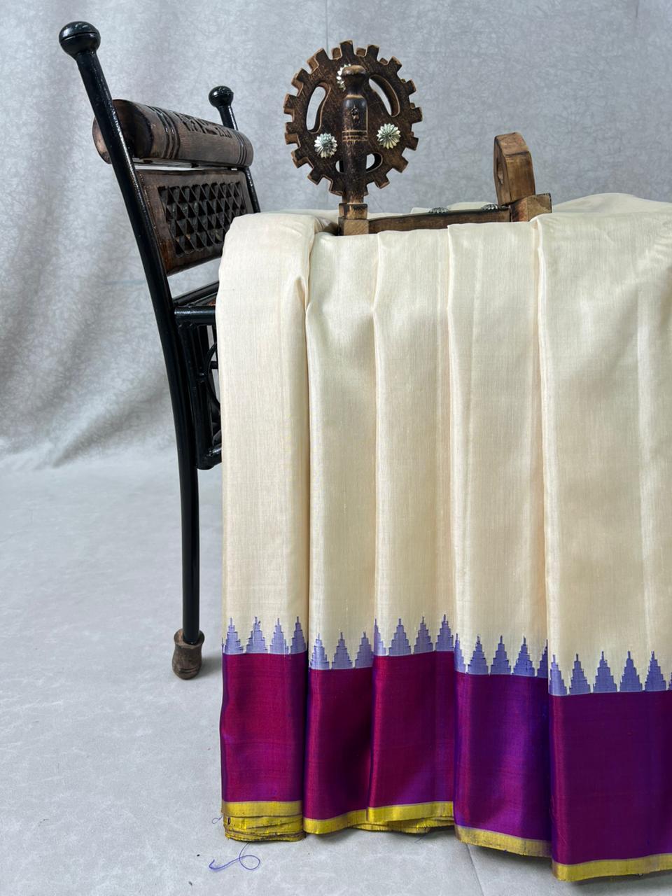 This Gadwal Pure Silk Handloom saree features a Cream body, creating an elegant contrast with the vibrant Purple border and yellow selvedge. Perfect for celebrations or festive events, this saree beautifully combines traditional artistry with contemporary appeal. Its luxurious fabric and timeless design ensure it remains a symbol of culture and elegance. This saree comes with a contrast blouse and is Silk Mark certified.