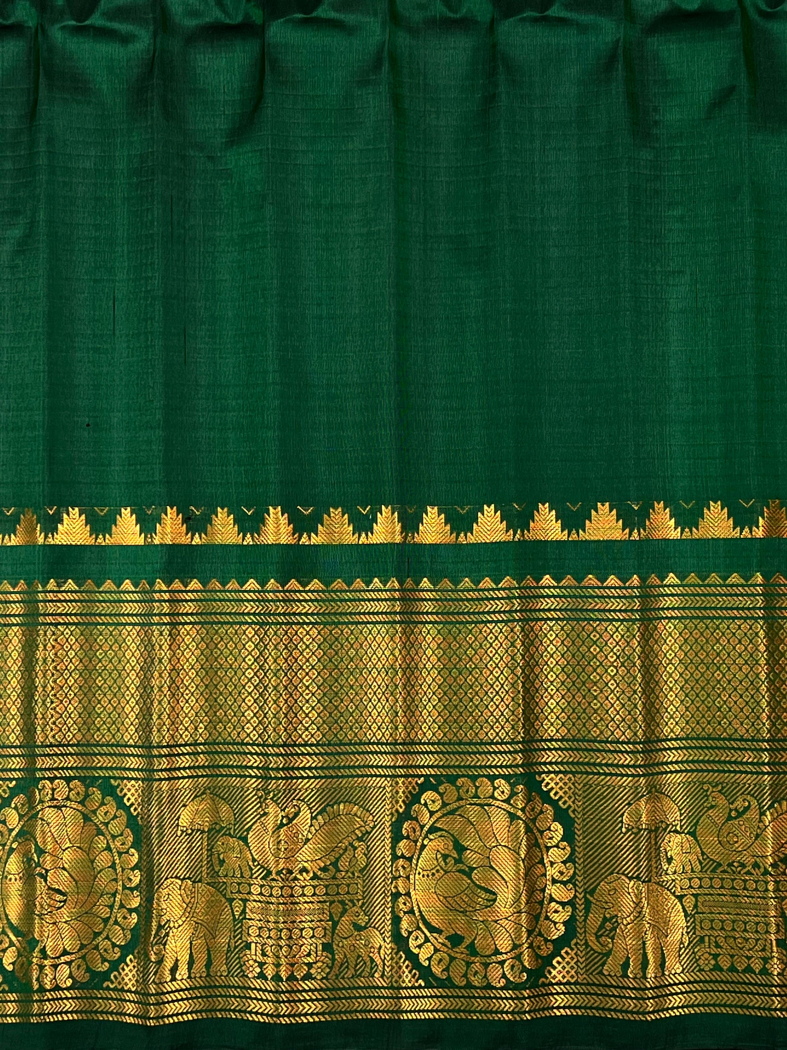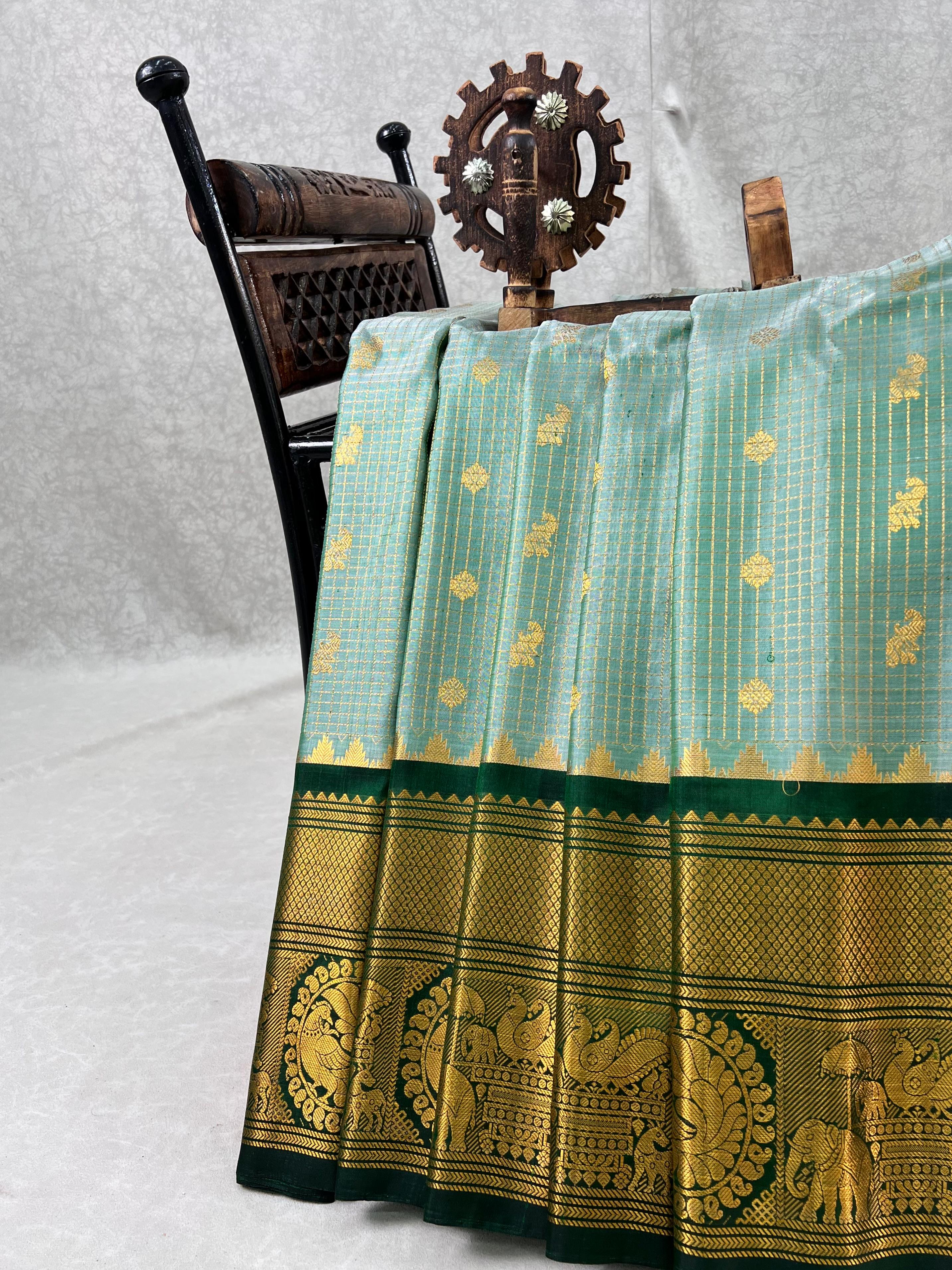 This exquisite Gadwal Pure Silk Handloom Saree features a Mint green body adorned with elegant gold zari checks and delicately woven gold buttas, showcasing the timeless beauty of traditional craftsmanship. The saree is elevated by its striking big dark green border, intricately designed with shimmering gold zari that adds a bold and regal contrast, this saree is perfect for weddings, festive occasions, and cultural celebrations. A true blend of heritage, luxury, and elegance. Paired with a contrast blouse and it is Silk mark certified.