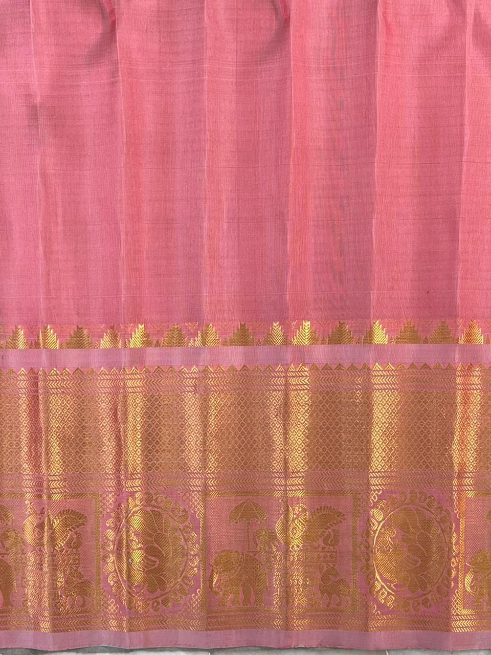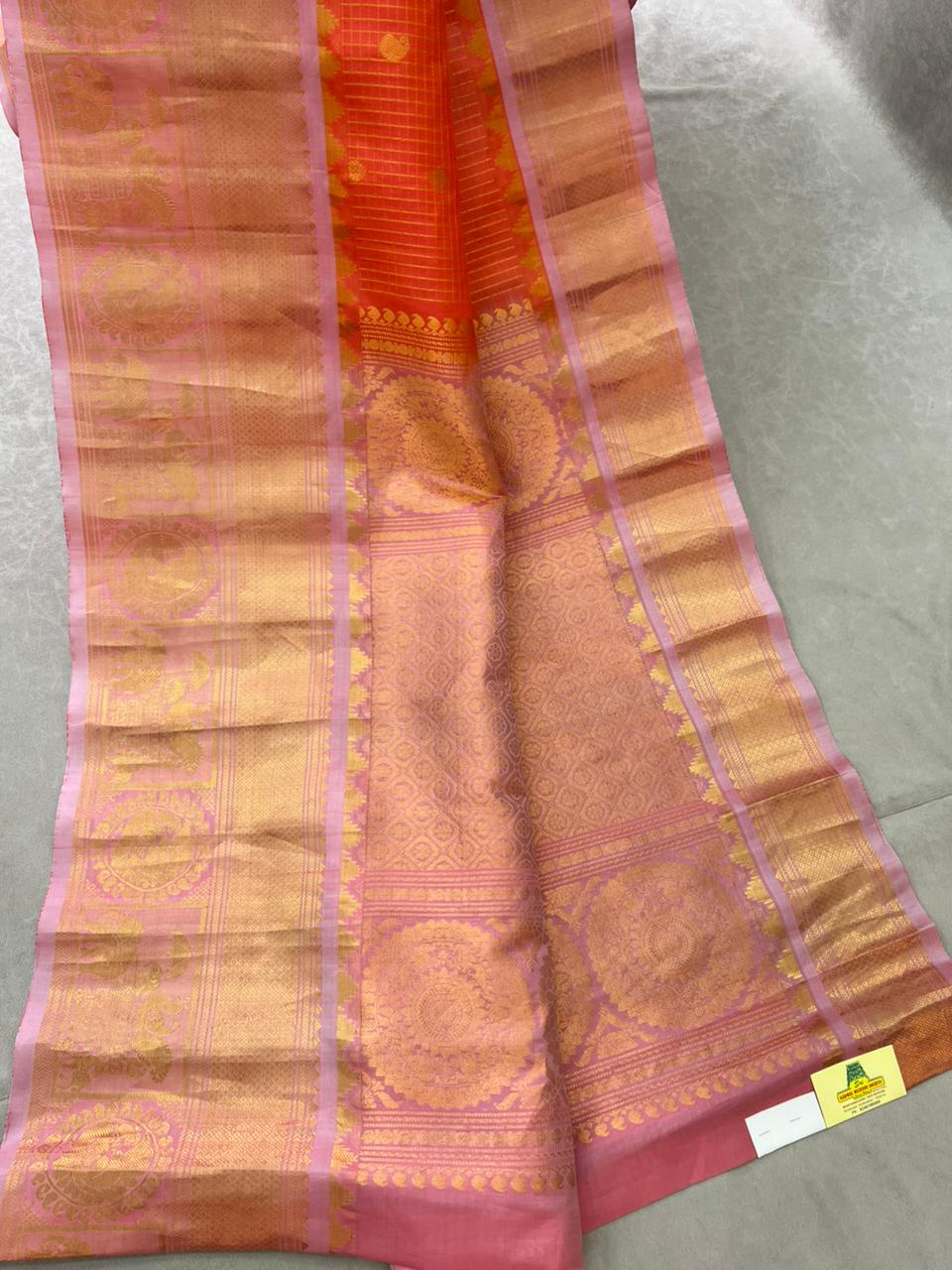 This exquisite Gadwal Pure Silk Handloom Saree features a Red Orange body adorned with elegant gold zari checks and delicately woven gold buttas, showcasing the timeless beauty of traditional craftsmanship. The saree is elevated by its striking big Baby pink border, intricately designed with shimmering gold zari that adds a bold and regal contrast, this saree is perfect for weddings, festive occasions, and cultural celebrations. A true blend of heritage, luxury, and elegance. Paired with a contrast blouse and it is Silk mark certified.