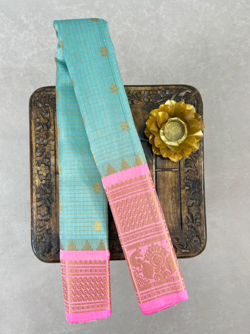 This exquisite Gadwal Pure Silk Handloom Saree features a Blue ice body adorned with elegant gold zari checks and delicately woven gold buttas, showcasing the timeless beauty of traditional craftsmanship. The saree is elevated by its striking big Baby pink border, intricately designed with shimmering gold zari that adds a bold and regal contrast, this saree is perfect for weddings, festive occasions, and cultural celebrations. A true blend of heritage, luxury, and elegance. Paired with a contrast blouse and it is Silk mark certified.