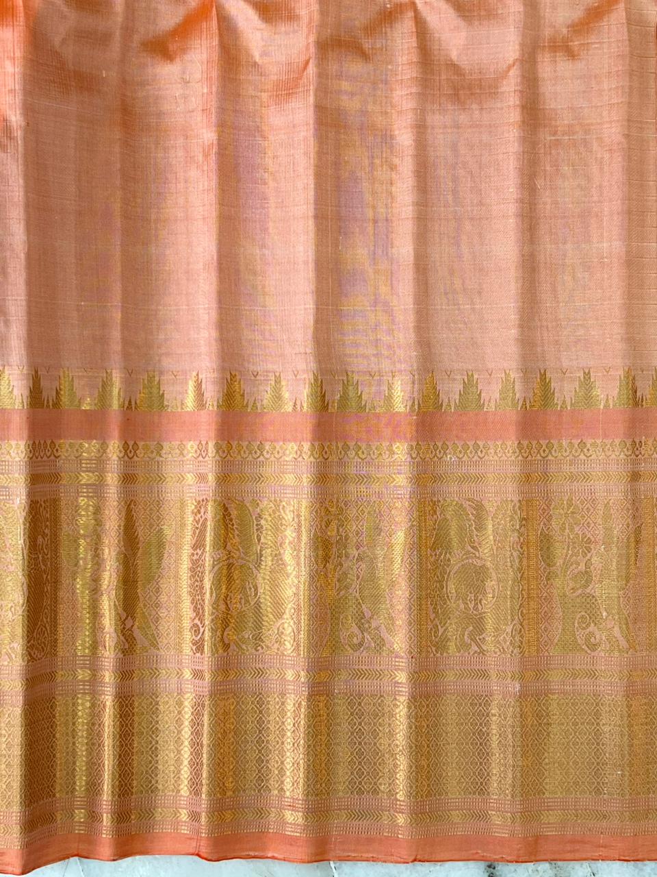 This exquisite Gadwal Pure Silk Handloom Saree features a Lime green body adorned with elegant gold zari checks and delicately woven gold buttas, showcasing the timeless beauty of traditional craftsmanship. The saree is elevated by its striking big Bright Orange border, intricately designed with shimmering gold zari that adds a bold and regal contrast, this saree is perfect for weddings, festive occasions, and cultural celebrations. A true blend of heritage, luxury, and elegance. Paired with a contrast blouse and it is Silk mark certified.