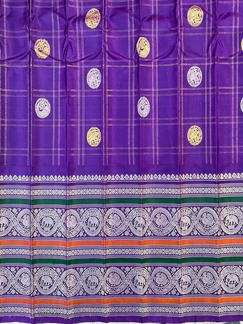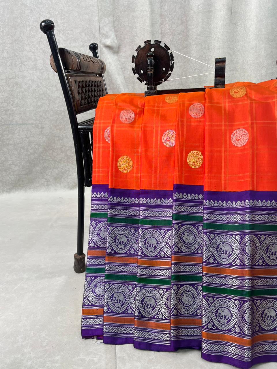 This exquisite Gadwal Pure Silk Handloom Saree features a Bright Orange body adorned with elegant zari motifs with checks, beautifully complemented by a contrasting Purple colour border woven with intricate elephant and floral thread patterns and Multi color stripes and thread weaving. The rich silk texture and traditional craftsmanship reflect timeless elegance, making it a perfect choice for weddings, festive occasions, and cultural celebrations. Comes with a contrast blouse, making it a perfect choice for festive occasions and grand celebrations!. Silk Mark Certified.