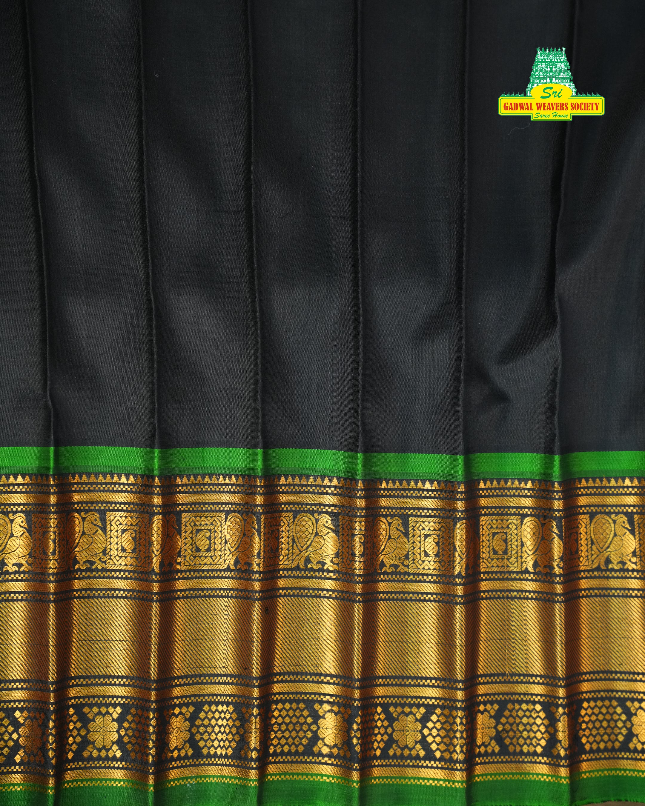 This elegant Gadwal Pure Silk Handloom Saree features a vibrant Lavender body adorned and beautifully enhanced with delicate Gold buttas. The saree is complemented by a Deep Black border with intricate gold zari detailing comes with Green selvedge, adding a striking traditional contrast. A perfect blend of heritage and elegance, ideal for weddings, festive occasions, and special celebrations. This saree comes with contrast Blouse, and it is Silk mark Certified.