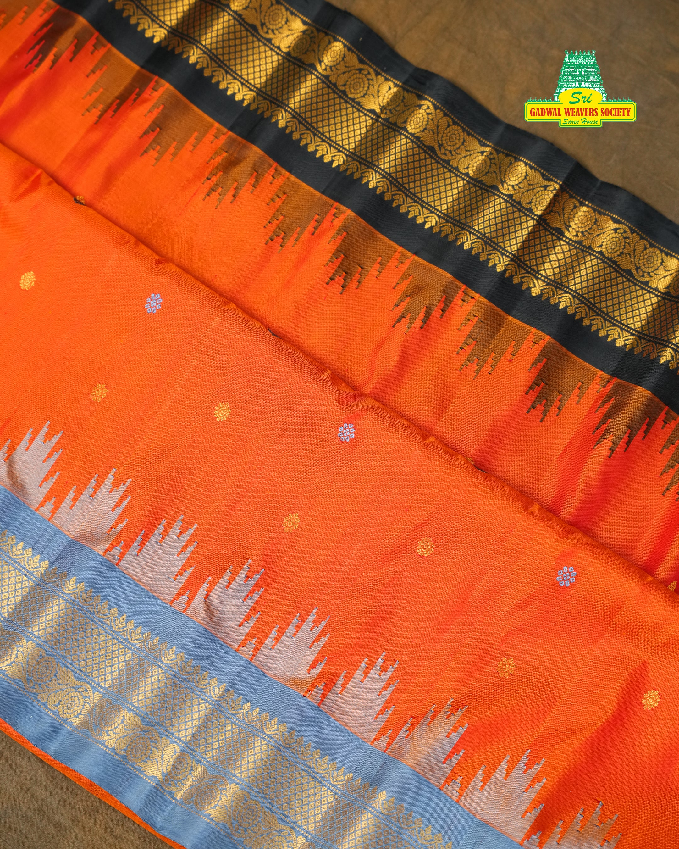 This exquisite Gadwal Pure Silk Handloom Saree showcases timeless elegance with a rich orange body, adorned with delicate gold zari and thread buttas spread evenly across the fabric. The highlight of this masterpiece is its stunning Ganga Jamuna border, featuring contrasting black and grey borders—each embellished with intricate gold zari temple motifs and floral patterns. Woven by skilled artisans, this saree embodies the grace of traditional handloom weaving, perfect for weddings, festivals, and grand occasions. Comes with a contrast blouse, and is Silk Mark certified for authenticity.