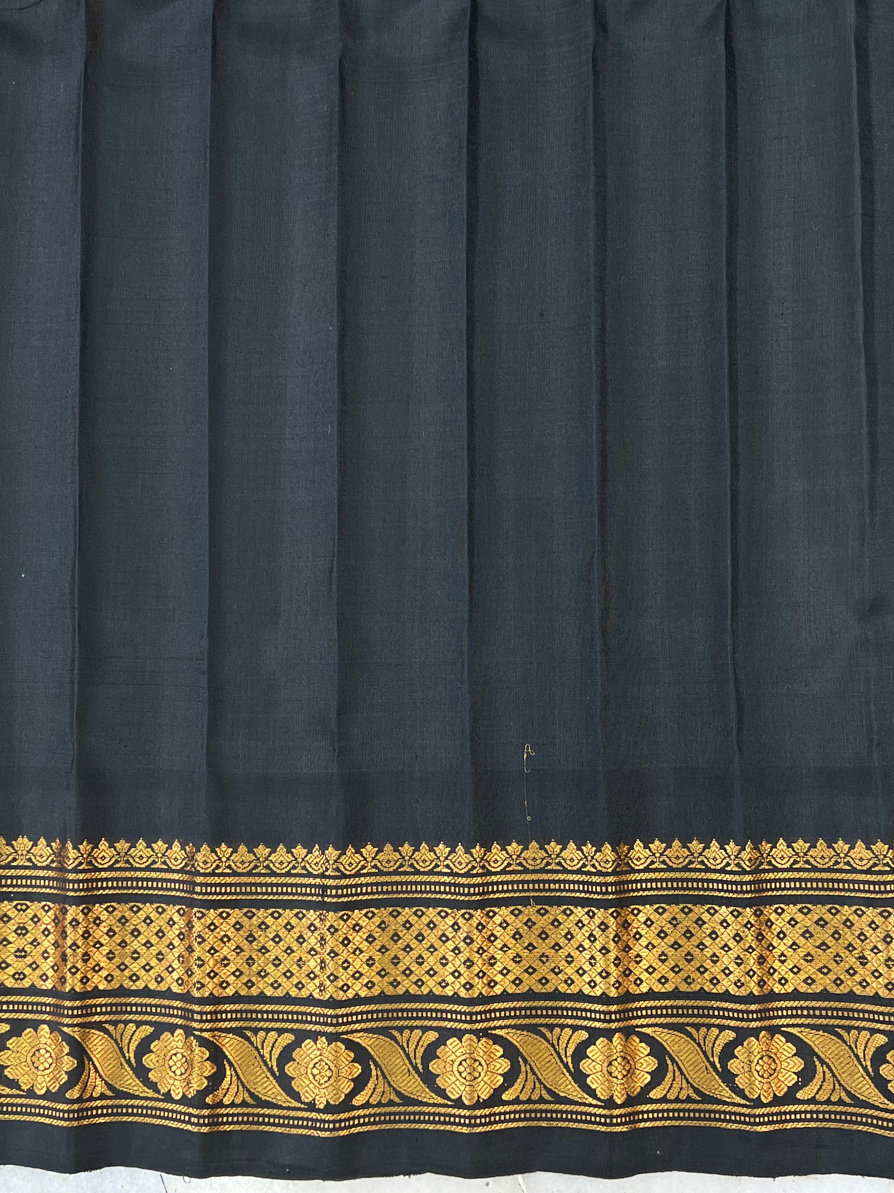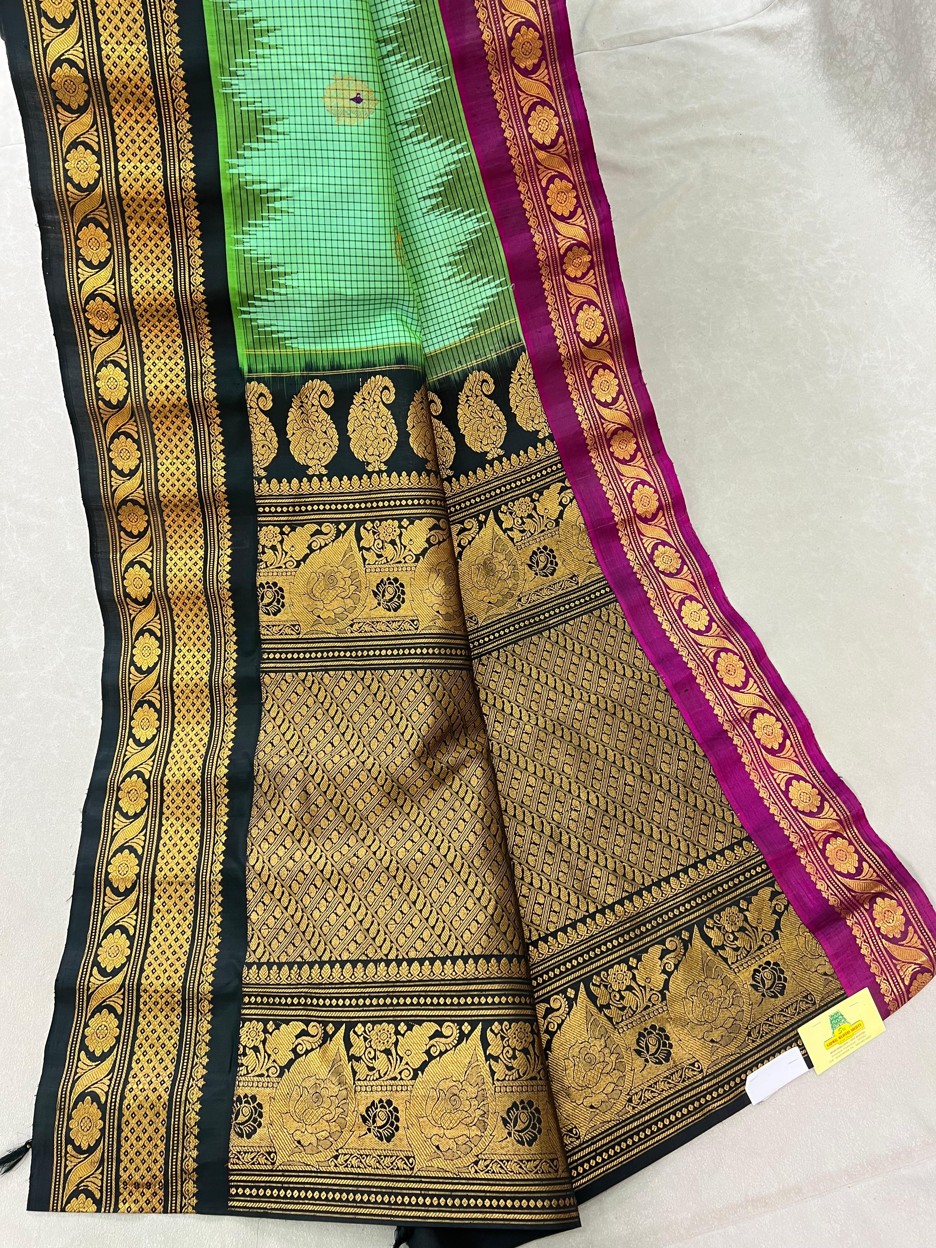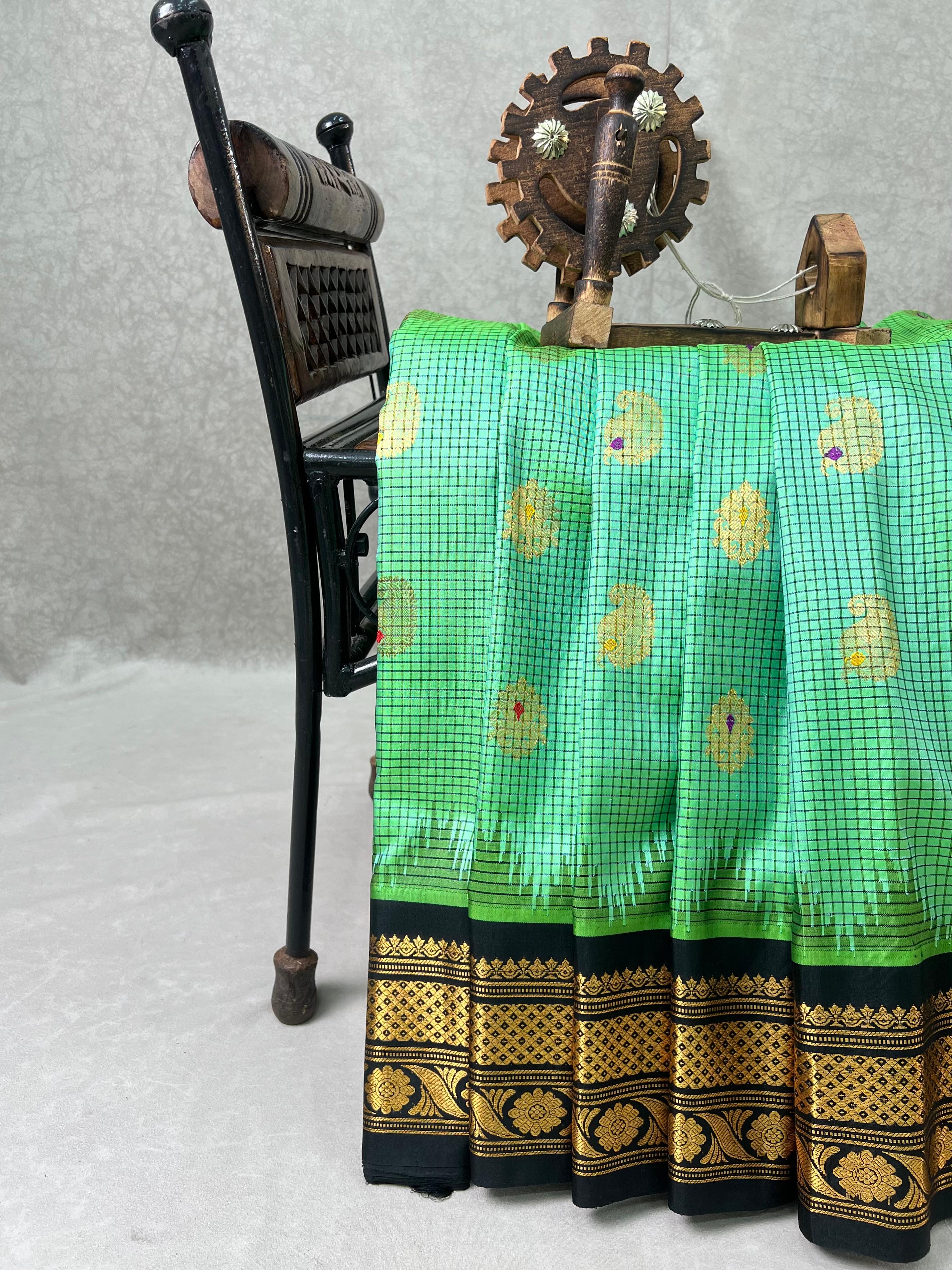 This exquisite Gadwal Pure Silk Handloom Saree showcases timeless elegance with a pista green body, adorned with delicate checks and gold zari meena buttas spread evenly across the fabric. The highlight of this masterpiece is its stunning Ganga Jamuna border, featuring contrasting magenta and black borders—each embellished with intricate temple motifs and gold zari floral patterns. Woven by skilled artisans, this saree embodies the grace of traditional handloom weaving, perfect for weddings, festivals, and grand occasions. Comes with a contrast blouse, and is Silk Mark certified for authenticity.